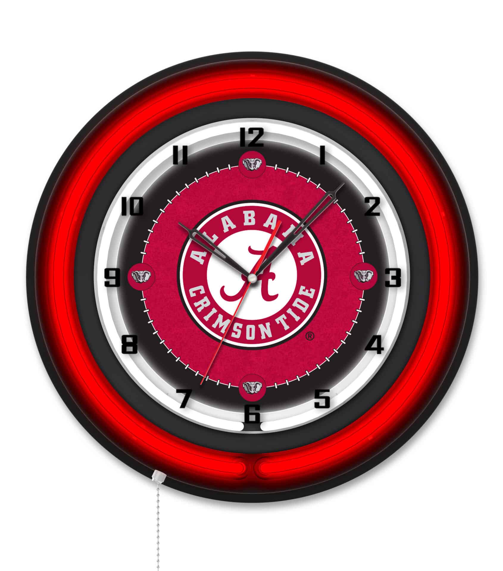The University of Alabama (Script A) 19-Inch Neon Logo Clock in Black is the ideal addition to any man cave, showcasing your school pride in a vibrant and functional way. With its striking black casing and dual neon rings, this clock not only tells time but also serves as a stunning decorative piece. The clock face is illuminated by a brilliant white inner neon ring, making it a captivating sight day or night. The easy-to-use pull chain allows for simple on and off operation, while the accurate quartz movement ensures you always stay on schedule.