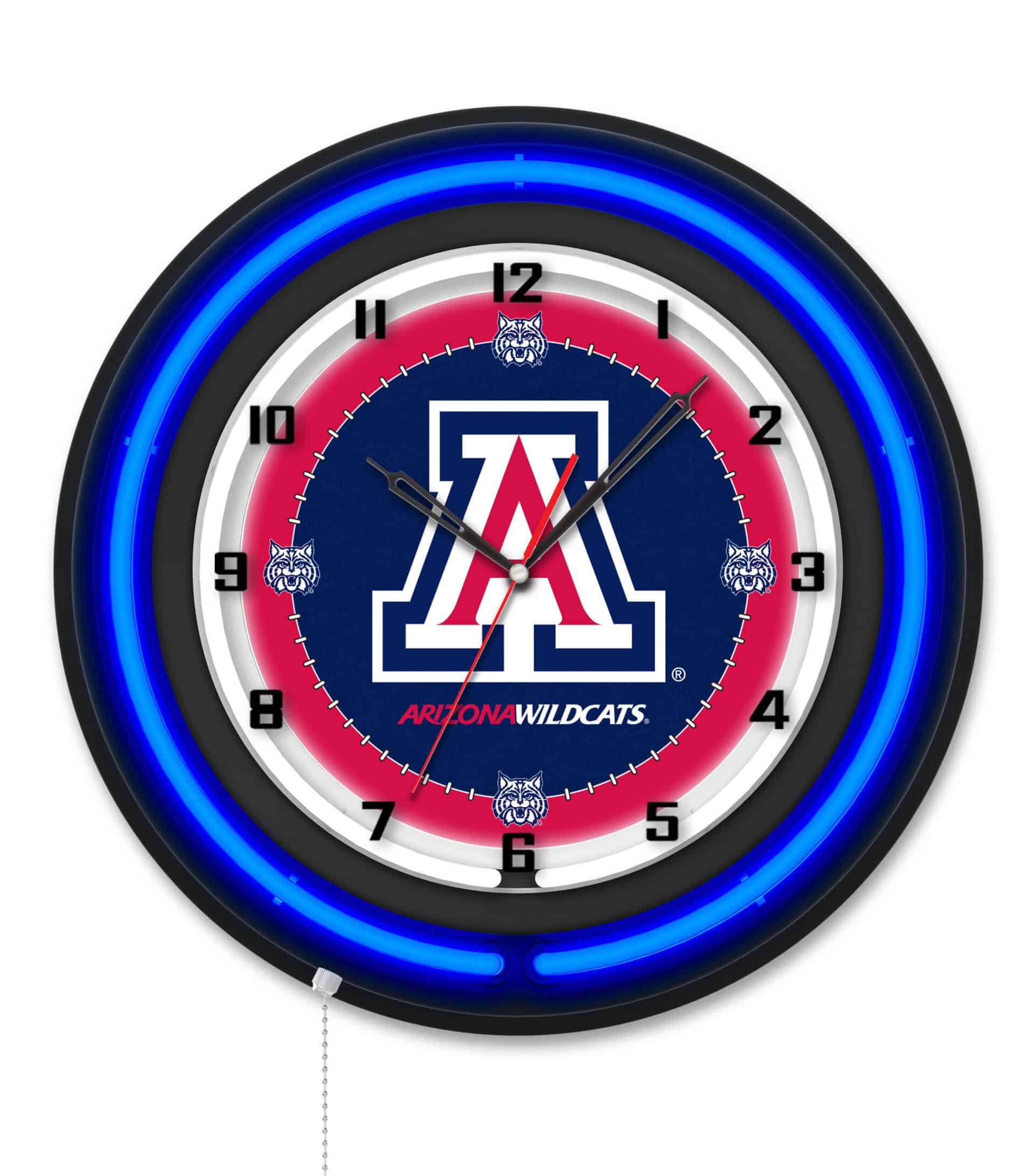 The “University of Arizona 19-Inch Neon Logo Clock in Black” is the perfect addition to any fan’s collection, combining style and functionality. This eye-catching clock features a black casing with a vibrant neon outer ring that showcases your school pride. The brilliant white inner neon ring illuminates the custom printed clock face, creating a stunning visual effect. With easy operation via a pull chain and reliable quartz movement, this clock not only keeps time accurately but also adds a bold statement to your man cave or game room.
