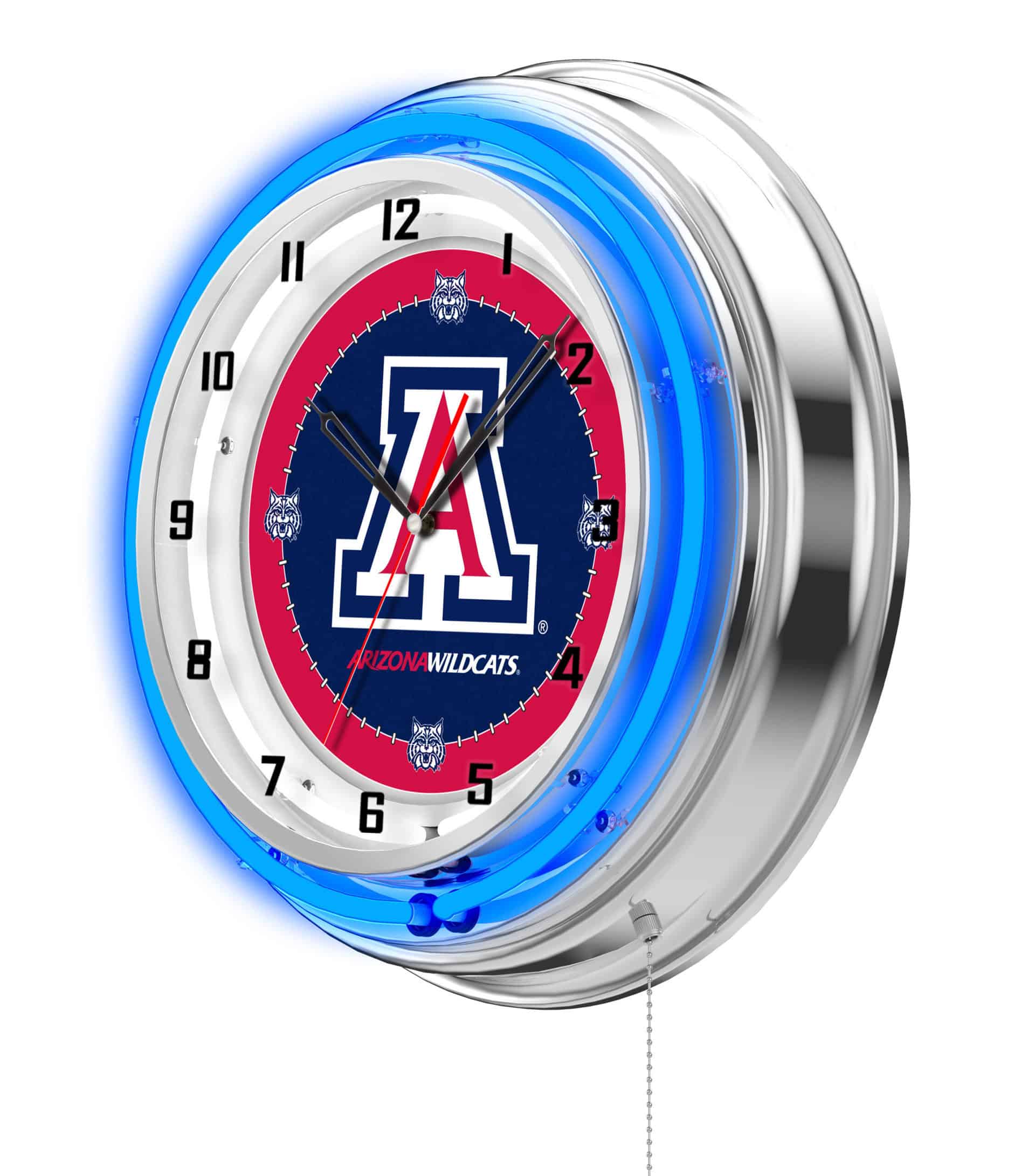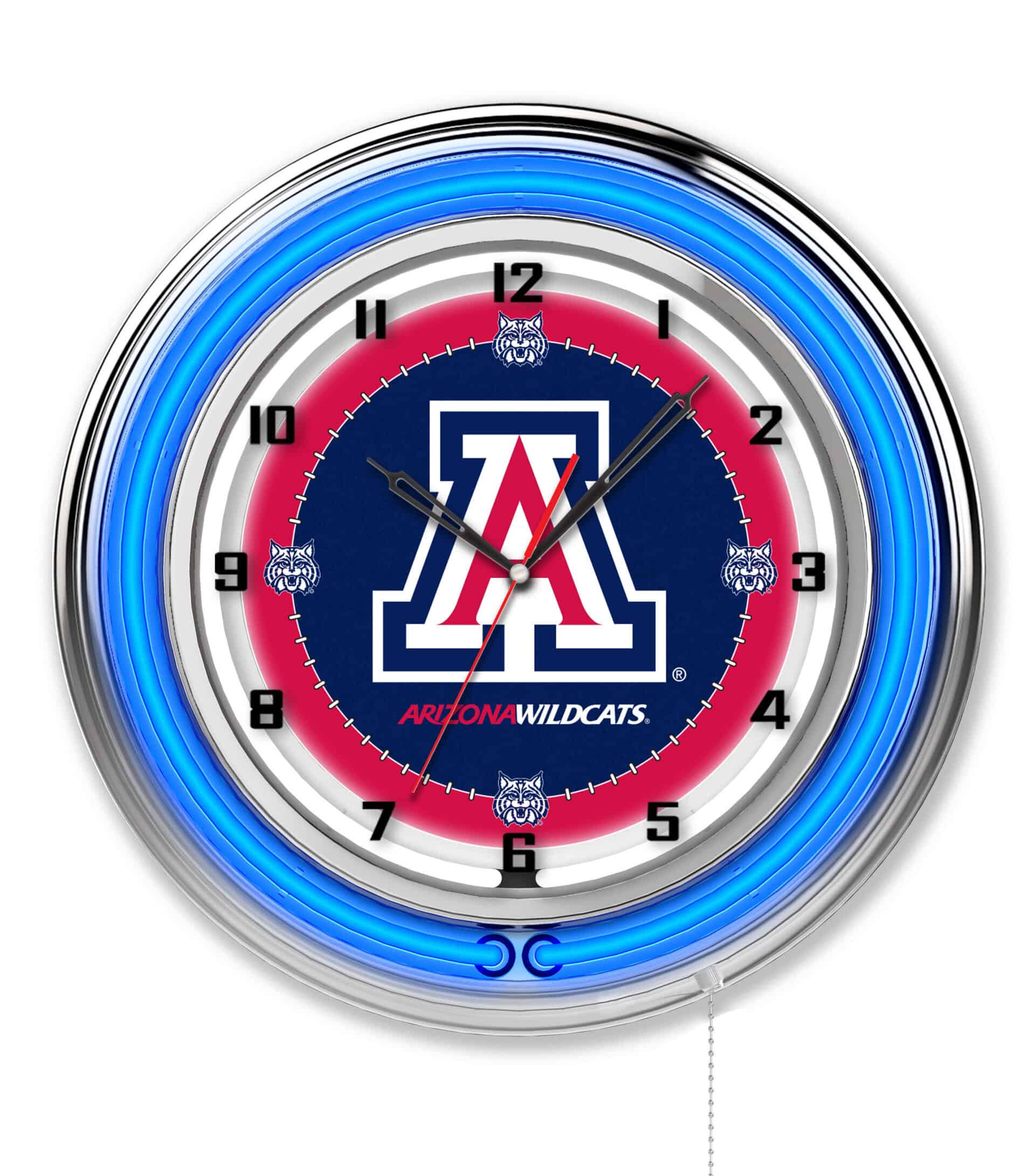 The University of Arizona 19-Inch Neon Logo Clock in Chrome is the perfect addition to any man cave, showcasing your school pride in style. Featuring a stunning chrome casing and vibrant neon rings, this clock not only serves as a functional timepiece but also as a striking decor piece. The outer neon ring glows in team colors, while the inner ring illuminates the custom printed clock face with brilliant white light. With a simple pull chain for easy on/off operation, this clock is designed for convenience and ease of use. Its accurate quartz movement ensures you’ll always be on time.
