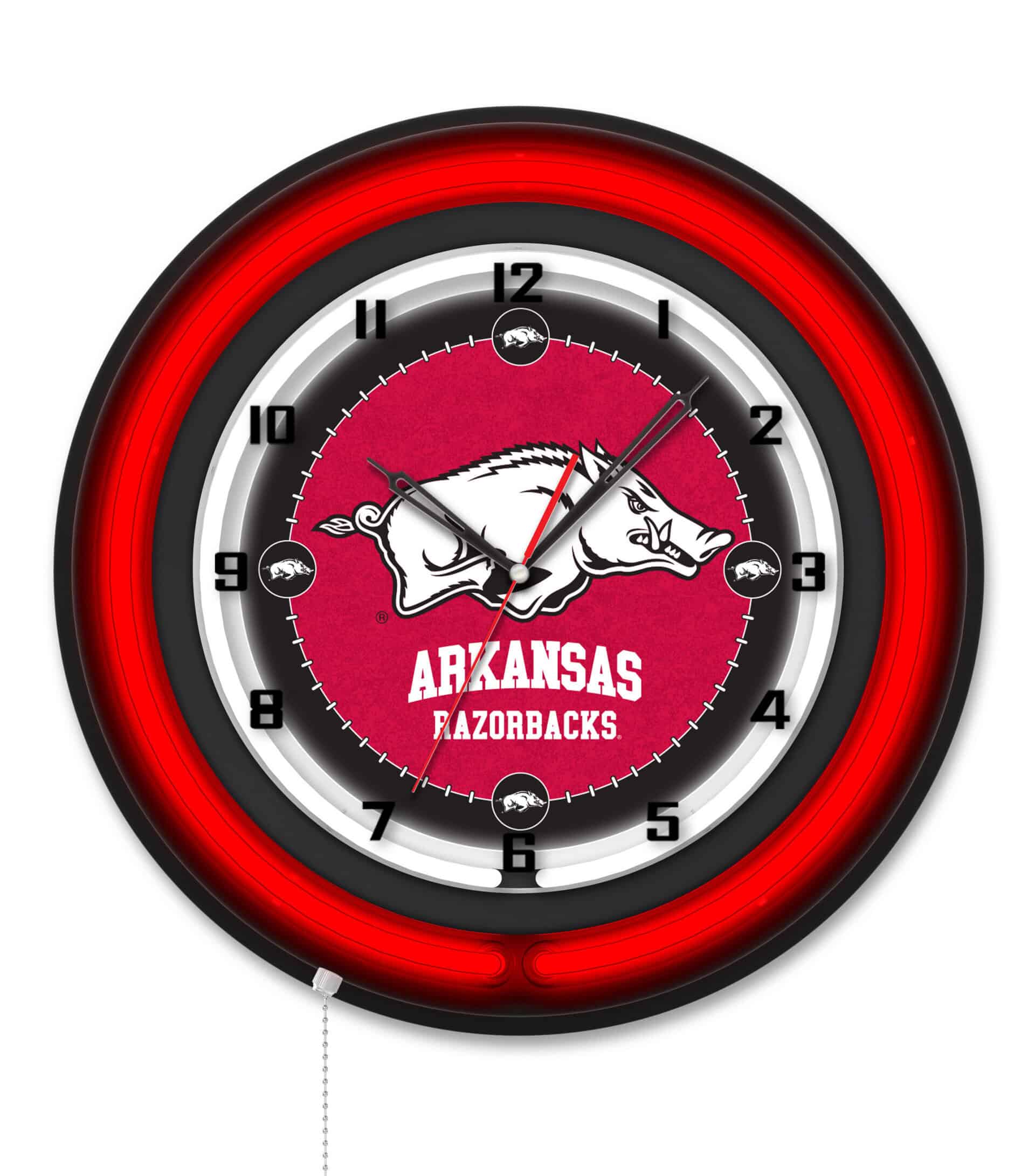 The University of Arkansas 19-Inch Neon Logo Clock in Black is the perfect addition to any fan’s collection, showcasing your school pride in a vibrant and stylish way. This clock features a sleek black casing and a neon outer ring that matches your team’s colors, enhancing the custom printed clock face illuminated by a brilliant white inner neon ring. With a convenient pull chain for easy on/off operation, this clock is powered by a UL Listed transformer for standard 120V outlets, and its accurate quartz movement ensures precise timekeeping, operated by a single AA battery (not included). Ideal as a gift for graduates, sports enthusiasts, or for personal use, this clock combines functionality with a bold display of team spirit.