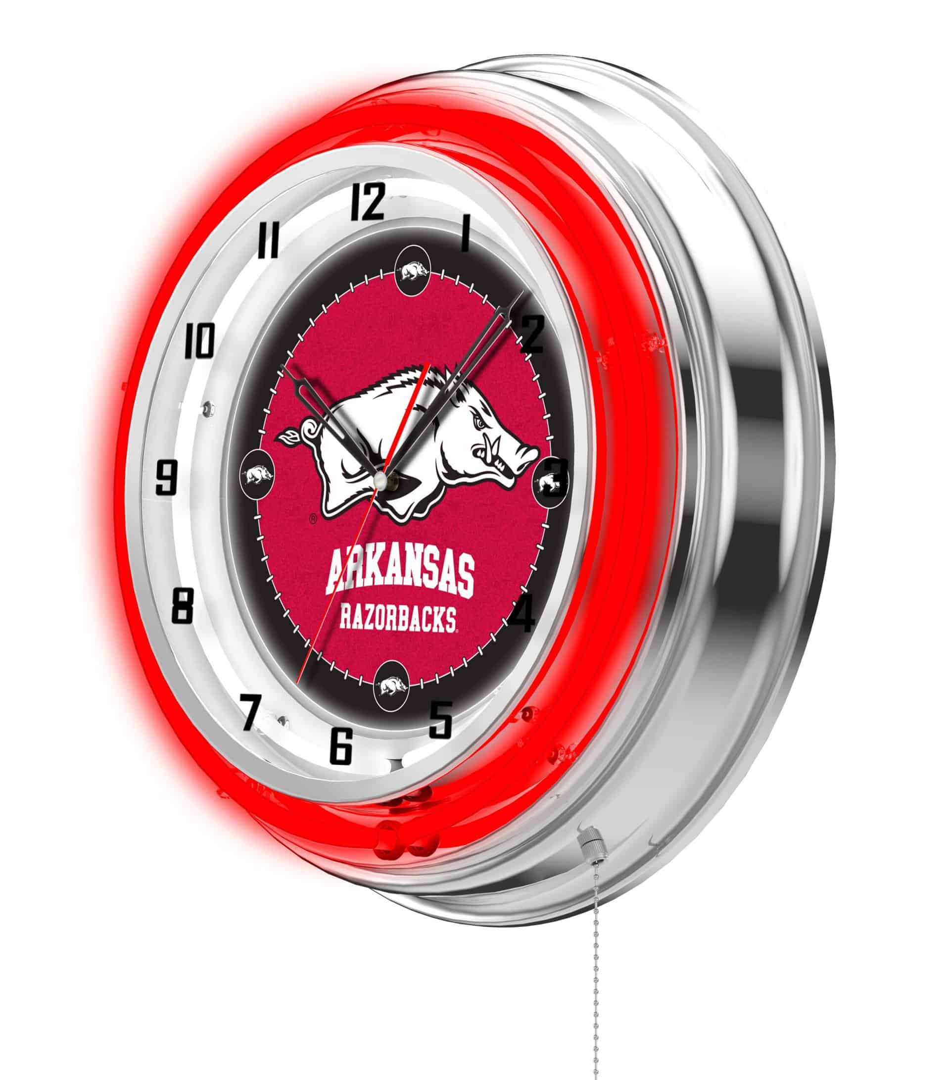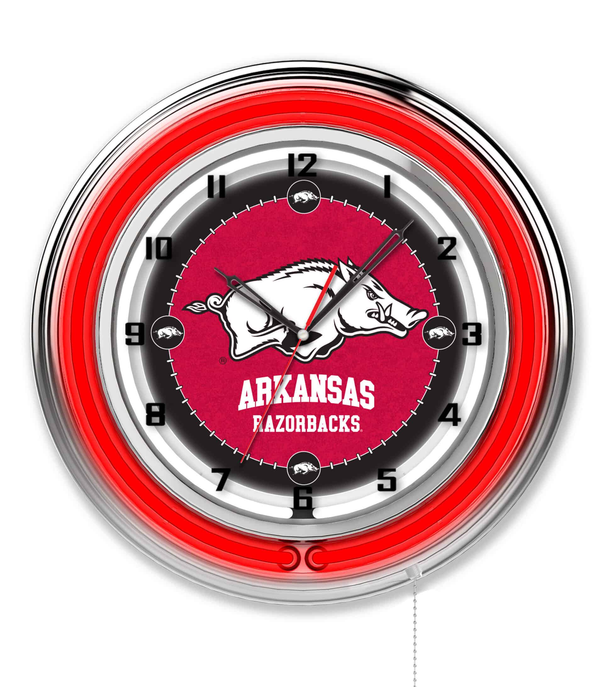 Show your school pride with the University of Arkansas 19-Inch Neon Logo Clock in Chrome. This eye-catching clock features a chrome casing and a vibrant team color-specific neon outer ring that beautifully highlights the custom printed clock face. The brilliant white inner neon ring illuminates the clock, creating a stunning display in any space. The neon rings are conveniently controlled with a pull chain located at the bottom of the clock. Powered by a UL Listed transformer, it connects to a standard 120V outlet, while the accurate quartz movement ensures you always have the right time. This clock is an excellent gift for recent graduates, sports enthusiasts, or as a stylish addition to your own space.