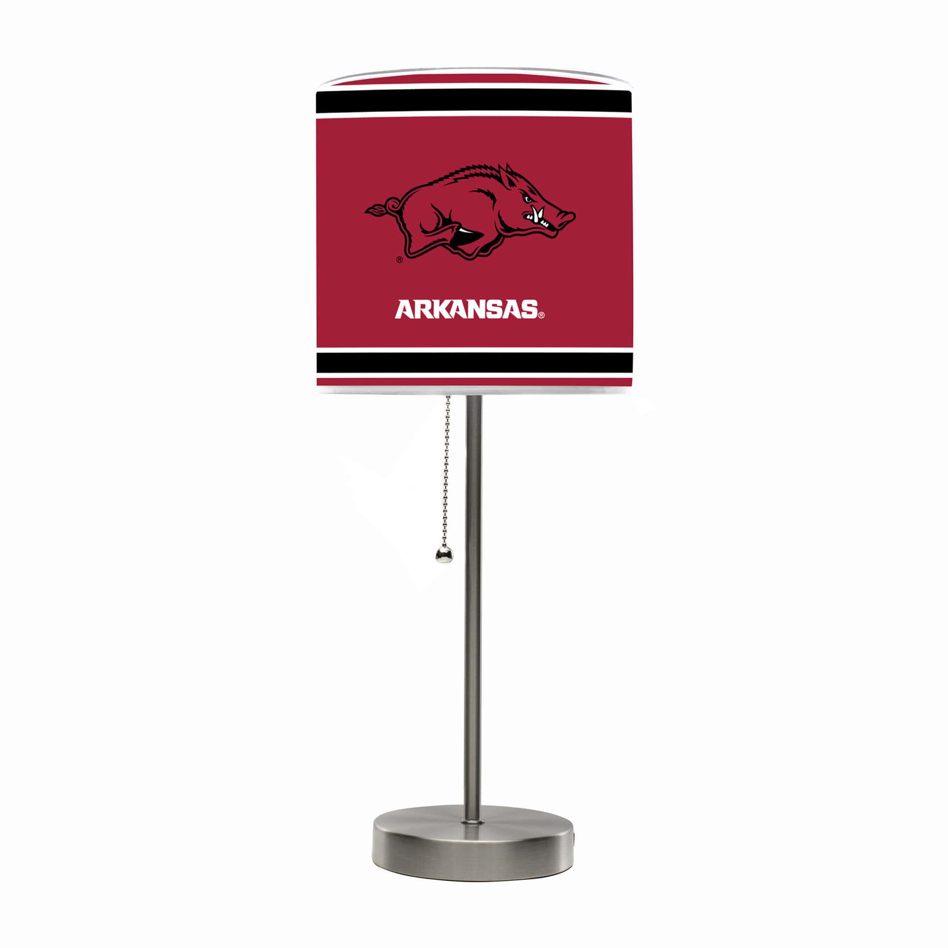 Show off your Razorbacks pride with this University of Arkansas Chrome Lamp. This lamp is perfect for your fan cave, office, or living room. The dimensions are 8 x 8 x 19 inches, and it weighs 3 lbs. It’s made of metal and plastic. It has a built-in USB charging station to keep your devices powered up. The lampshade insert features a high-resolution design and is officially licensed by the NCAA. Plus, our patented lamp shade program lets you easily change the look of your room with affordable, stand-alone inserts.
