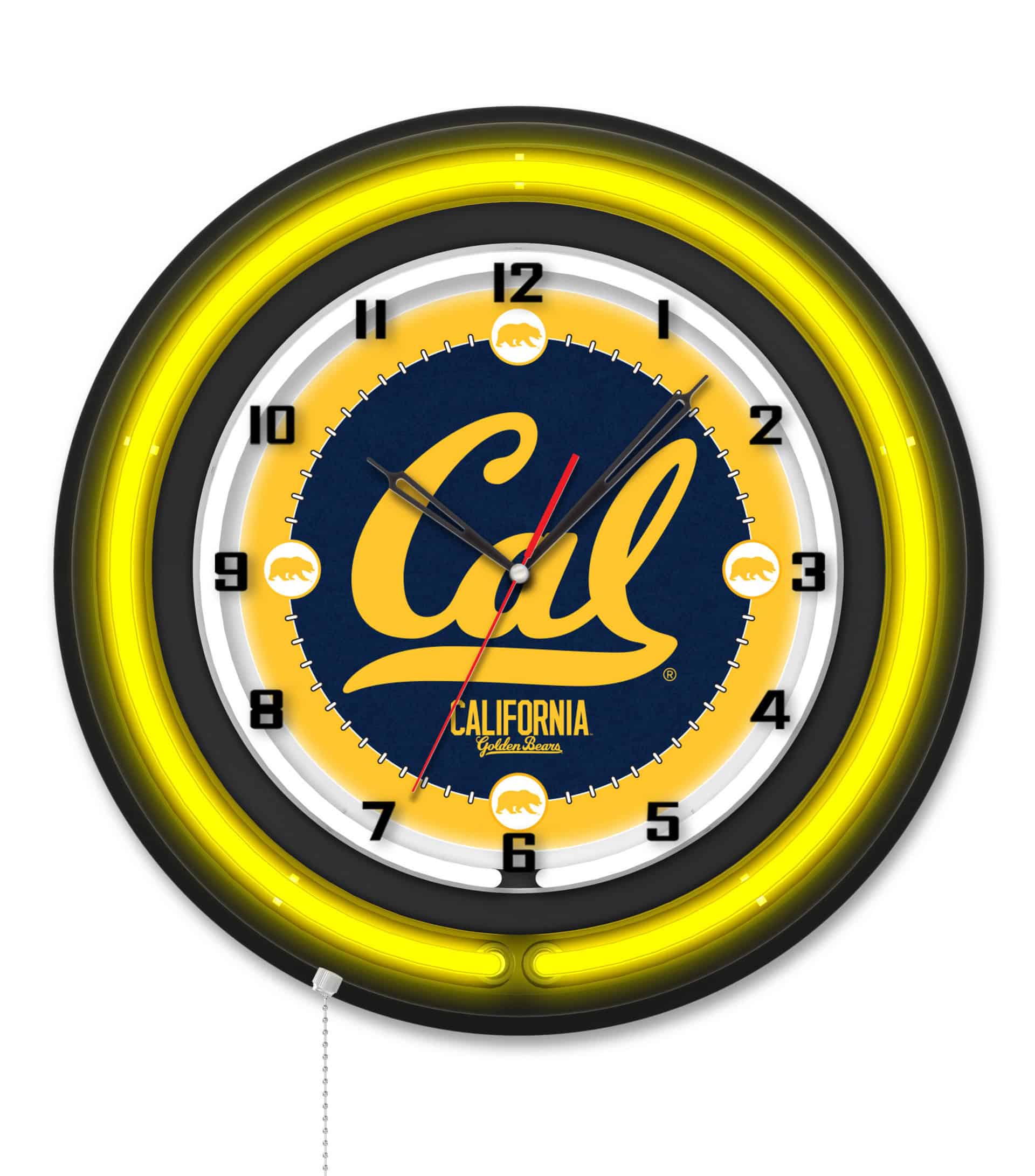 The “University of California 19-Inch Neon Logo Clock in Black is a stunning addition to any man cave or sports-themed room. This clock features a sleek black casing complemented by a vibrant neon outer ring in team colors, enhancing its eye-catching design. The custom printed clock face is illuminated by a brilliant white inner neon ring, making it a standout piece. With a convenient pull chain for easy on/off operation, this clock is powered by a UL Listed transformer that connects to a standard 120V outlet, while an accurate quartz movement ensures precise timekeeping with a single AA battery (not included). Whether you’re gifting it to a recent graduate or treating yourself as a sports super fan, this clock exudes school pride and quality craftsmanship.