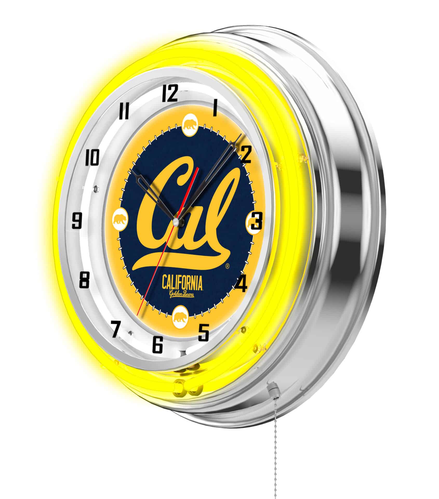 The “University of California 19-Inch Neon Logo Clock in Chrome is the perfect addition to any man cave, showcasing school pride with its vibrant design. This clock features a stylish chrome casing and a neon outer ring in team colors, illuminating a custom printed clock face with a brilliant white inner neon ring. The neon rings can be easily turned on and off using a pull chain for convenience. Powered by a UL Listed transformer, it connects to any standard 120V outlet, while accurate quartz movement ensures precise timekeeping. This clock is not only a great gift for graduates and sports fans but also a stylish decor piece for personal use.