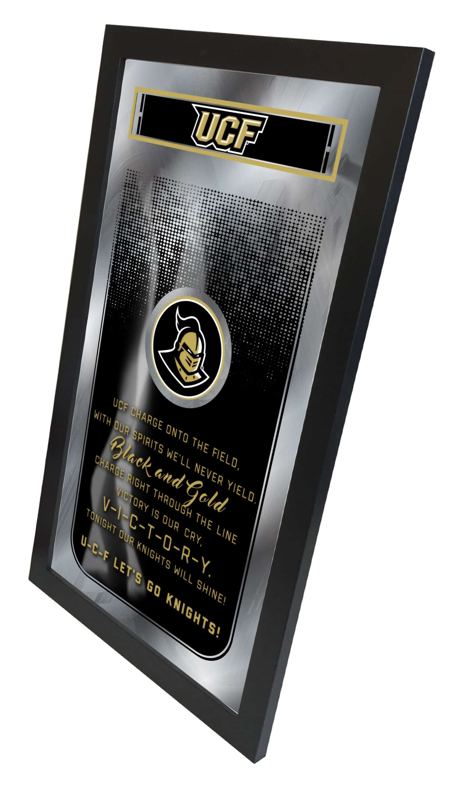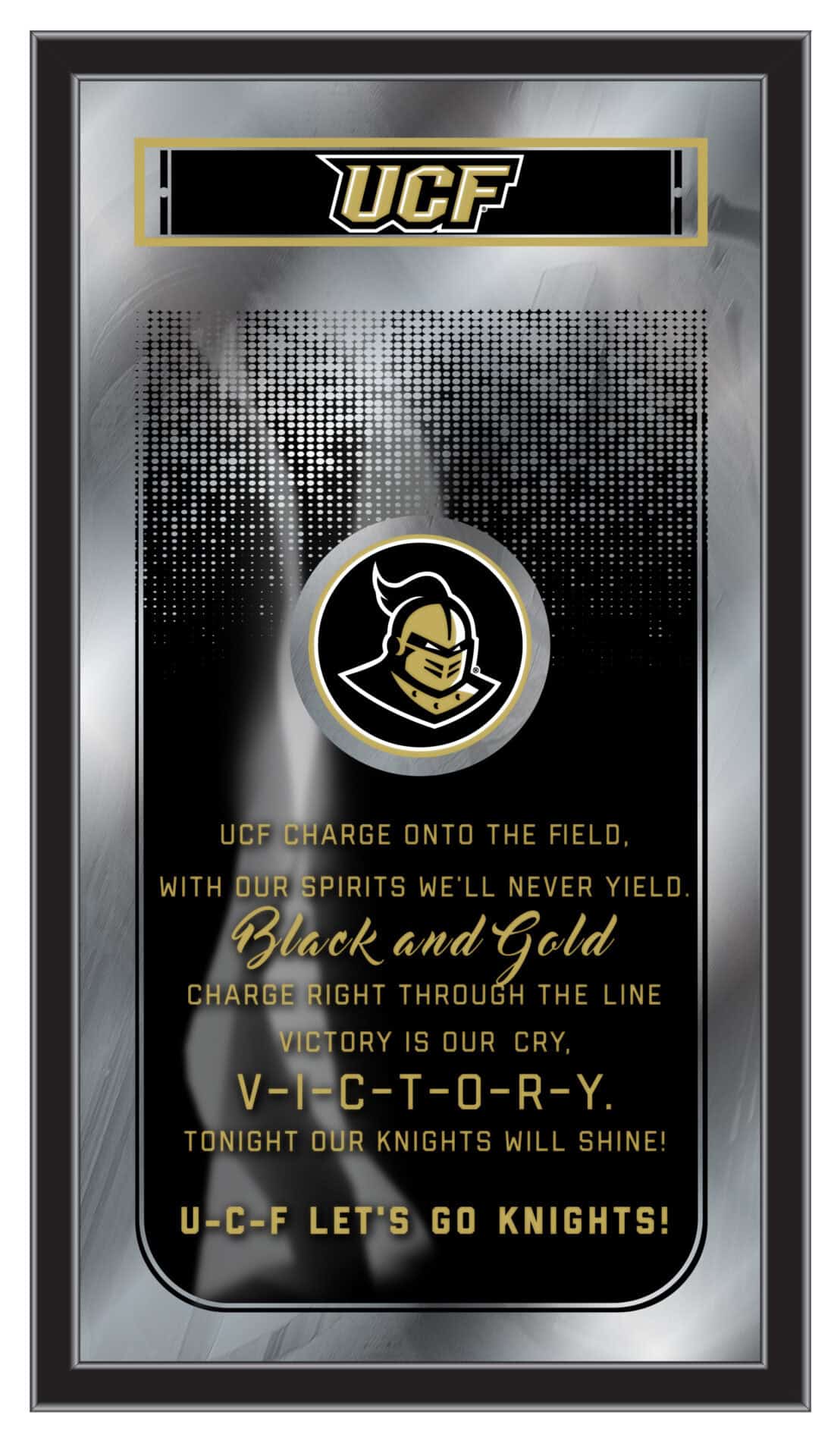 The University of Central Florida 26×15 Fight Song Wall Mirror is the perfect way to showcase your school pride. Featuring vibrant full-color artwork and the iconic fight song lyrics, this mirror enhances any space with its elegant yet simple design. The 1/8″ thick glass and mirrored accents make the colors pop, while the black 1 1/4″ wrapped wood frame adds a touch of sophistication. Ideal for your office, garage, or any room in the house, this mirror also makes a fantastic gift for graduates or sports enthusiasts.