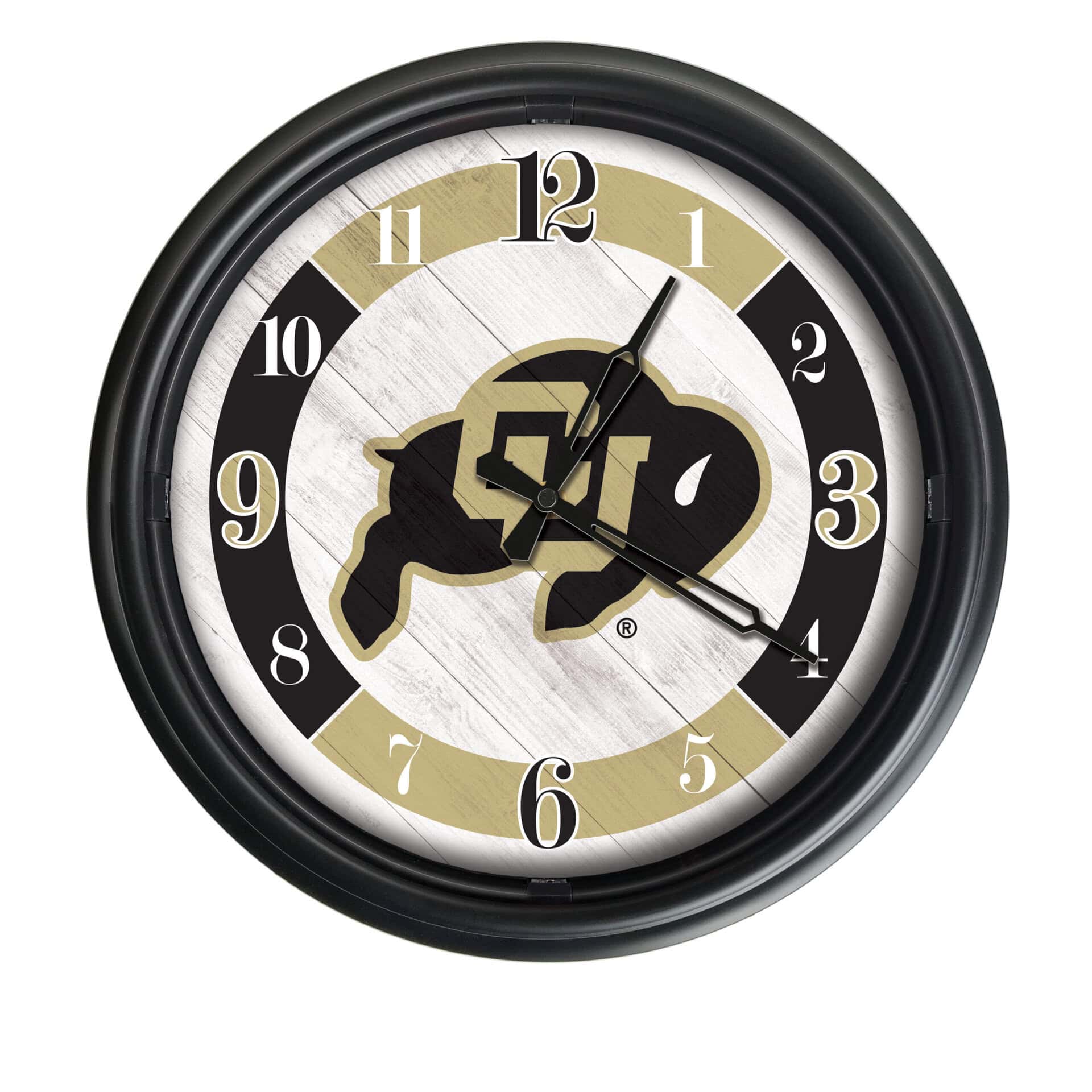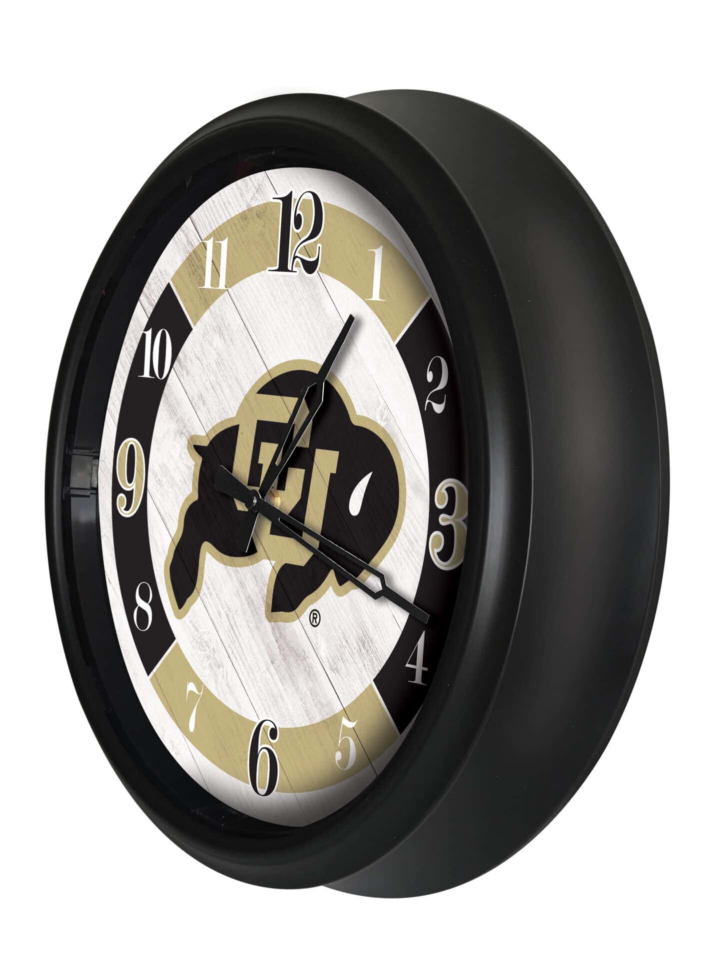 The University of Colorado 14-Inch Indoor/Outdoor LED Wall Clock in Black is the perfect addition to any fan’s collection. This stylish clock showcases vibrant, full-color UV printed artwork, making it an ideal way to display your school pride. Designed for both indoor and outdoor use, it features a fully weather-resistant construction that can withstand the elements. The clock is powered by LED lights that automatically illuminate the clock face at night, ensuring visibility at all times. With its accurate quartz movement and robust design, this clock is not only functional but also a statement piece for your space.