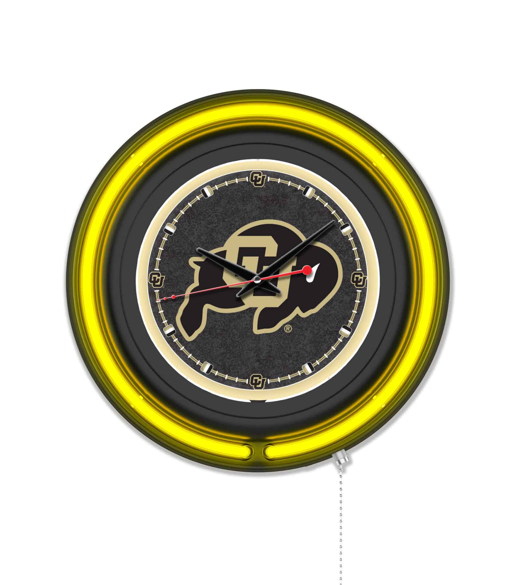 Showcase your school pride with the University of Colorado 15-Inch Neon Logo Clock in Black. This eye-catching clock features a sleek black casing complemented by vibrant neon rings—one in team colors and a brilliant white inner ring that illuminates the custom printed clock face. The double neon tubes create a striking visual impact, perfect for any man cave or game room. Easily control the neon lights with a convenient pull chain, and enjoy accurate timekeeping with quartz movement powered by a single AA battery (not included). This clock makes a fantastic gift for graduates, sports fans, or anyone wanting to add a touch of school spirit to their space.