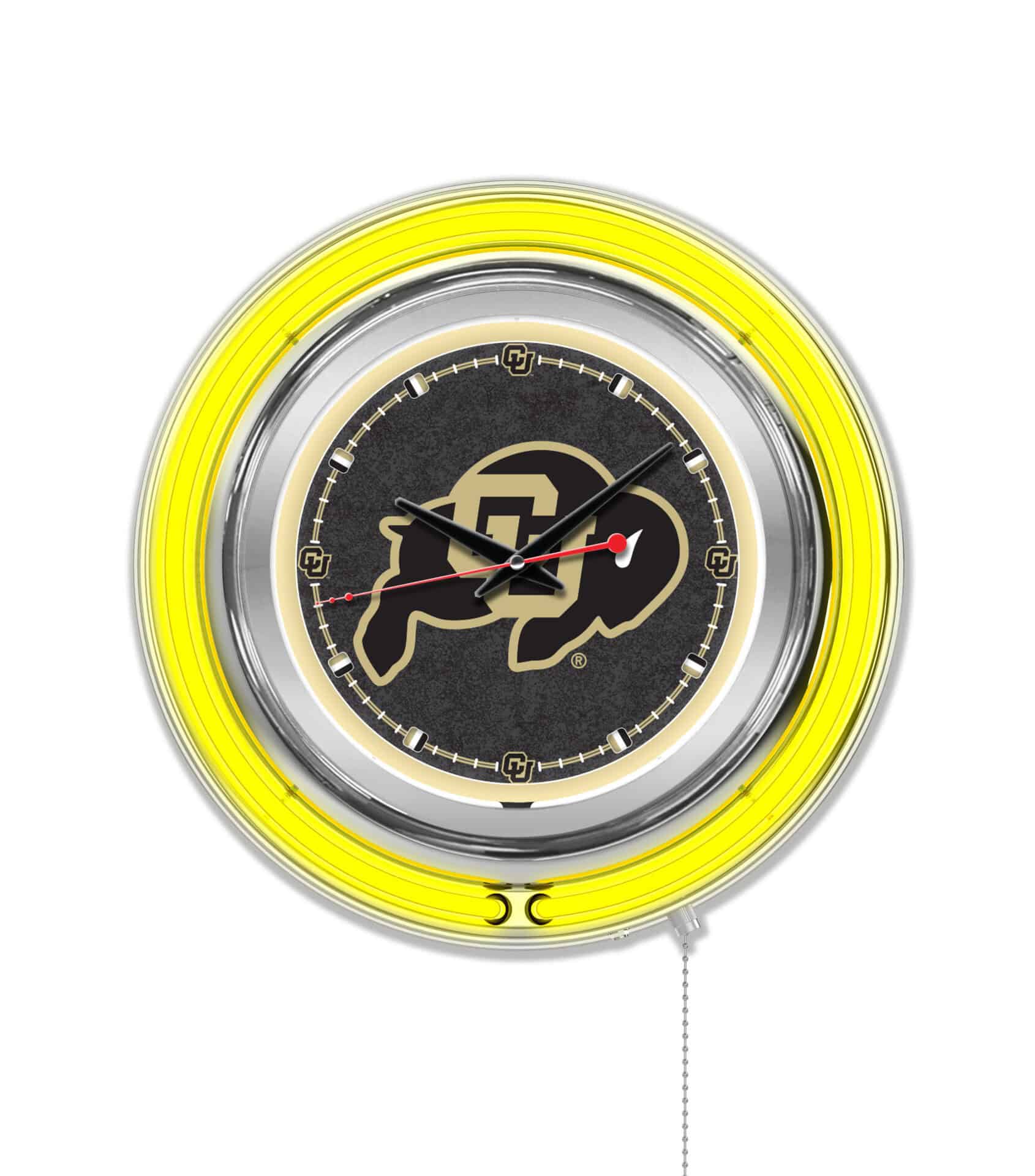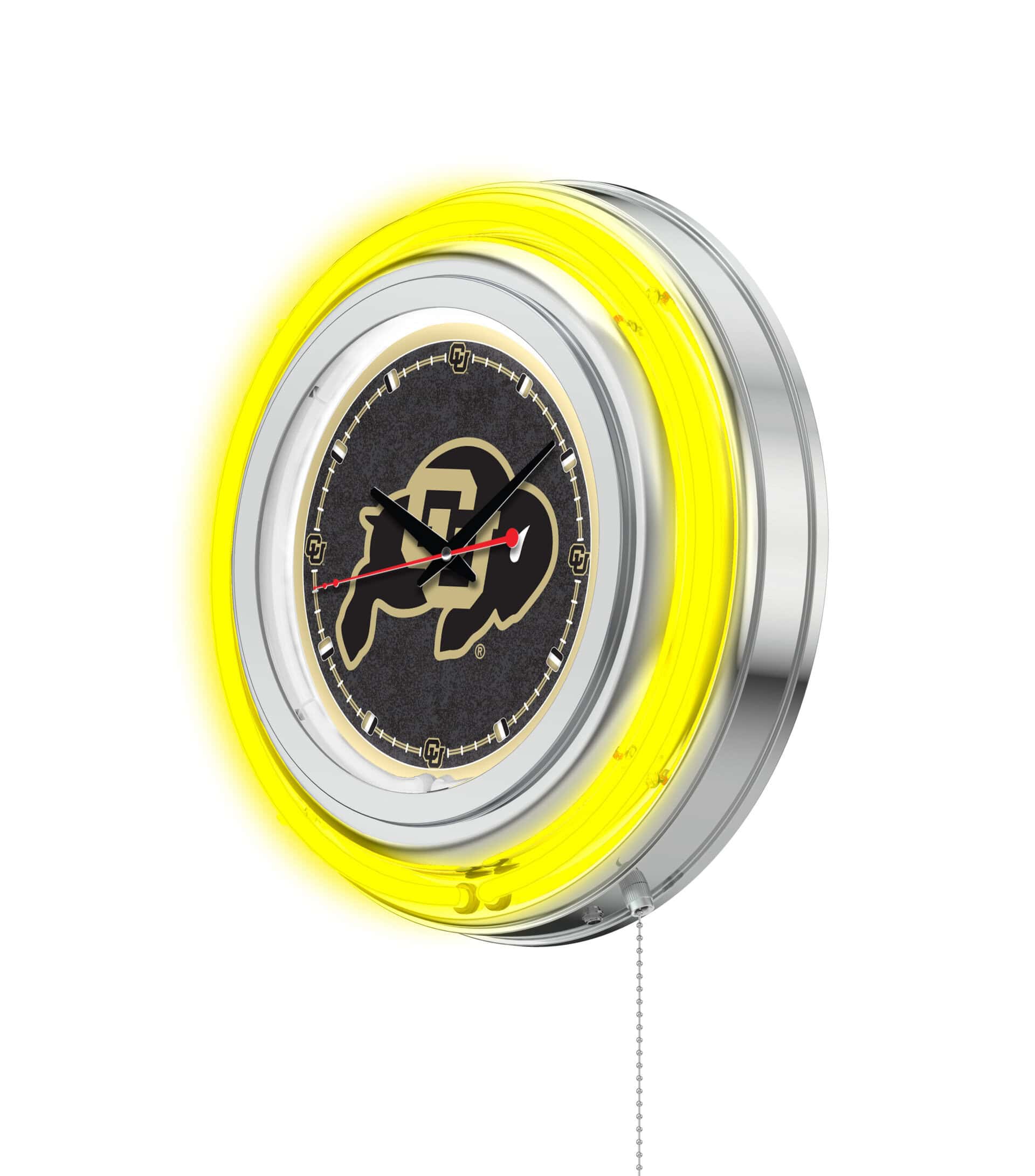 Show your school pride with the University of Colorado 15-Inch Neon Logo Clock in Chrome. This eye-catching clock features a sleek chrome casing and a vibrant neon outer ring in team colors, complemented by a custom-printed clock face illuminated by a brilliant white inner neon ring. The neon rings are easily controlled with a pull chain and powered by a UL-listed transformer, ensuring safety and convenience. With accurate quartz movement and a stylish design, this clock is perfect for graduates, sports fans, or anyone looking to add a touch of team spirit to their space.