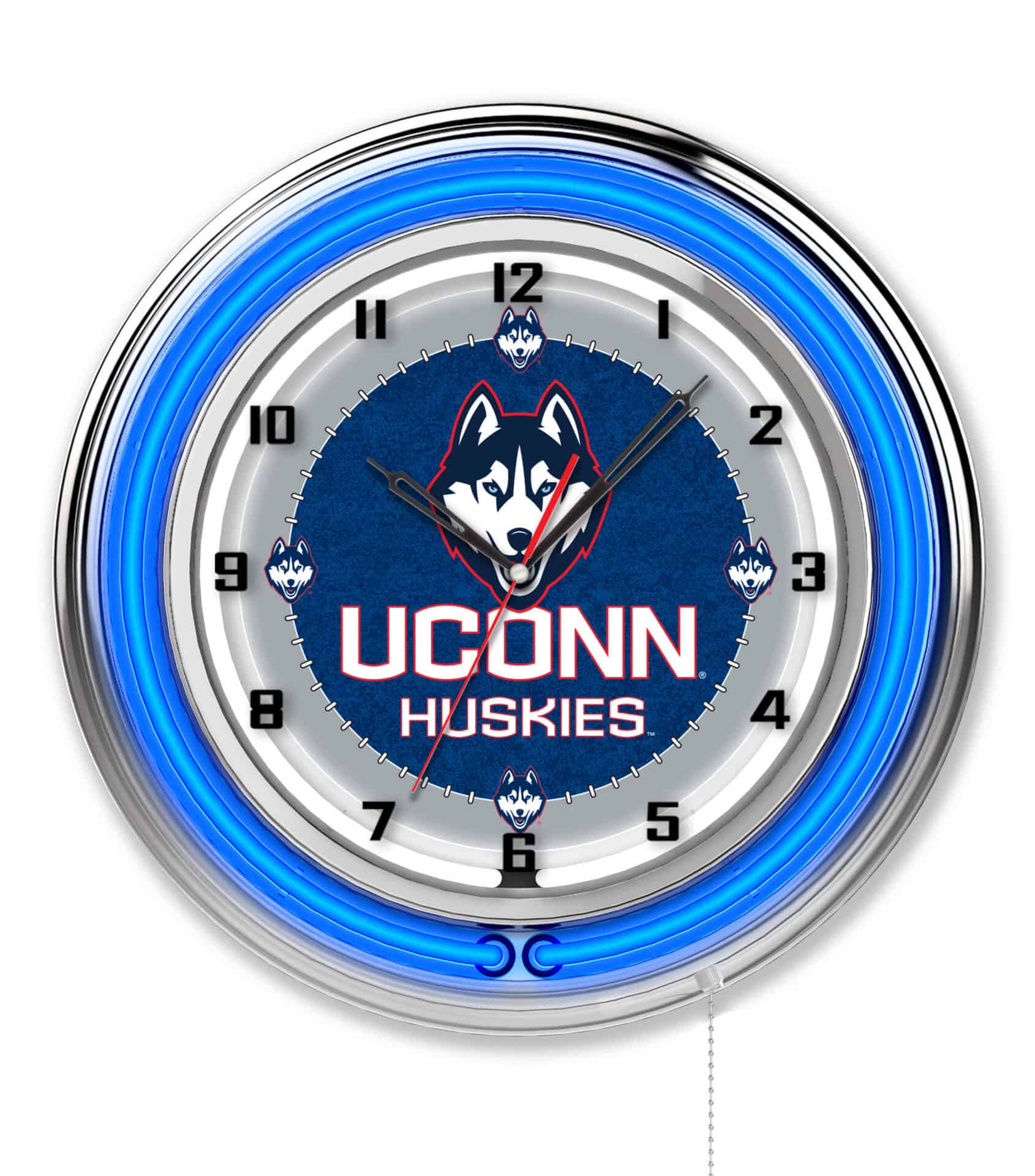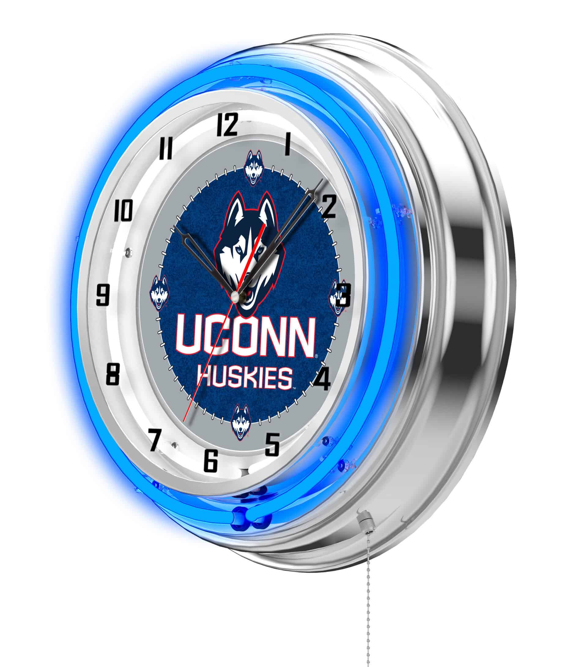 The University of Connecticut 19-Inch Neon Logo Clock in Chrome is an eye-catching addition to any man cave, showcasing your school pride with vibrant neon accents. This clock features a stylish chrome casing and a custom printed clock face illuminated by a brilliant white inner neon ring. The neon rings can be easily activated or deactivated using a convenient pull chain at the bottom. With accurate quartz movement, this clock ensures precise timekeeping and is powered by a single AA battery (not included). Perfect as a gift for graduates, sports fans, or as a personal treat, this clock adds a touch of flair and functionality to your space.
