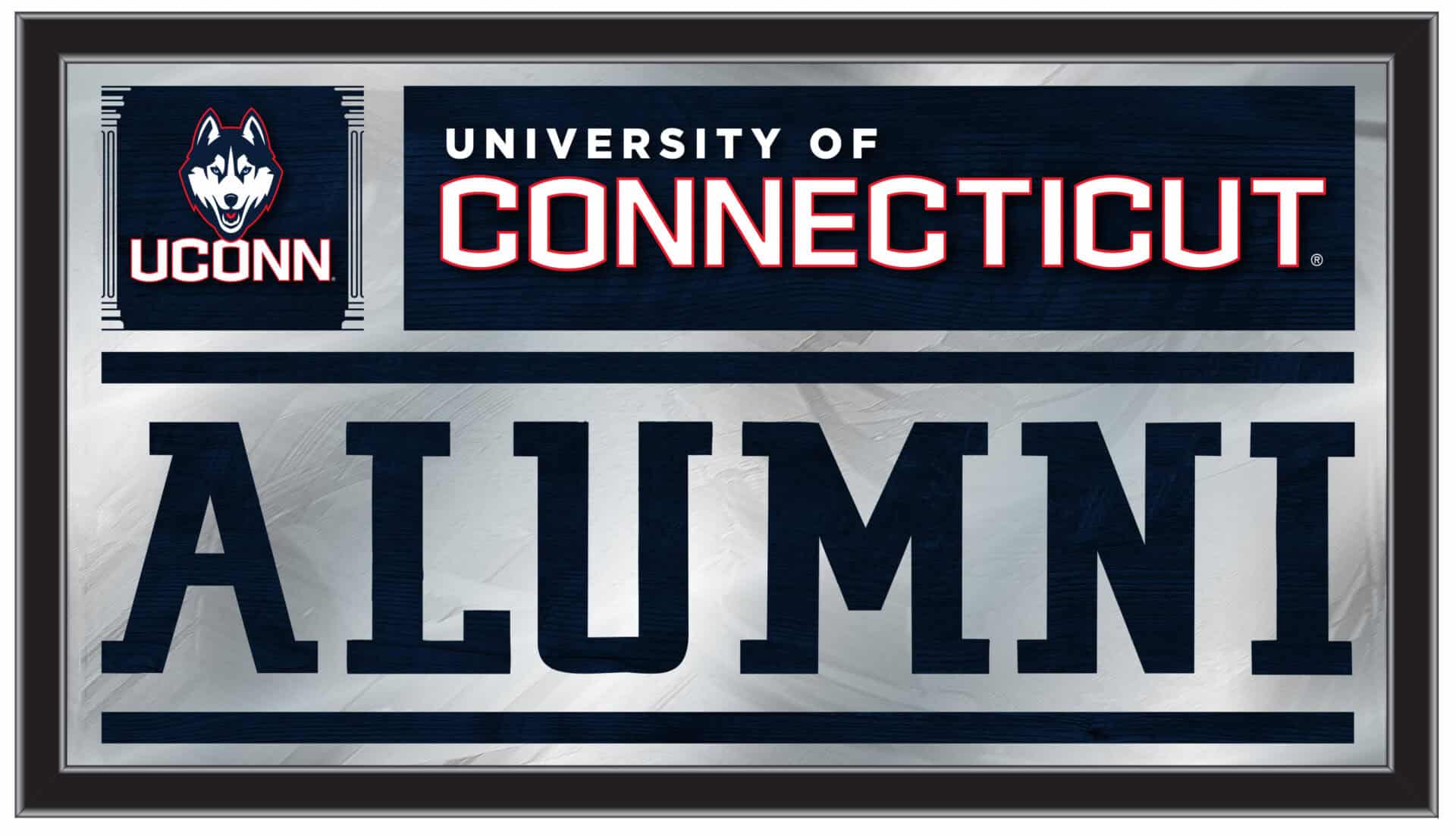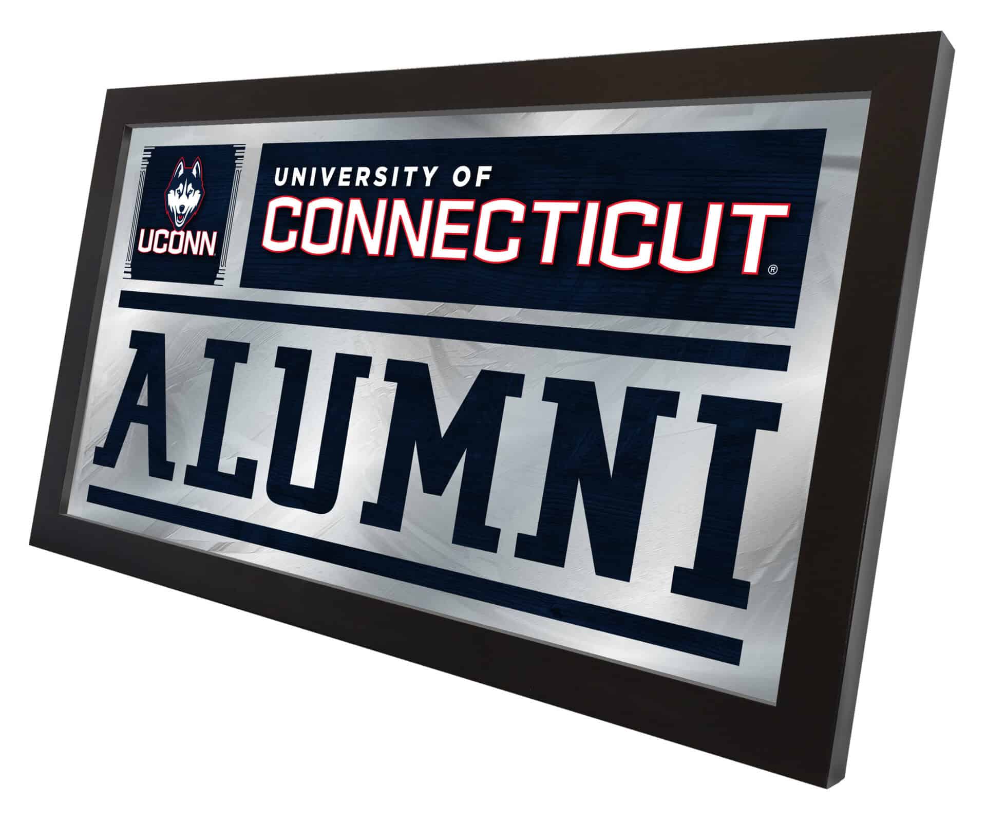 Show your school pride with the University of Connecticut 26×15 Alumni Wall Mirror. With its simple yet elegant design, your school colors come alive through the 1/8″ thick glass, beautifully highlighted by mirrored accents. This mirror is framed with a black, 1 1/4″ wrapped wood frame and features saw tooth hangers for easy installation. Measuring 26 inches in height and 15 inches in width, it’s the perfect addition to your office, garage, or any room in your home. Whether as a gift for a recent graduate or for personal use, you can take satisfaction in its high-quality craftsmanship.