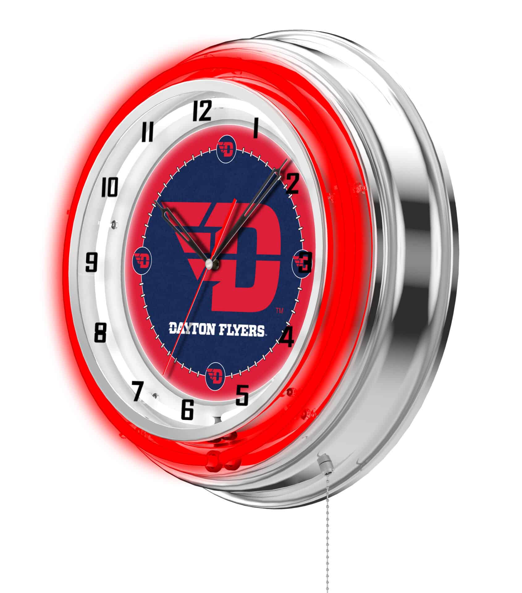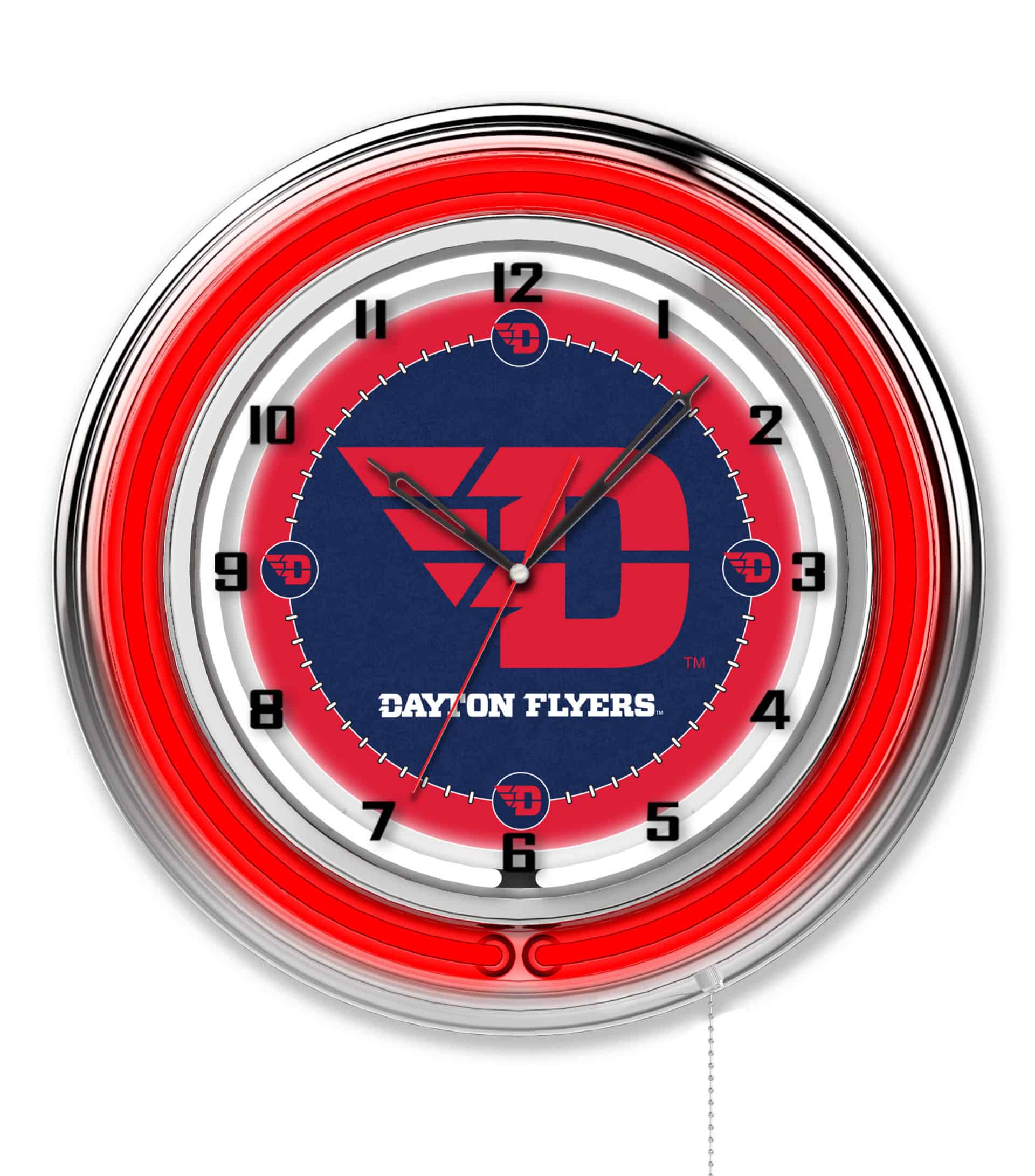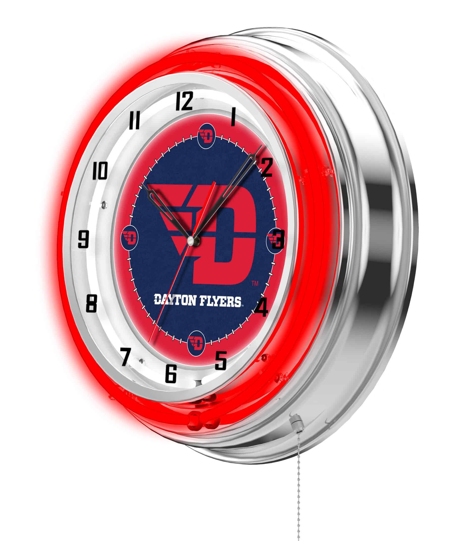 The University of Dayton 19-Inch Neon Logo Clock in Chrome is a stunning addition to any man cave, showcasing your school pride with its vibrant and eye-catching design. Featuring a chrome casing and a neon outer ring in team colors, this clock is not only functional but also a dynamic piece of decor. The brilliant white inner neon ring illuminates the custom printed clock face, ensuring it stands out in any setting. With easy ON/OFF operation via a pull chain and powered by a standard 120V outlet, this clock combines style with convenience. Accurate quartz movement guarantees precise timekeeping, powered by a single AA battery (not included).