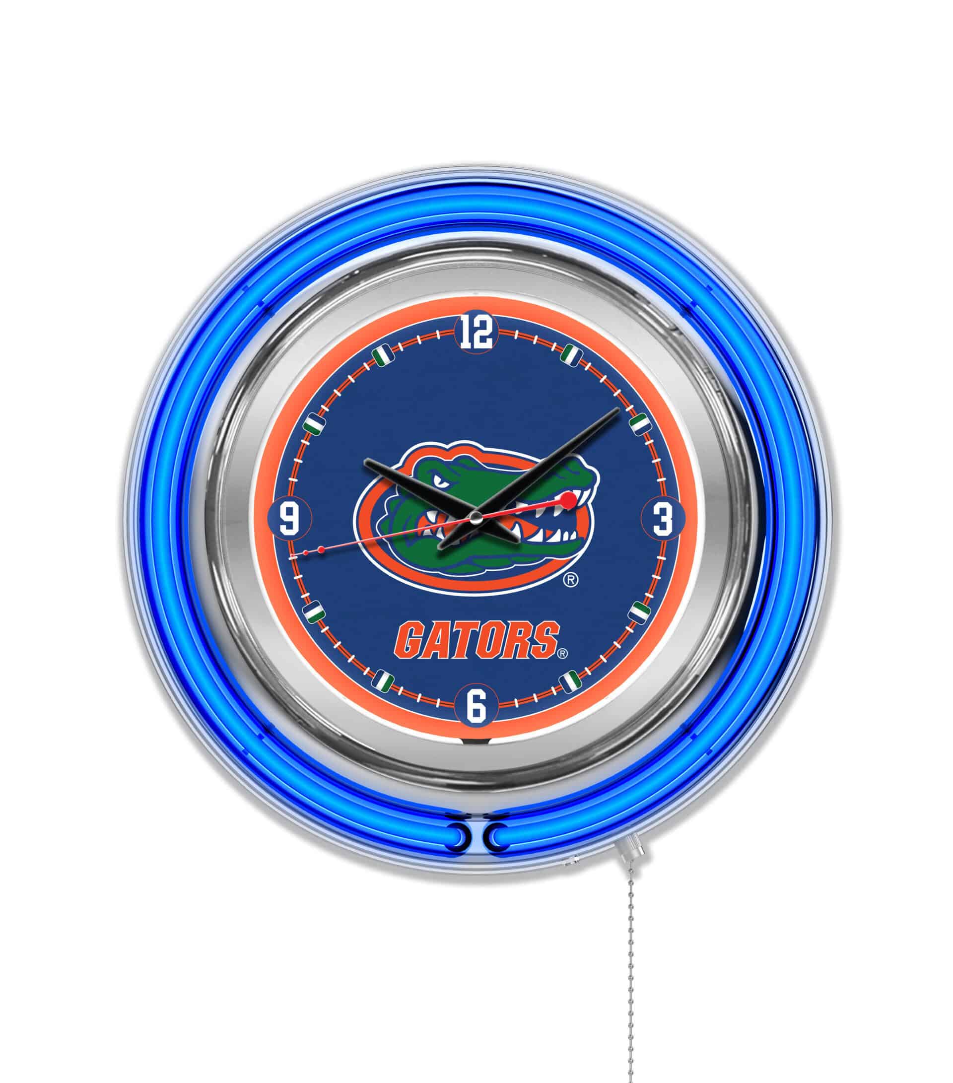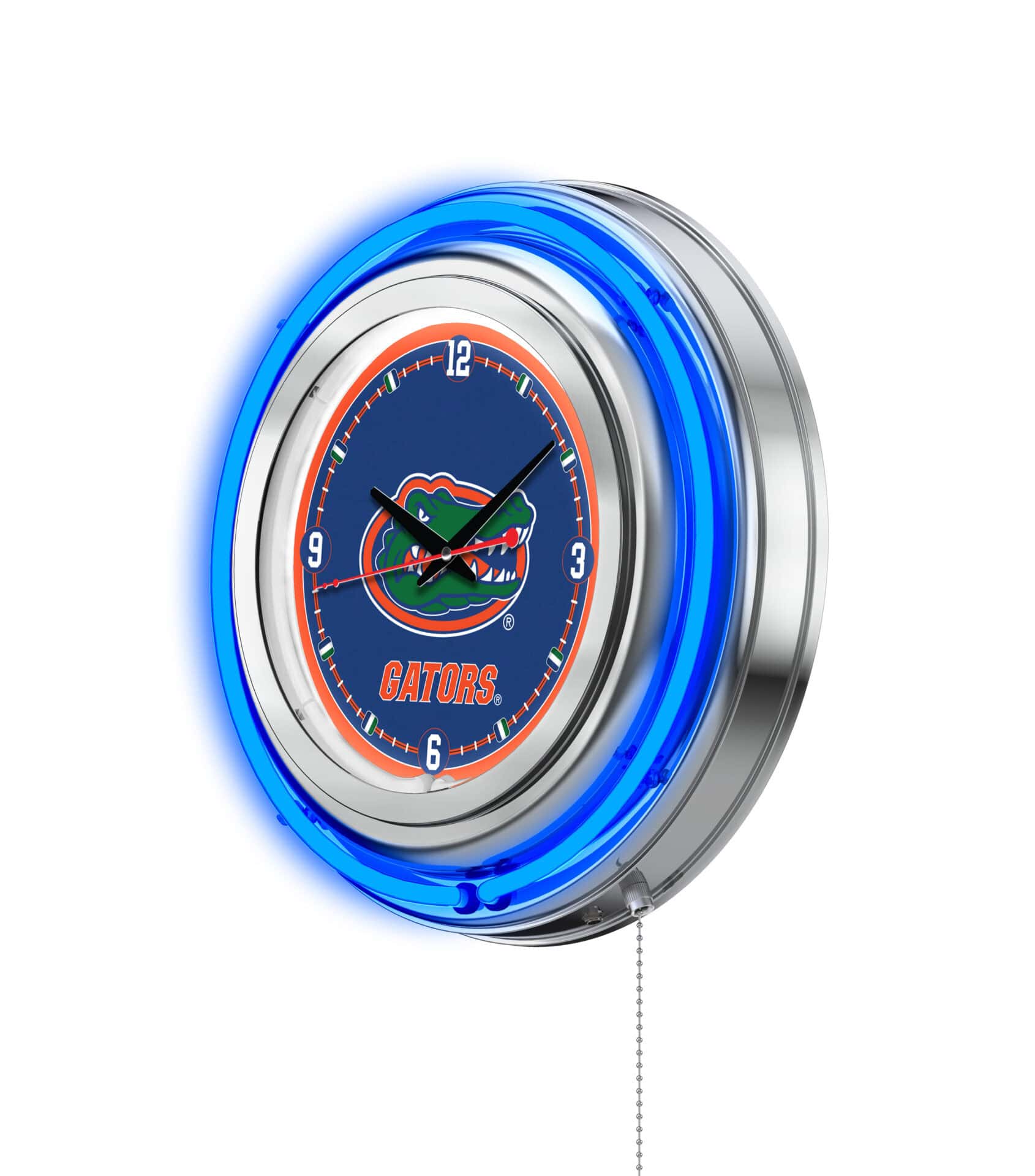 The University of Florida 15-Inch Neon Logo Clock in Chrome is the ultimate decor piece for any fan’s space. With its striking chrome casing and vibrant neon rings, this clock not only tells time but also showcases your school pride. The neon rings illuminate the custom printed clock face, creating a dazzling display that can be easily controlled with a pull chain. Powered by a standard 120V outlet and featuring accurate quartz movement, this clock is both functional and stylish. Perfect as a gift for recent graduates or sports enthusiasts, it’s a great addition to your collection.