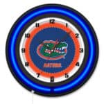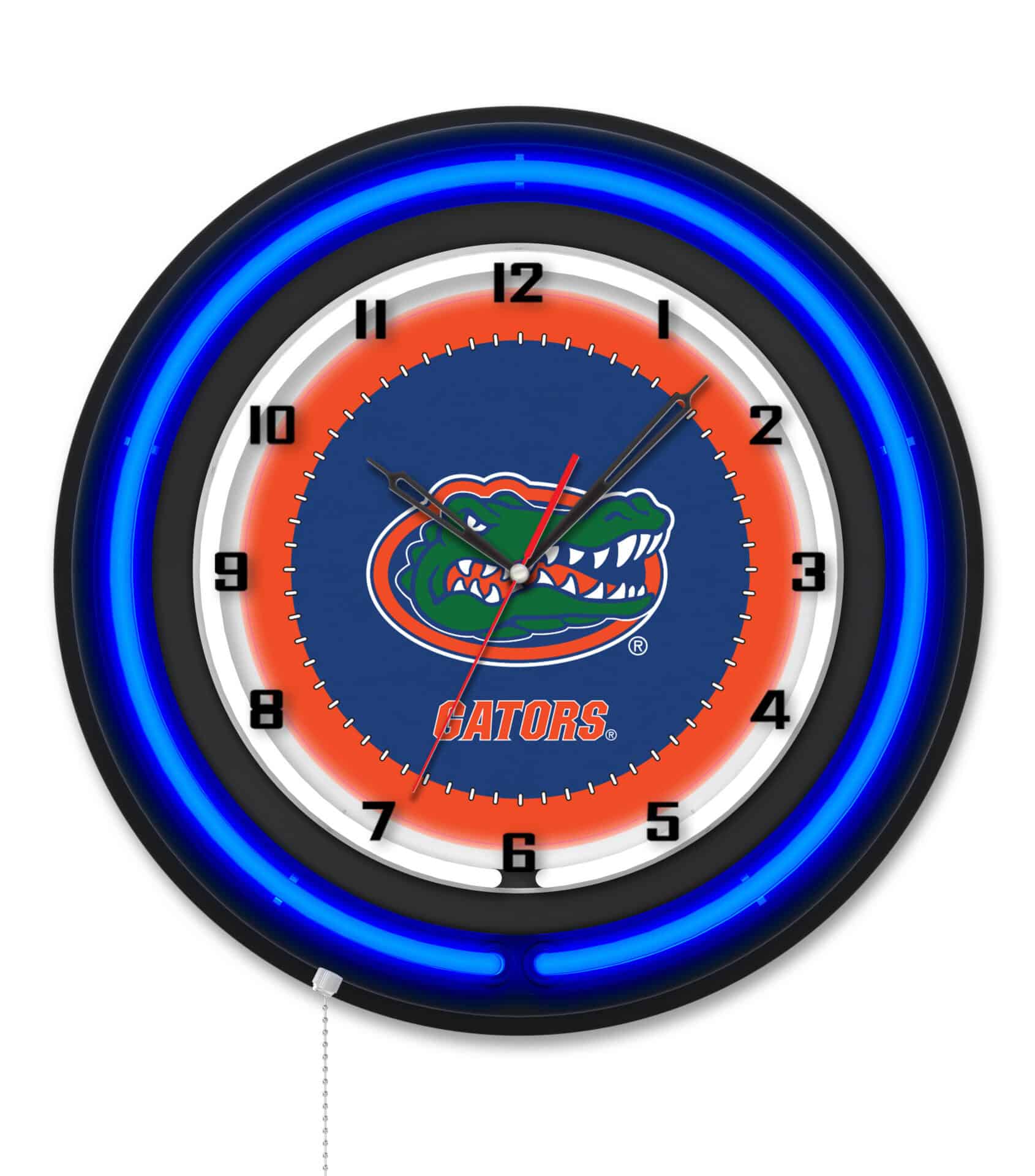 The University of Florida 19-Inch Neon Logo Clock in Black is the ultimate way to showcase your school spirit while keeping track of time. This striking clock features a sleek black casing complemented by vibrant neon accents that illuminate the custom printed clock face, creating a stunning visual display. The brilliance of the neon rings, powered by a standard 120V outlet, allows you to easily turn the lights on and off with a convenient pull chain. With accurate quartz movement, this clock not only looks great but also keeps precise time, powered by a single AA battery (not included). Perfect as a gift for graduates, sports enthusiasts, or as a charming addition to your own decor, this clock is a must-have for any fan.