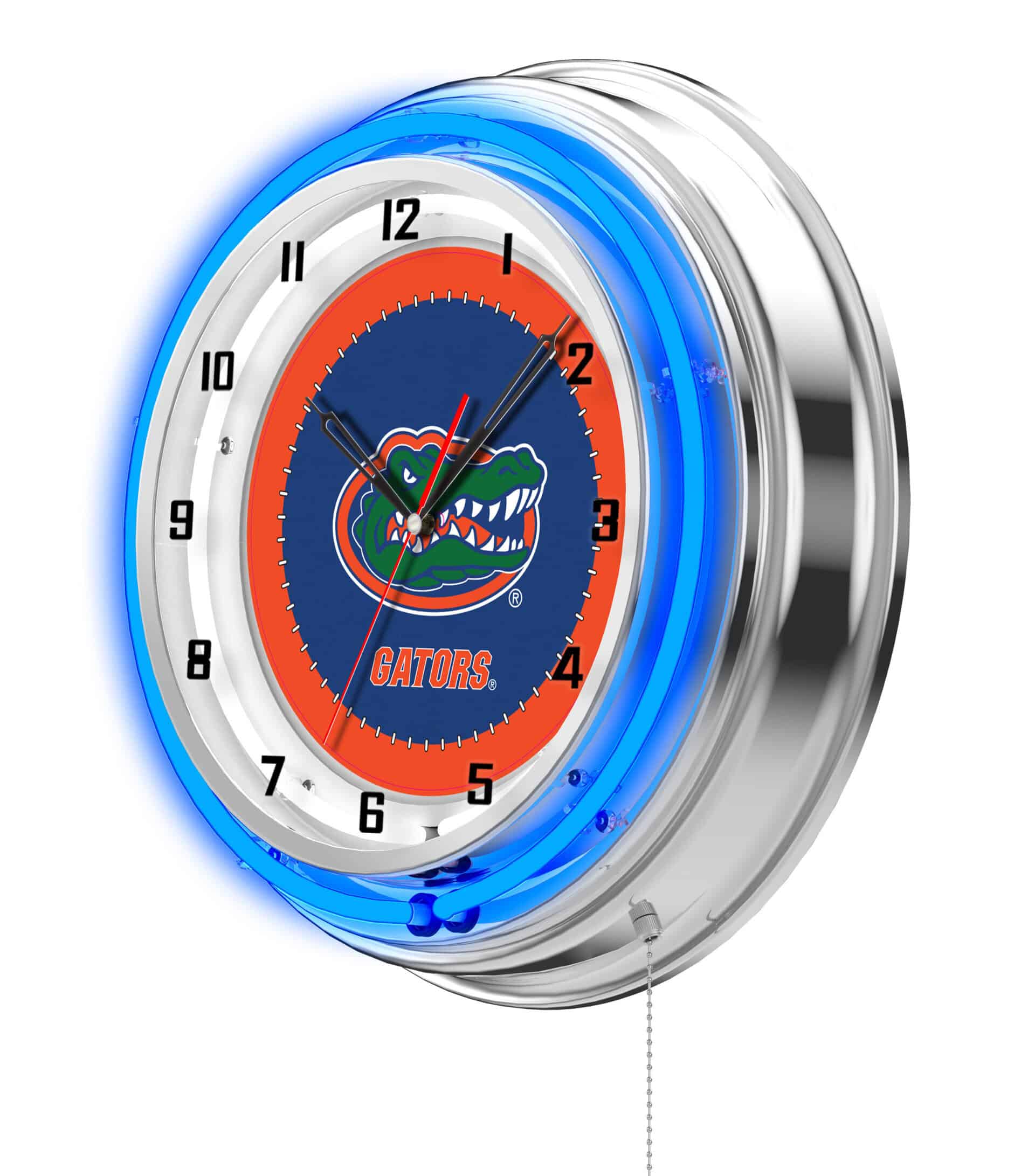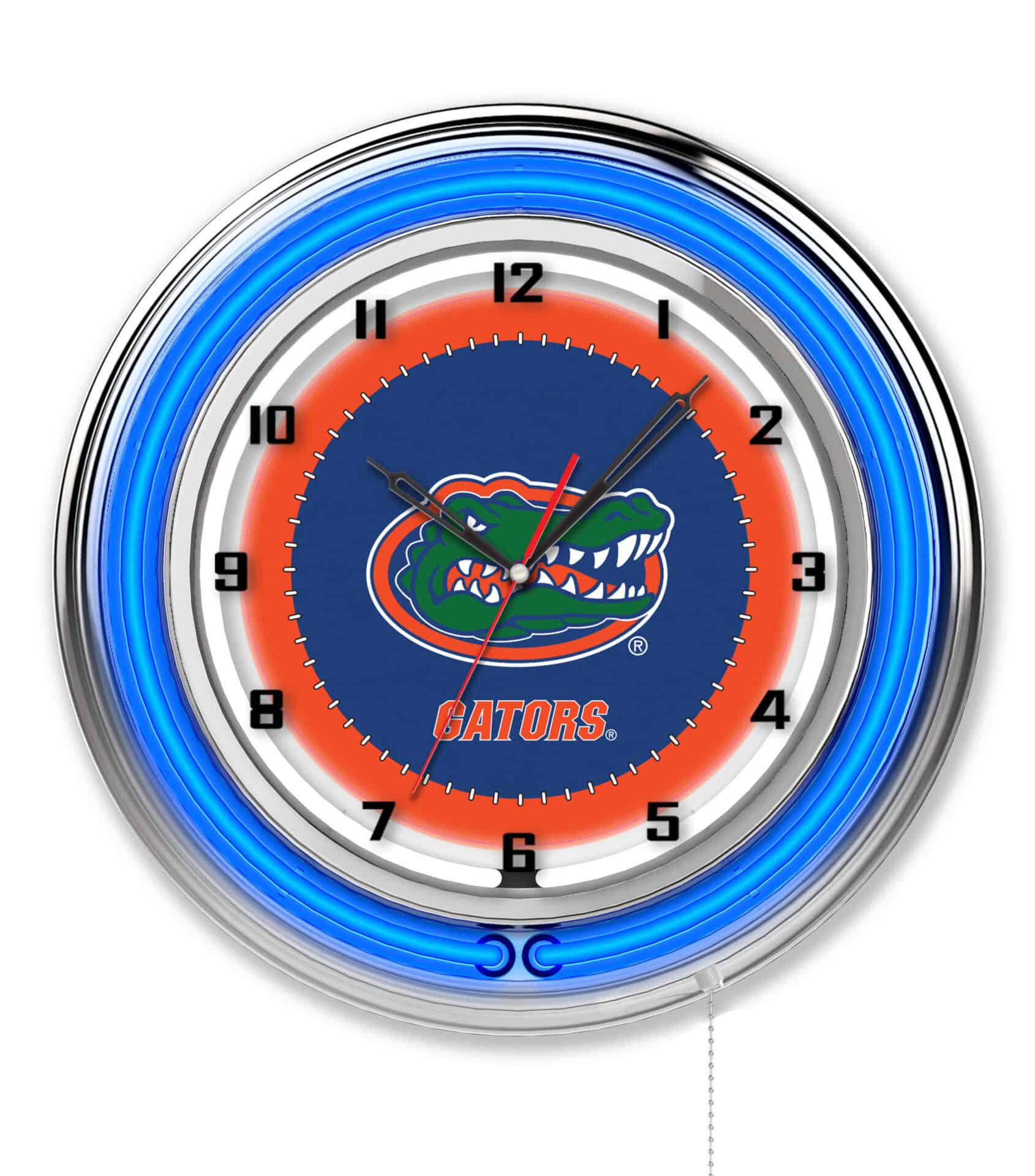 The University of Florida 19-Inch Neon Logo Clock in Chrome is a stunning addition to any space, perfect for showcasing your school pride. This clock features a sleek chrome casing and an eye-catching neon outer ring that complements the vibrant, full-color artwork on the custom printed clock face. The brilliant white inner neon ring illuminates the clock, ensuring visibility in any lighting. Equipped with a convenient pull chain, you can easily turn the neon lights on and off, while accurate quartz movement guarantees precise timekeeping. Ideal for gifts or personal use, this clock combines functionality with style.