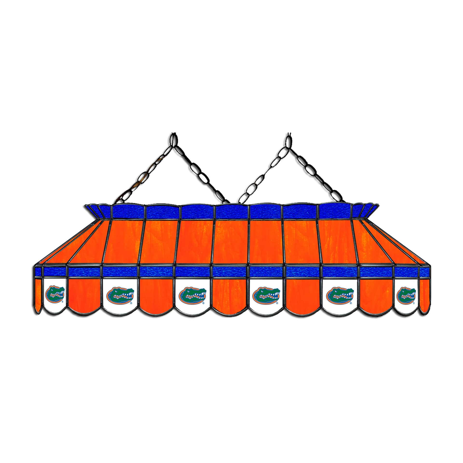 Show your Gator pride with this University of Florida 40 inch Stained Glass Billiard Lamp. This lamp features hand-cut stained glass with the team’s colors and logos, perfect for lighting up your pool table. The 40-inch width provides ample light, while the official team logos showcase your fandom. Each shade has (2) licensed logos, (6) in total. The lamp includes a hanging chain and ceiling mounting hardware for easy installation. Dimensions (LxWxH): 40 x 16 x 16. Product Weight (lbs): 40. Material: Hand cut glass, metal. Made in the USA. Add a touch of team spirit to your game room or man cave.
