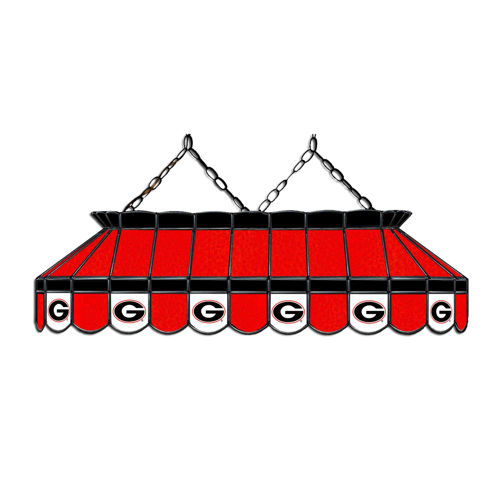 Show your team pride while you play with this University of Georgia 40 inch Stained Glass Billiard Lamp. This billiard lamp is perfect for any man cave game room. It features real hand-cut stained glass with team colors and logos. Includes a hanging chain, ceiling mounting plate, and instructions to make installation easy. The shade has two licensed logos. Proudly made in the USA, this officially licensed lamp will add the perfect touch to your game room. Dimensions (LxWxH): 40 x 16 x 16. Product Weight: 40 lbs. Material: Hand cut glass, metal.