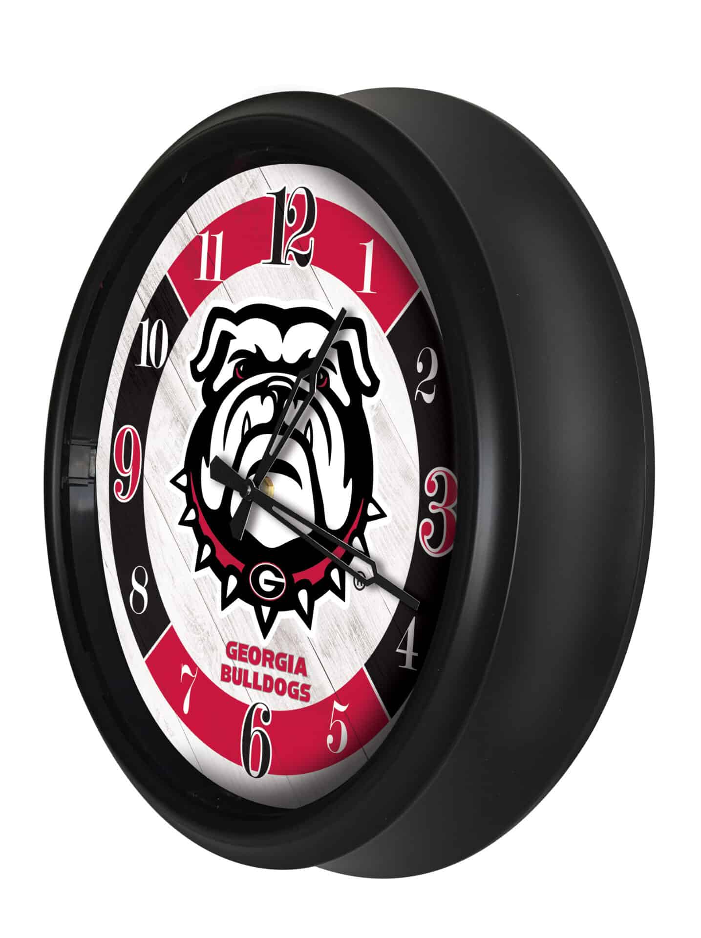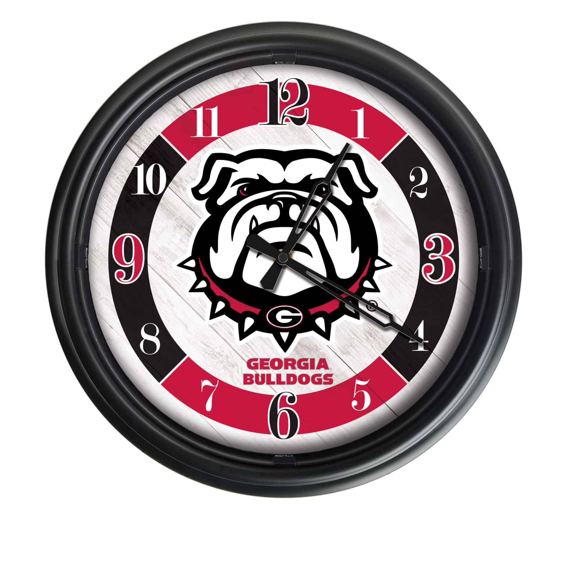 The University of Georgia (Bulldog) 14-Inch Indoor/Outdoor LED Wall Clock in Black is the perfect addition to your man cave or outdoor space. This clock not only showcases your school pride with vibrant, officially licensed artwork, but it is also designed for durability and functionality. Its weather-resistant construction allows for placement both indoors and outdoors, while the photo eye-controlled LED lights ensure visibility in low light conditions. Enjoy accurate timekeeping with a stylish flair that enhances your decor.