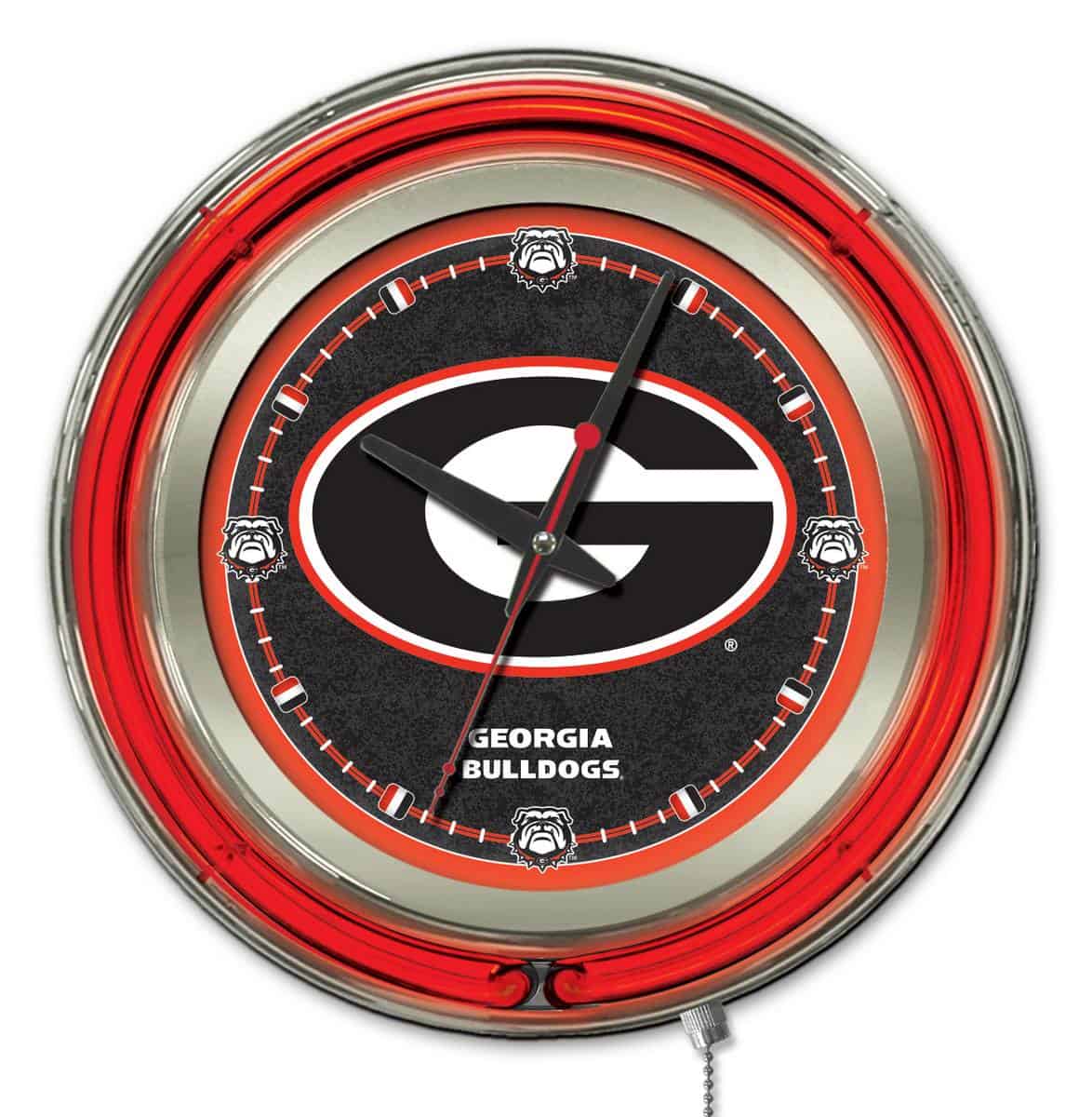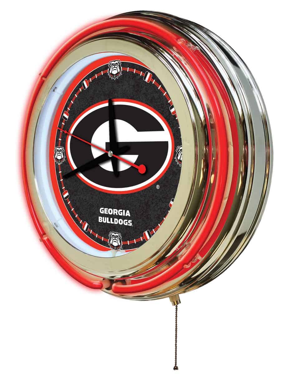The University of Georgia (G) 15-Inch Neon Logo Clock in Chrome is the perfect addition to any man cave, showcasing your school pride in a stylish and functional way. This clock features a polished chrome casing and vibrant team-colored neon outer ring that beautifully highlights the custom printed clock face, illuminated by a brilliant white inner neon ring. The neon rings can be easily activated and deactivated with a convenient pull chain located at the bottom of the clock. Powered by a UL Listed transformer for standard 120V outlets, this clock also boasts accurate quartz movement, ensuring you always keep perfect time. Ideal as a gift for recent graduates or sports enthusiasts, this clock combines functionality with a touch of flair.