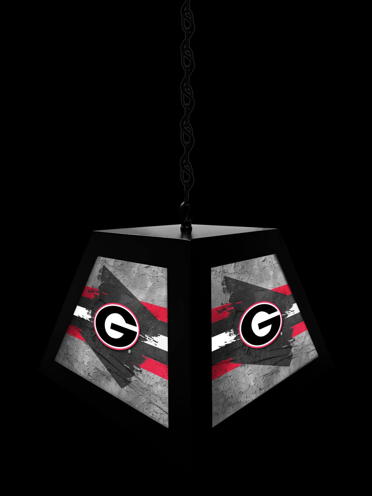 This pendant light features a heavy-duty metal frame with a sleek black finish, complemented by a matching ceiling mount and a decorative chain to conceal the cord. The shatter-resistant acrylic panels are digitally printed with UV cured ink for exceptional vibrancy. An on/off pull chain allows for easy operation. Select from officially licensed logos or explore custom imprinting options.