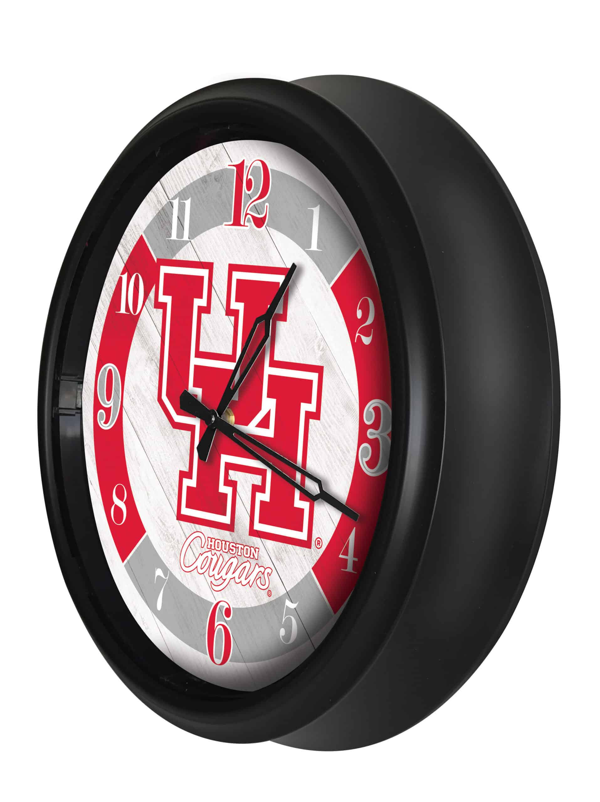 The University of Houston 14-Inch Indoor/Outdoor LED Wall Clock in Black is the ultimate addition to your man cave, combining functionality with school pride. Built to withstand outdoor conditions, this clock features a UV resistant black ABS plastic casing and a glass face lens with a rubber gasket, protecting it from the elements. The innovative design includes photo eye-controlled LED lights that automatically illuminate the clock face in low light, ensuring visibility day or night. With vibrant, fade-free colors and accurate quartz movement, this clock is perfect for any sports super fan or as a gift for recent graduates.