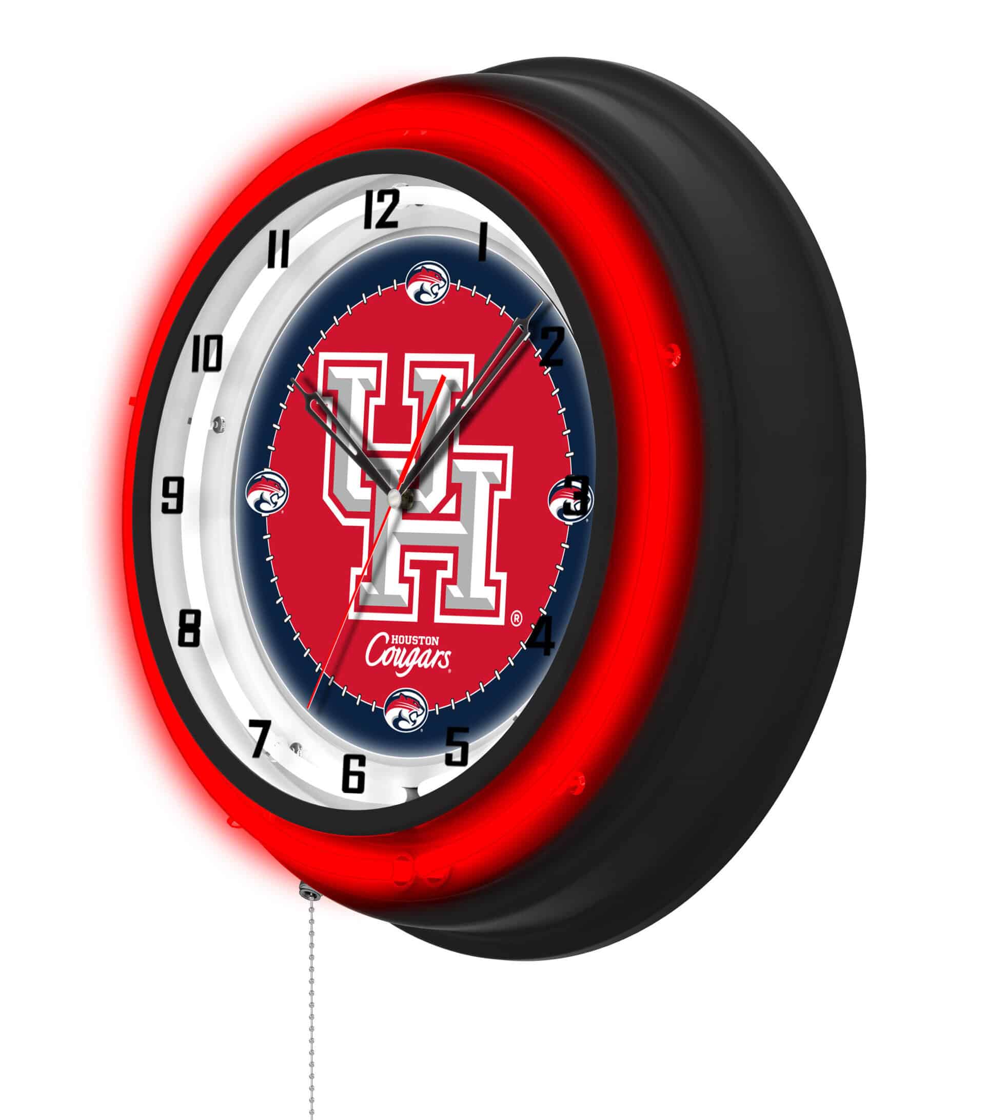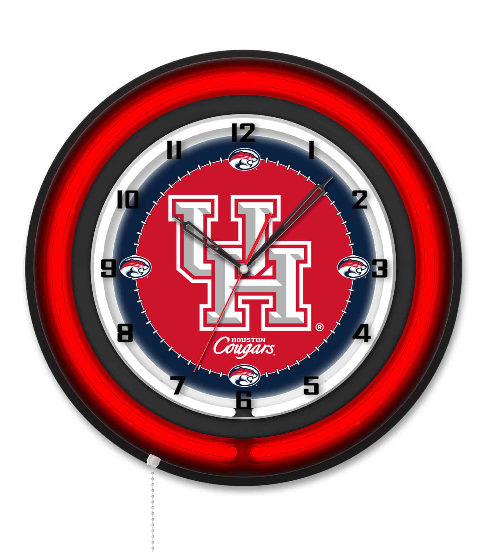 The University of Houston 19-Inch Neon Logo Clock in Black is the perfect addition to any fan’s space, showcasing your school pride in a vibrant and stylish way. This clock features a striking black casing and a neon outer ring that reflects team colors, illuminating the custom printed clock face with a brilliant inner white neon ring. The easy-to-use pull chain allows you to turn the neon lights on and off effortlessly, while the accurate quartz movement ensures you keep perfect time. This clock is a fantastic gift for graduates, sports fans, or anyone looking to enhance their man cave decor.