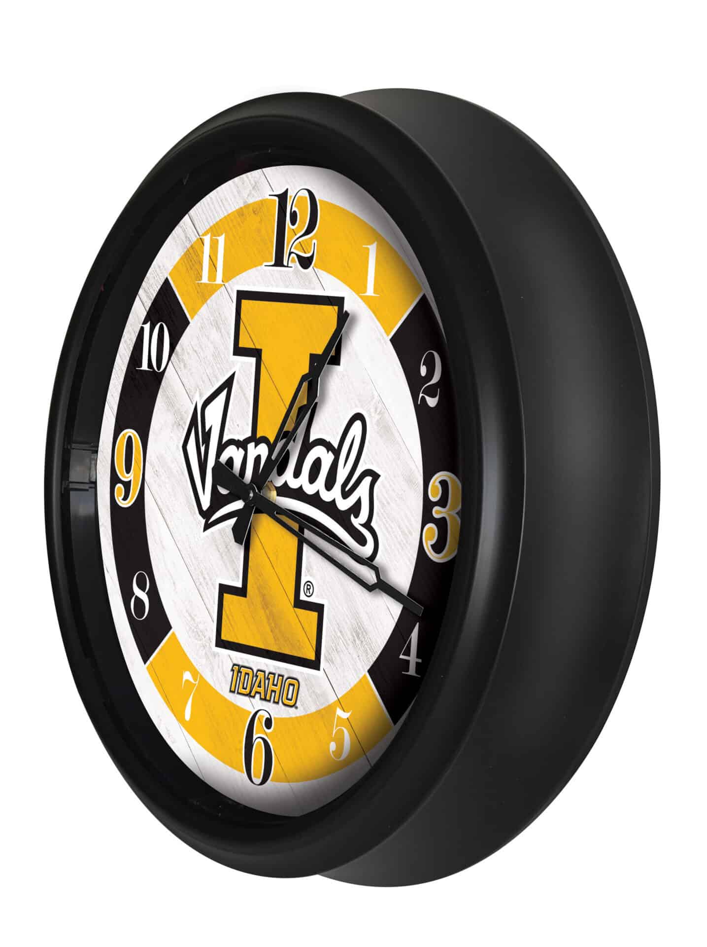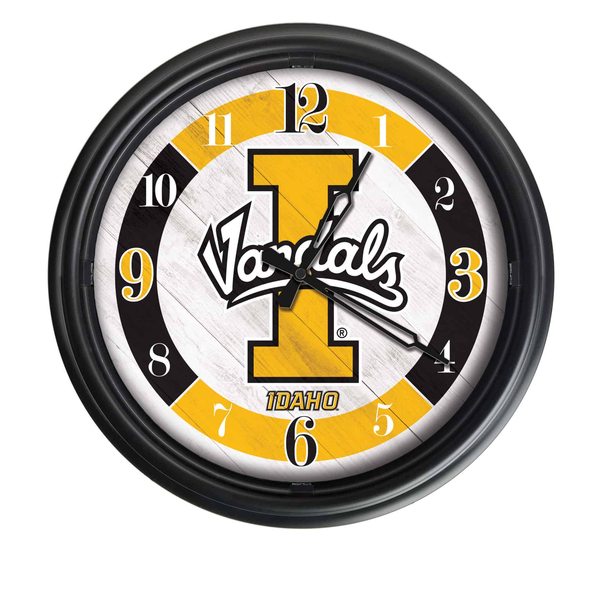 The University of Idaho 14-Inch Indoor/Outdoor LED Wall Clock in Black is the perfect addition to any space, showcasing your school pride with vibrant, full-color artwork. This clock is designed for both indoor and outdoor use, featuring a fully weather-resistant construction that can withstand the elements. The UV resistant ABS plastic casing and rubber-sealed glass face lens ensure durability while protecting the clock’s inner workings from moisture and dust. The innovative photo eye technology controls the LED lights, automatically illuminating the clock face in low-light conditions for easy readability. With accurate quartz movement powered by a single AA battery, this clock guarantees precise timekeeping. Whether as a gift for a graduate, a fan for game day, or a stylish addition to your home, this clock combines functionality with spirited design.