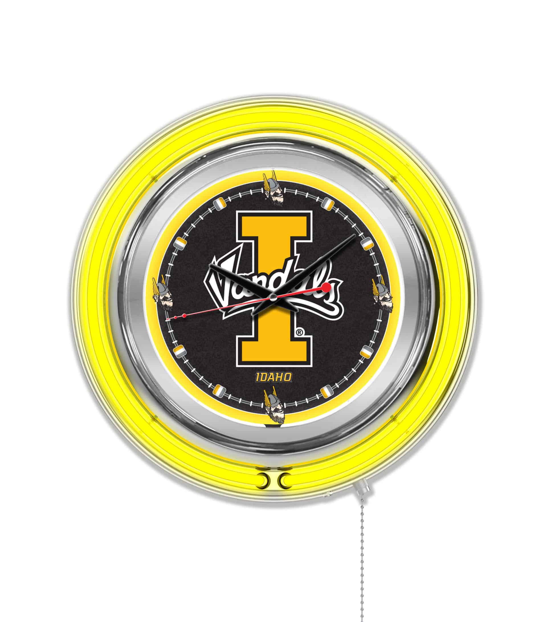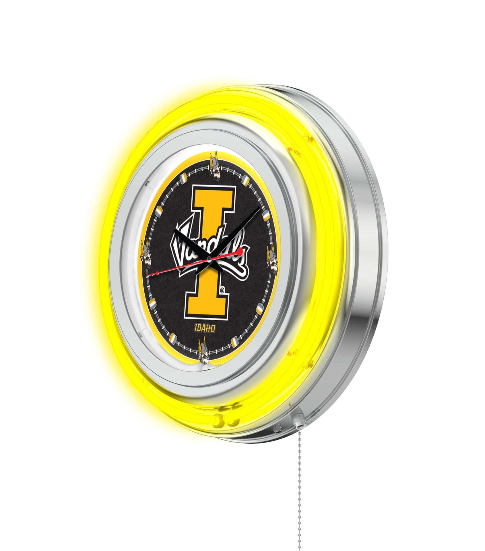 The University of Idaho 15-Inch Neon Logo Clock in Chrome is the ultimate addition to your man cave, showcasing your school pride with style. This eye-catching clock features a chrome casing and a vibrant neon outer ring in team colors, beautifully illuminating the custom printed clock face with a brilliant white inner neon ring. The neon rings are easily controlled with a pull chain for convenient on/off operation.