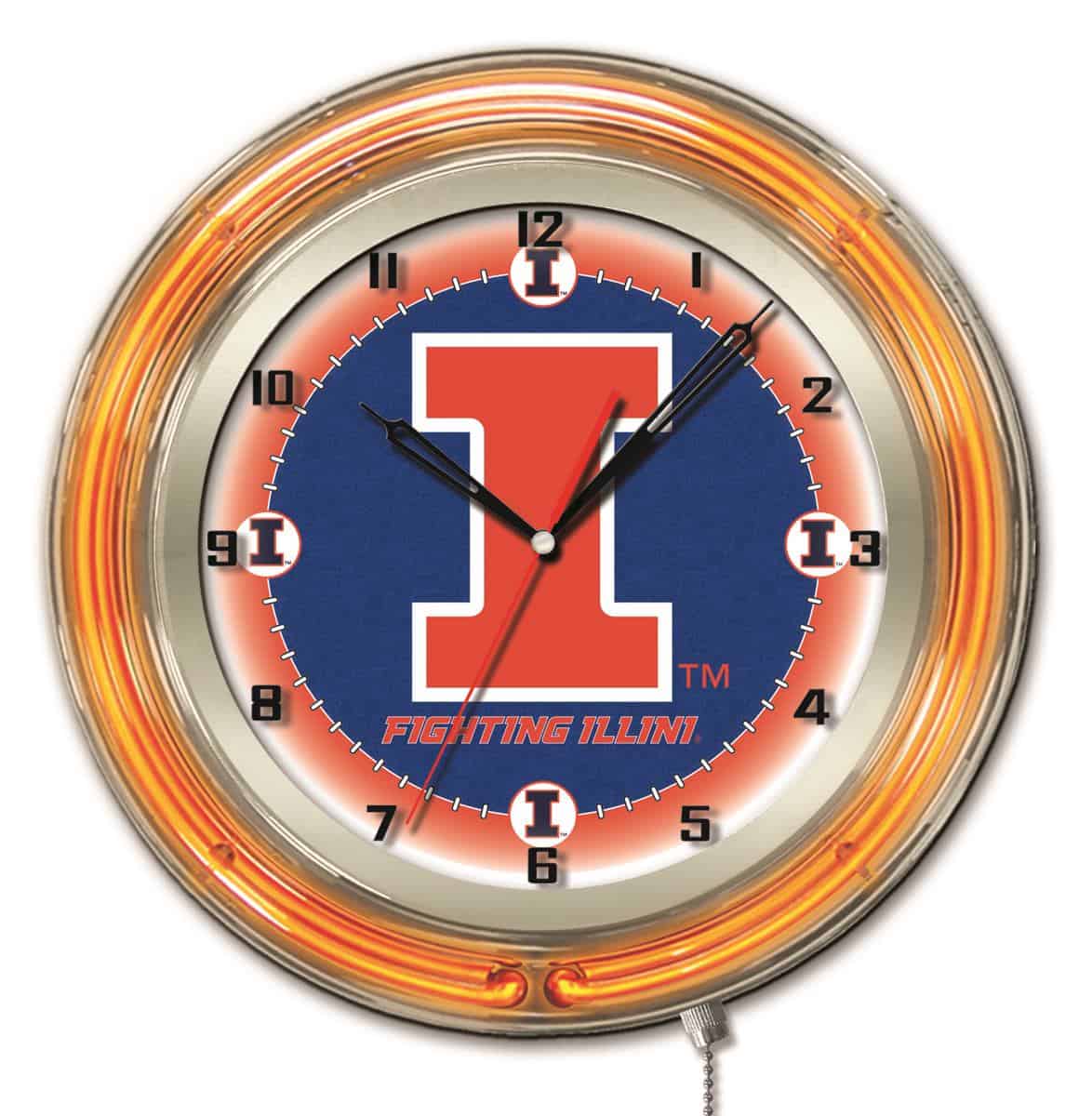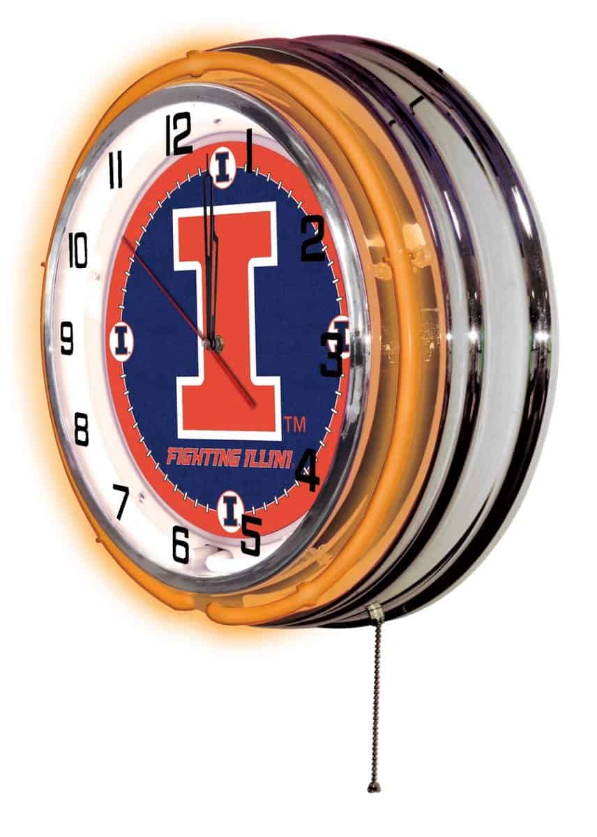The University of Illinois 19-Inch Neon Logo Clock in Chrome is the ideal addition to any fan’s space, combining style with functionality. This eye-catching clock features a sleek chrome casing and vibrant neon rings that illuminate the custom printed clock face. The brilliant white inner neon ring enhances visibility, making it a perfect centerpiece for your man cave or game room. With its easy pull chain for operation and accurate quartz movement, this clock is both practical and a statement piece.