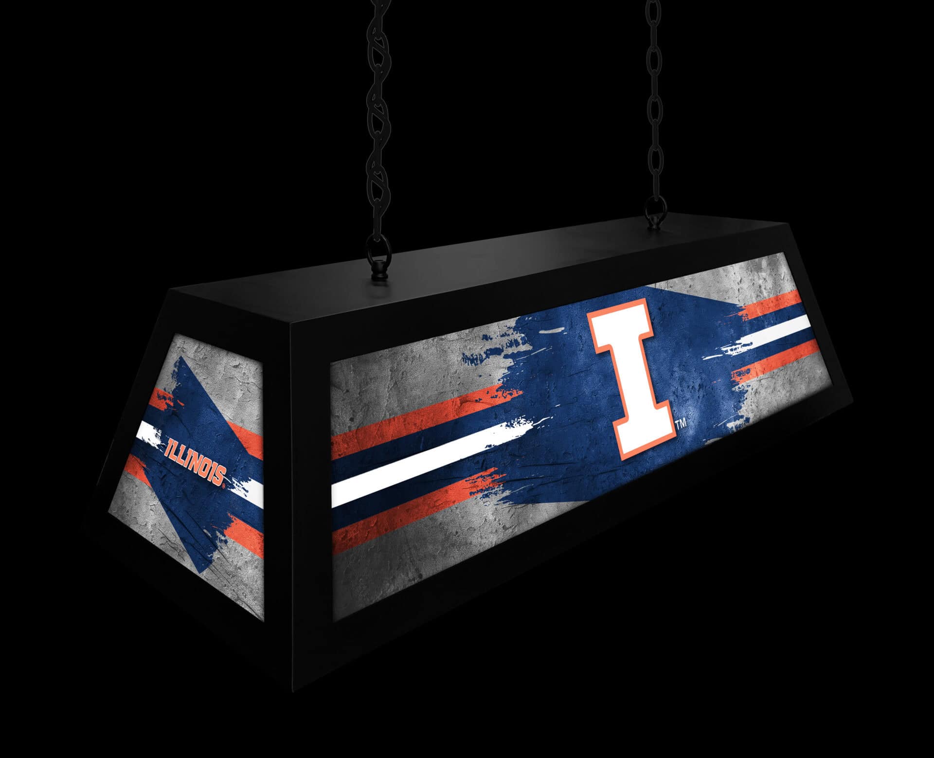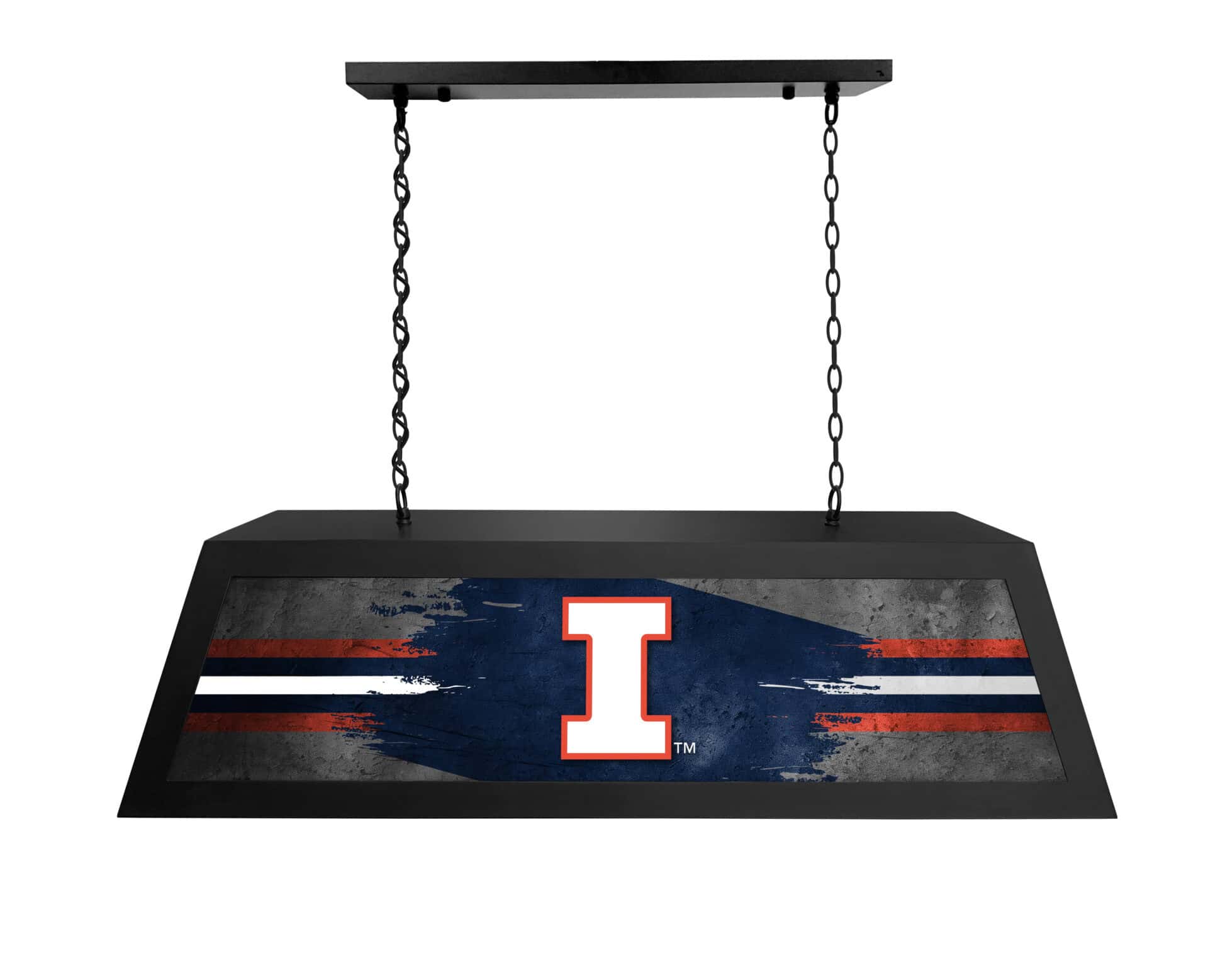 Light up your game room with this University of Illinois Long Box Billiard Light! This suspended light fixture combines a metal frame construction with a bright backlit design. Perfect for billiard tables, game tables, and bars. It provides excellent illumination and adds a touch of team spirit to any space. The vibrant graphics and durable construction ensure long-lasting enjoyment.