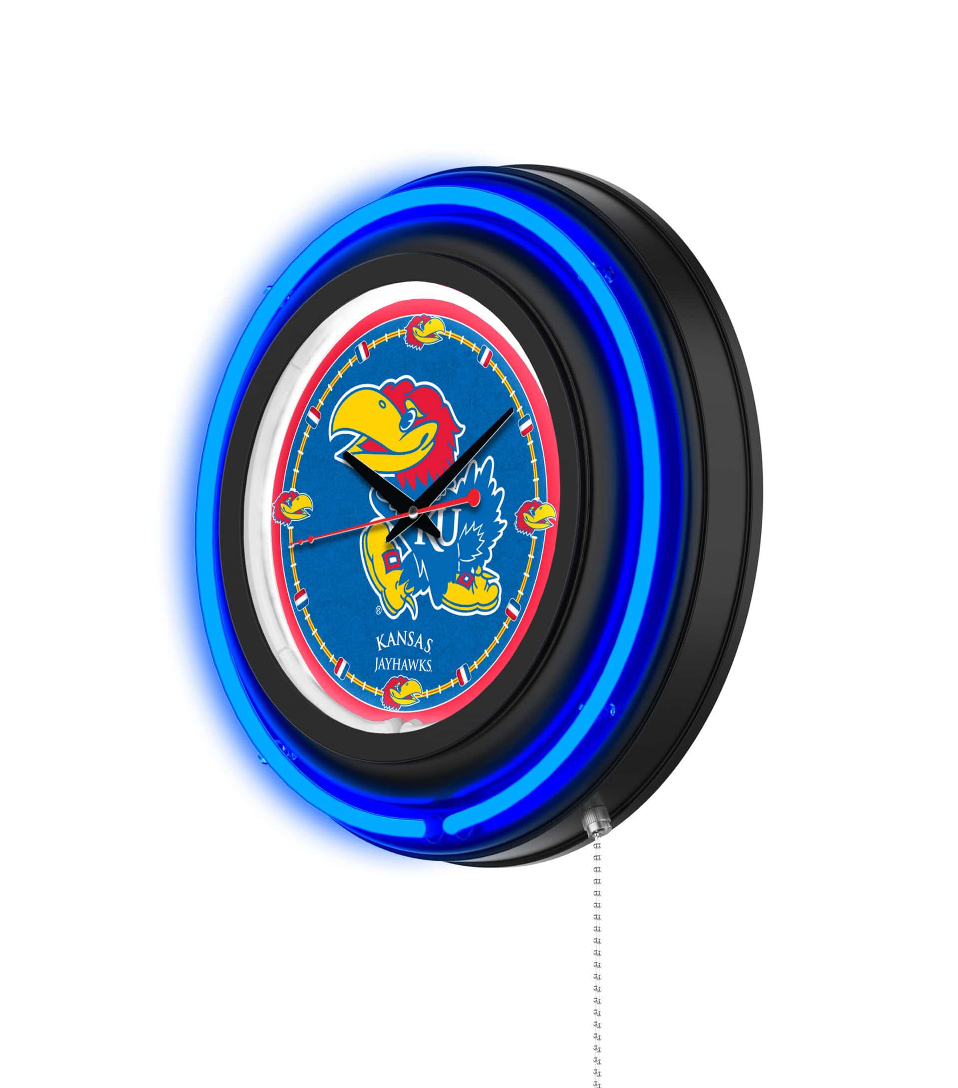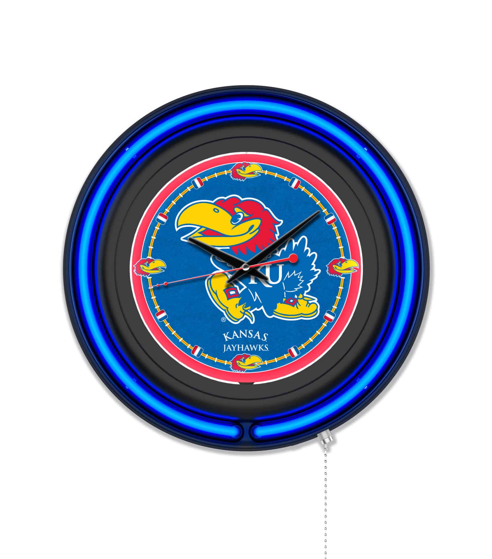 The University of Kansas 15-Inch Neon Logo Clock in Black is the ultimate decor piece for any fan’s space. This vibrant clock not only showcases your school pride but also enhances your man cave with its stunning design. Featuring a sleek black casing and a neon outer ring in team colors, the clock face is illuminated by a brilliant white inner neon ring, making it a striking centerpiece. The neon rings can be easily turned on and off with a convenient pull chain, while the clock operates on a standard 120V outlet. With accurate quartz movement powered by a single AA battery (not included), this clock ensures you stay on time. Perfect as a gift for sports enthusiasts or as a personal treasure, this clock is a must-have for any devoted fan.