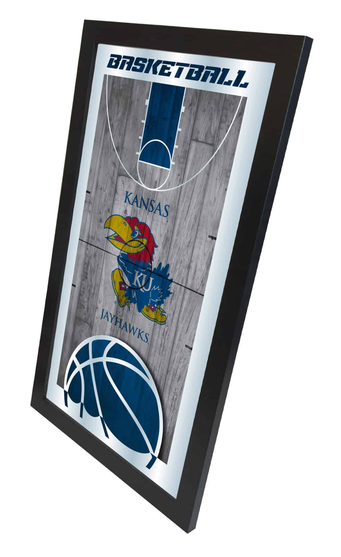 Show your school pride with this officially licensed Basketball Wall Mirror. Featuring a simple yet elegant design, the vibrant colors burst through the 1/8″ thick glass and are accentuated by mirrored highlights. The mirror is framed in a sleek black, 1 1/4″ wrapped wood frame and includes dual saw-tooth hangers for easy installation. Measuring 15″ in height and 26″ in width, this mirror is perfect for your office, garage, or any room in your home. Whether you’re gifting it to a recent graduate, a sports super fan, or treating yourself, you can take pride in owning a high-quality piece.