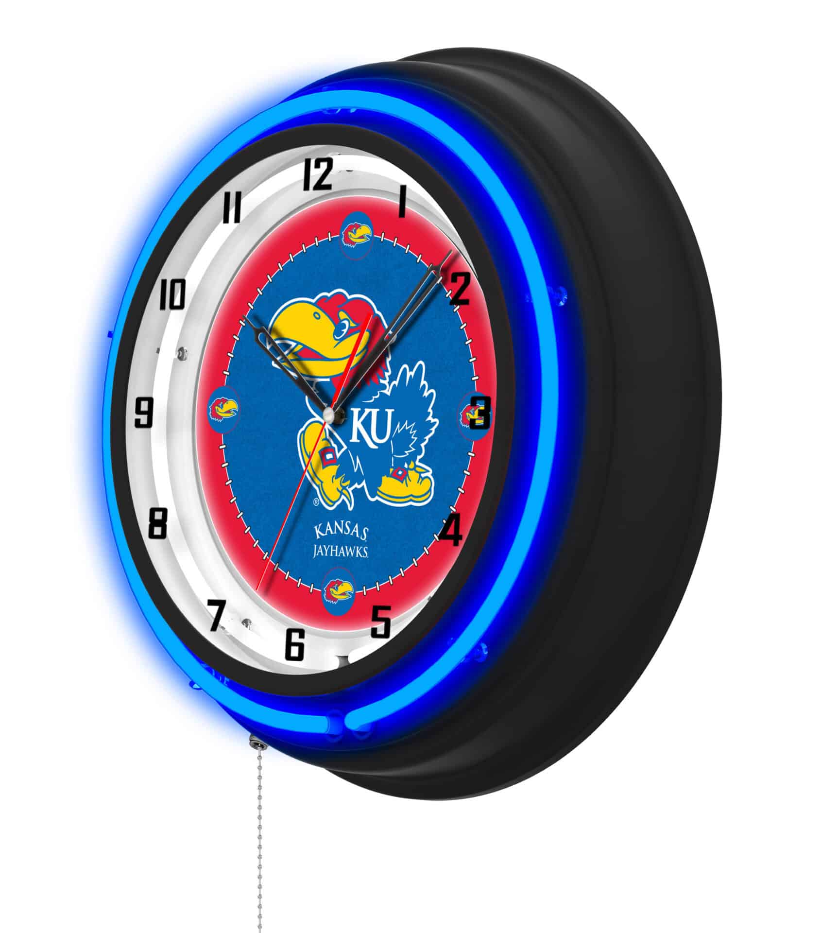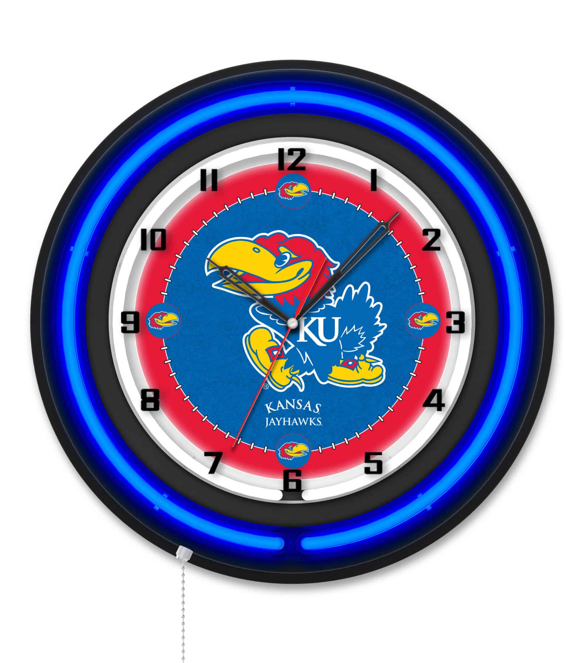 The University of Kansas 19-Inch Neon Logo Clock in Black is an eye-catching addition to any man cave, showcasing your school pride with style. Featuring a sleek black casing, this clock is illuminated by vibrant neon rings—one in your team’s colors and a brilliant white inner ring that brightens the custom printed clock face. With a convenient pull chain for easy operation, this clock not only tells time accurately but also serves as a dynamic piece of decor.