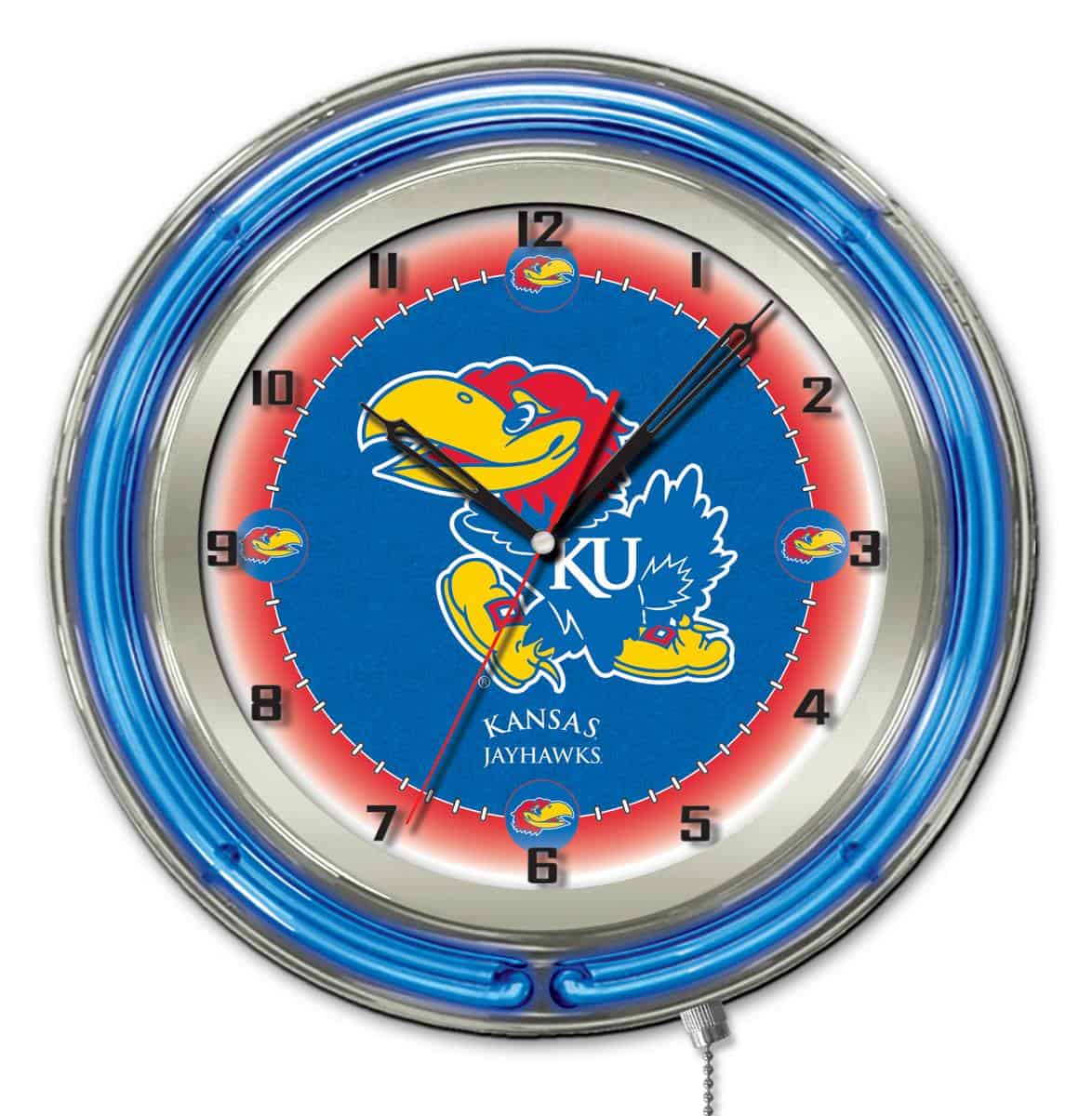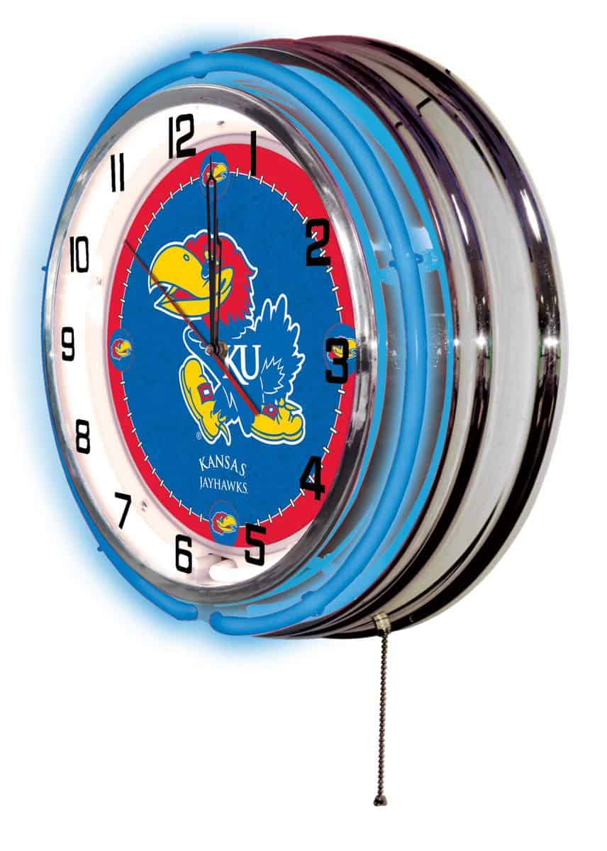 The University of Kansas 19-Inch Neon Logo Clock in Chrome is the ideal addition to any fan’s space, showcasing school pride with style. This clock features a sleek chrome casing and vibrant team colors, highlighted by a stunning neon outer ring that beautifully illuminates the custom printed clock face with a brilliant white inner neon ring. The neon rings can be easily activated or deactivated with a convenient pull chain at the bottom, ensuring effortless operation. Powered by a UL Listed transformer for standard 120V outlets, this clock combines functionality with fan spirit. With accurate quartz movement, it requires only a single AA battery (not included) for precise timekeeping. Perfect as a gift for graduates or superfans, this clock is designed for those who want to celebrate their team in a bold way.