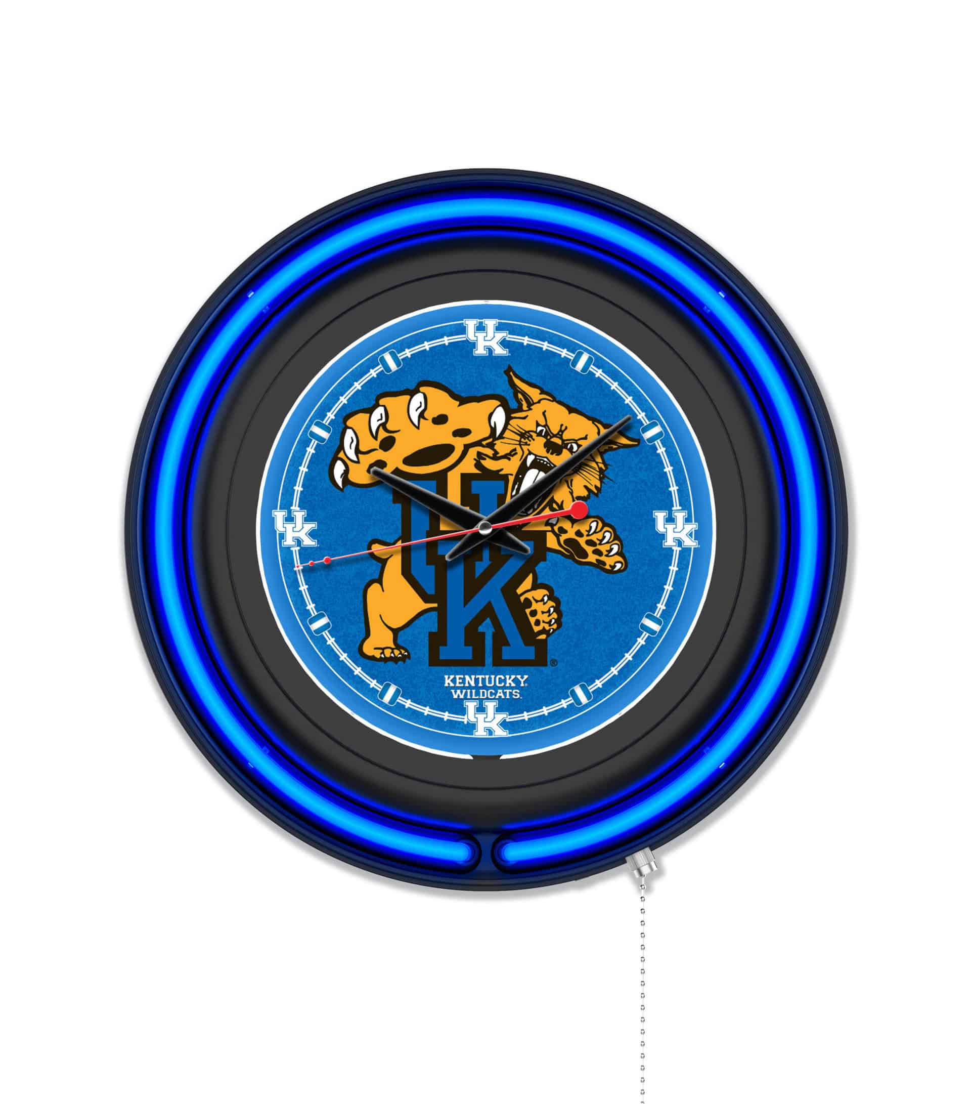 The University of Kentucky (Cat) 15-Inch Neon Logo Clock in Black is an eye-catching addition to any room, showcasing your school pride with vibrant and dynamic design. This clock features a sleek black casing with a team-colored neon outer ring that beautifully complements the illuminated clock face, ensuring it stands out in any setting. The double neon tubes—one accent color and one white for illumination—create a stunning visual effect, while the pull chain allows for easy on and off operation. This clock is powered by a UL Listed transformer, making it convenient to plug into a standard 120V outlet, and its precise quartz movement guarantees accurate timekeeping.