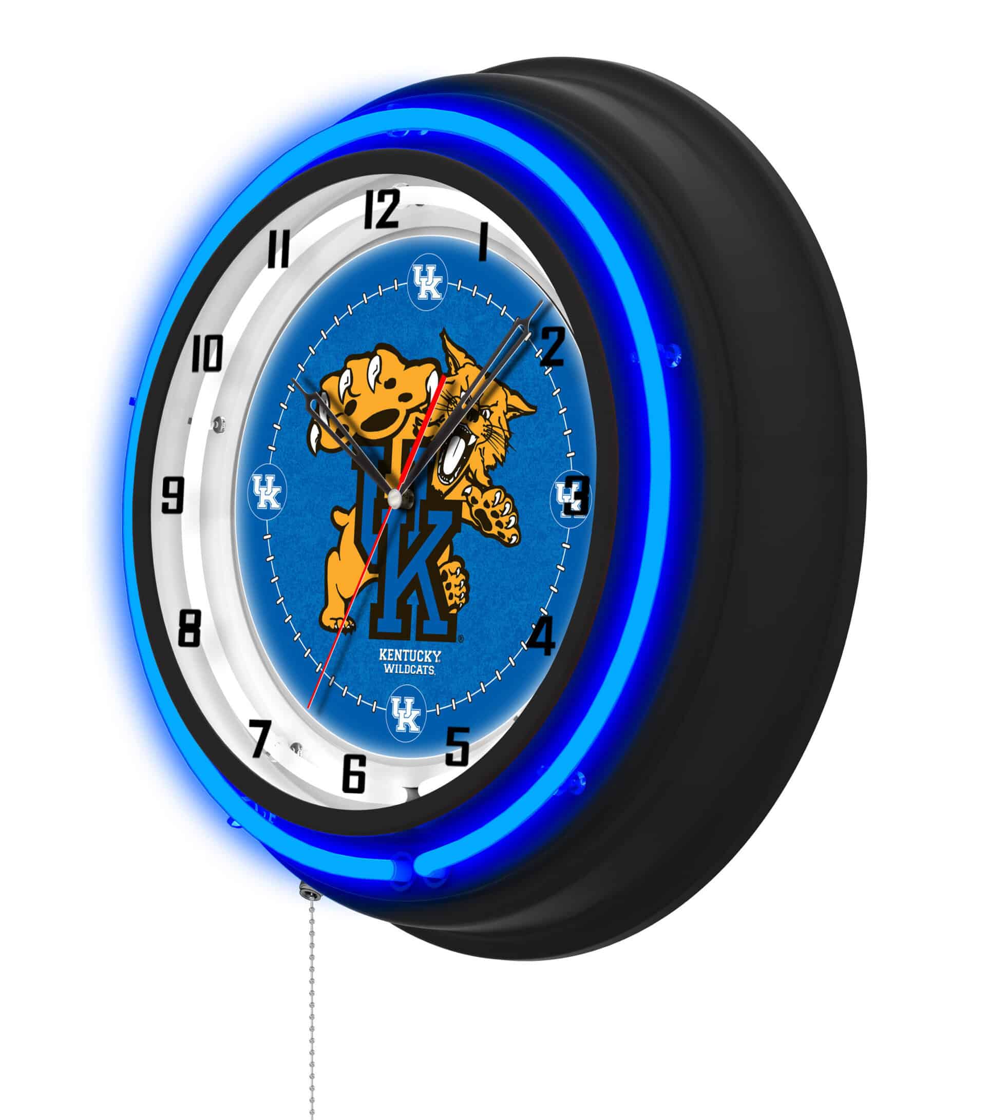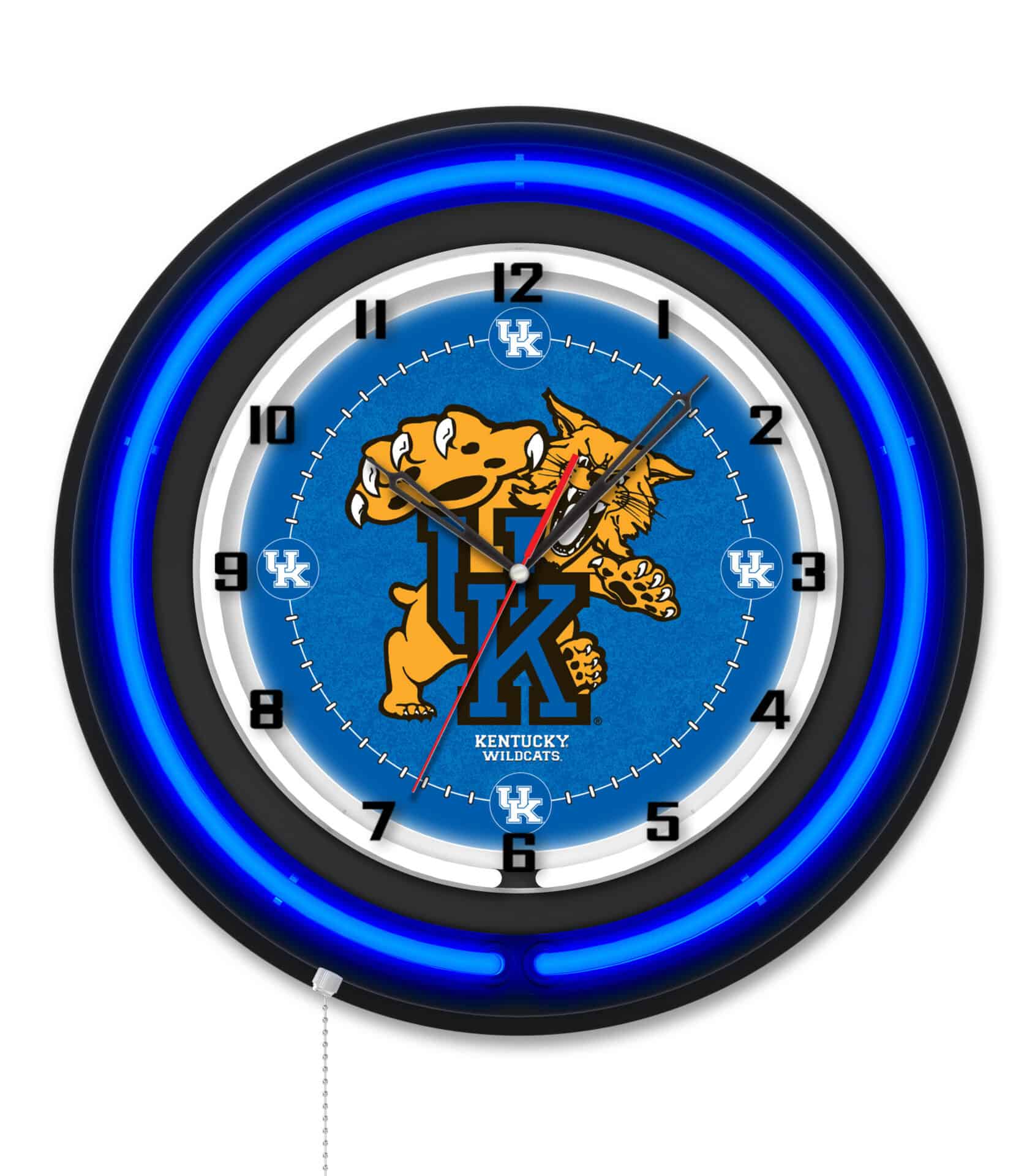 Showcase your school pride with the “University of Kentucky (Cat) 19-Inch Neon Logo Clock in Black. Designed to make a bold statement, this clock features a sleek black casing complemented by a vibrant neon outer ring in team colors. The clock face is illuminated by a brilliant white inner neon ring, creating an eye-catching display. With easy-to-use functionality, the neon lights can be turned on and off conveniently using a pull chain. Powered by a standard 120V outlet and featuring accurate quartz movement, this clock ensures you’ll always be on time. Ideal as a gift for graduates, sports enthusiasts, or for your personal collection, this clock combines style and utility.