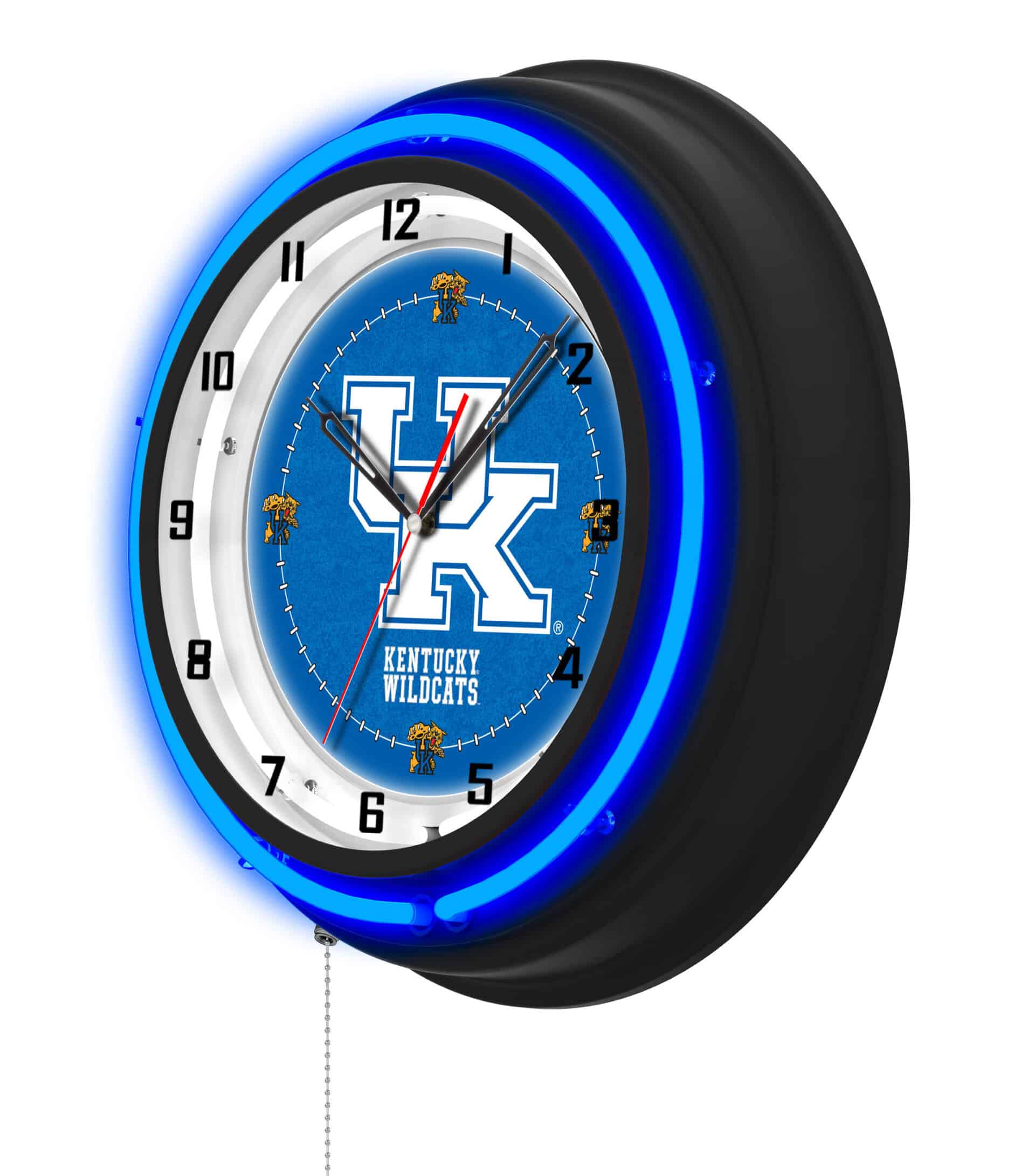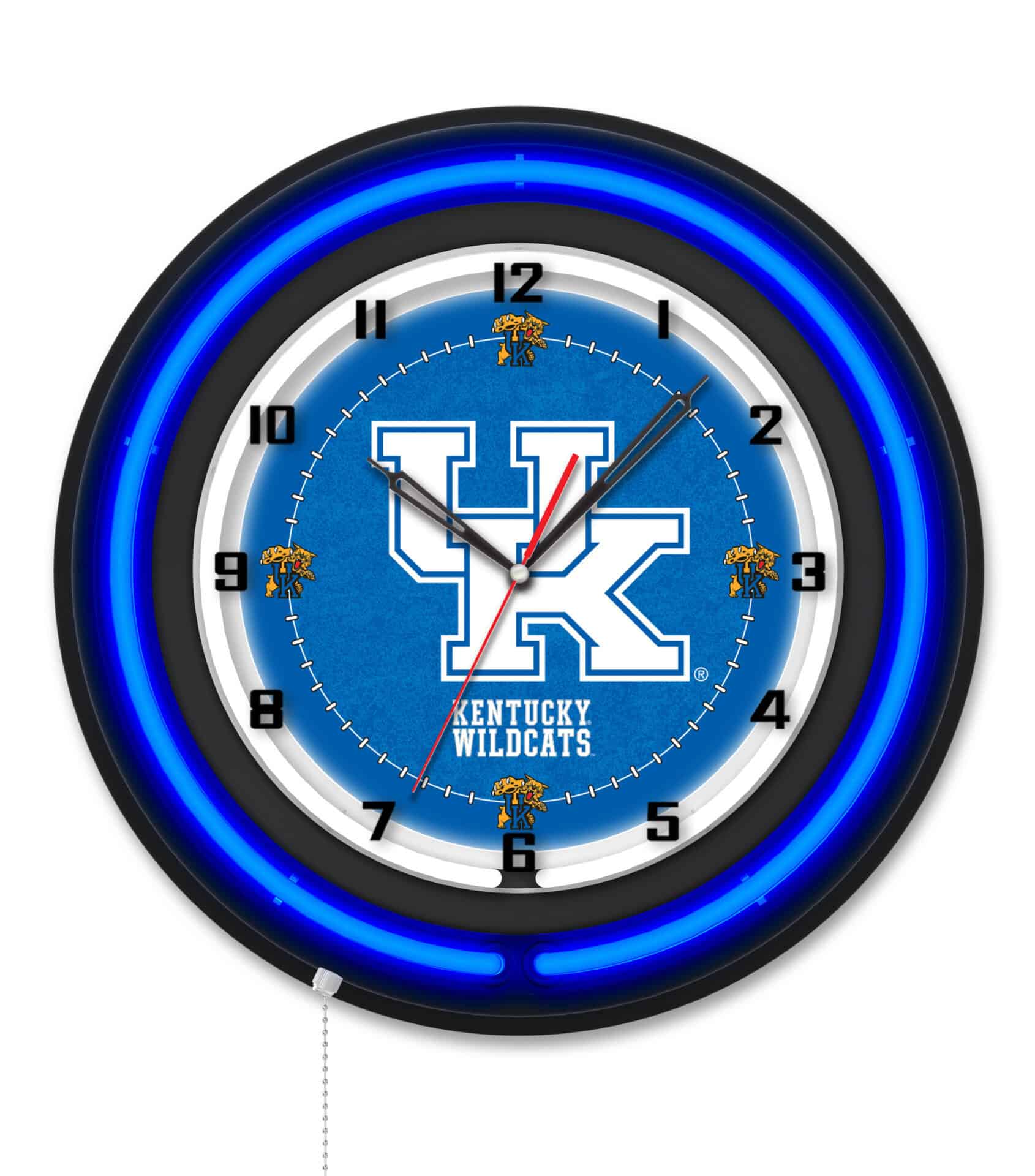 The University of Kentucky (UK) 19-Inch Neon Logo Clock in Black is an eye-catching addition to any man cave, showcasing your school pride with its vibrant design. Featuring a black casing and a neon outer ring in team colors, this clock is illuminated by a brilliant white inner neon ring that makes the custom printed clock face stand out. The neon rings can be easily turned on and off using a pull chain, ensuring convenience and ease of use. Powered by a UL Listed transformer, this clock operates on a standard 120V outlet, while its accurate quartz movement keeps perfect time using a single AA battery (not included). This clock is a fantastic gift for recent grads, sports fans, or a perfect treat for yourself.