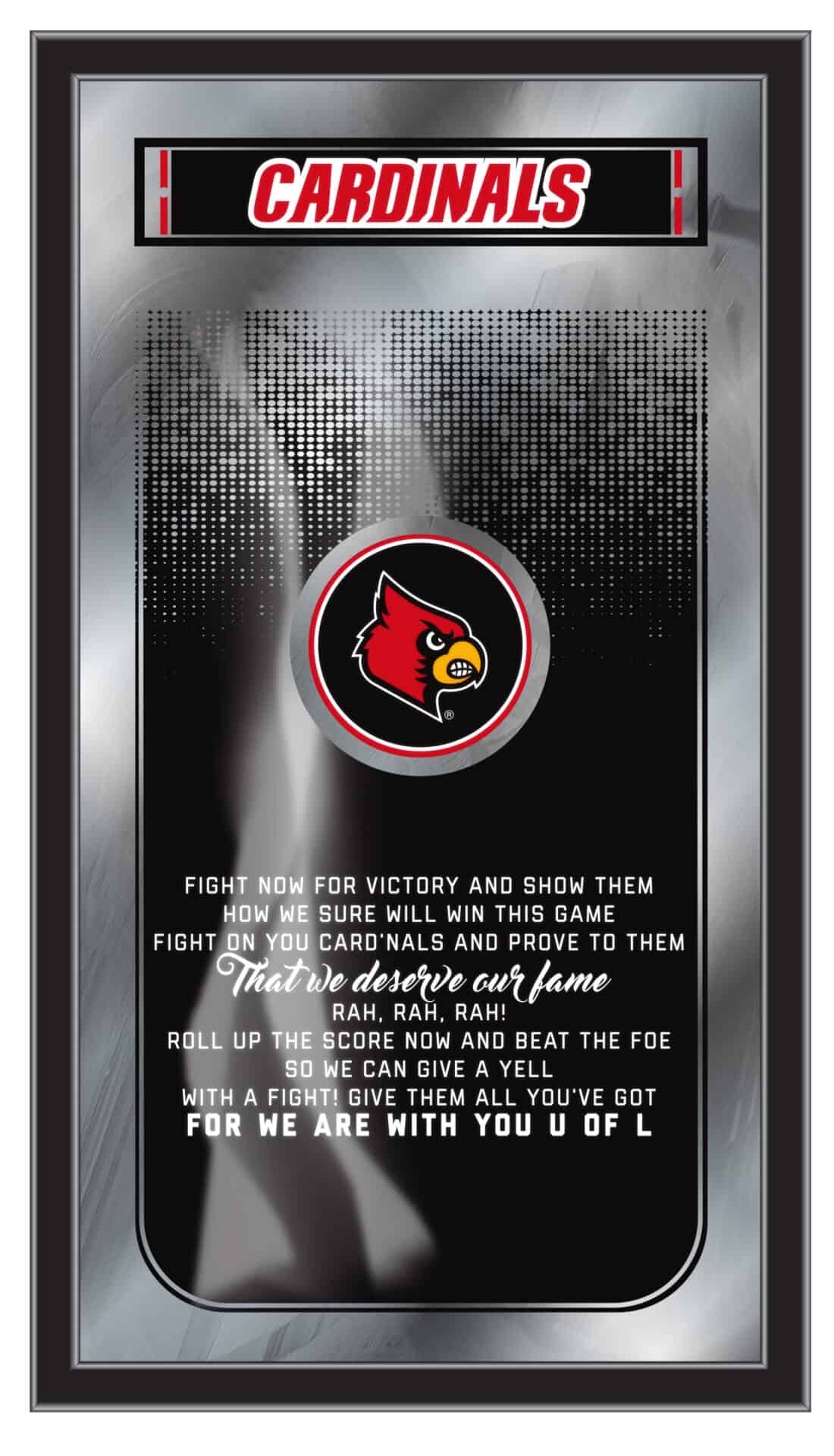 The perfect way to show your school pride, our Fight Song Wall Mirror displays your school’s logo and the verses that get them fired up on game day, with a style that fits any setting. With its simple yet elegant design, vibrant colors burst through the 1/8″ thick glass and are highlighted by mirrored accents. Framed with a black, 1 1/4″ wrapped wood frame and equipped with saw tooth hangers, this 26″(H) x 15″(W) mirror is ideal for your office, garage, or any room of the house. Whether purchasing as a gift for a recent grad, sports super fan, or for yourself, you can take satisfaction knowing you’re buying a mirror that is proudly made in the USA.