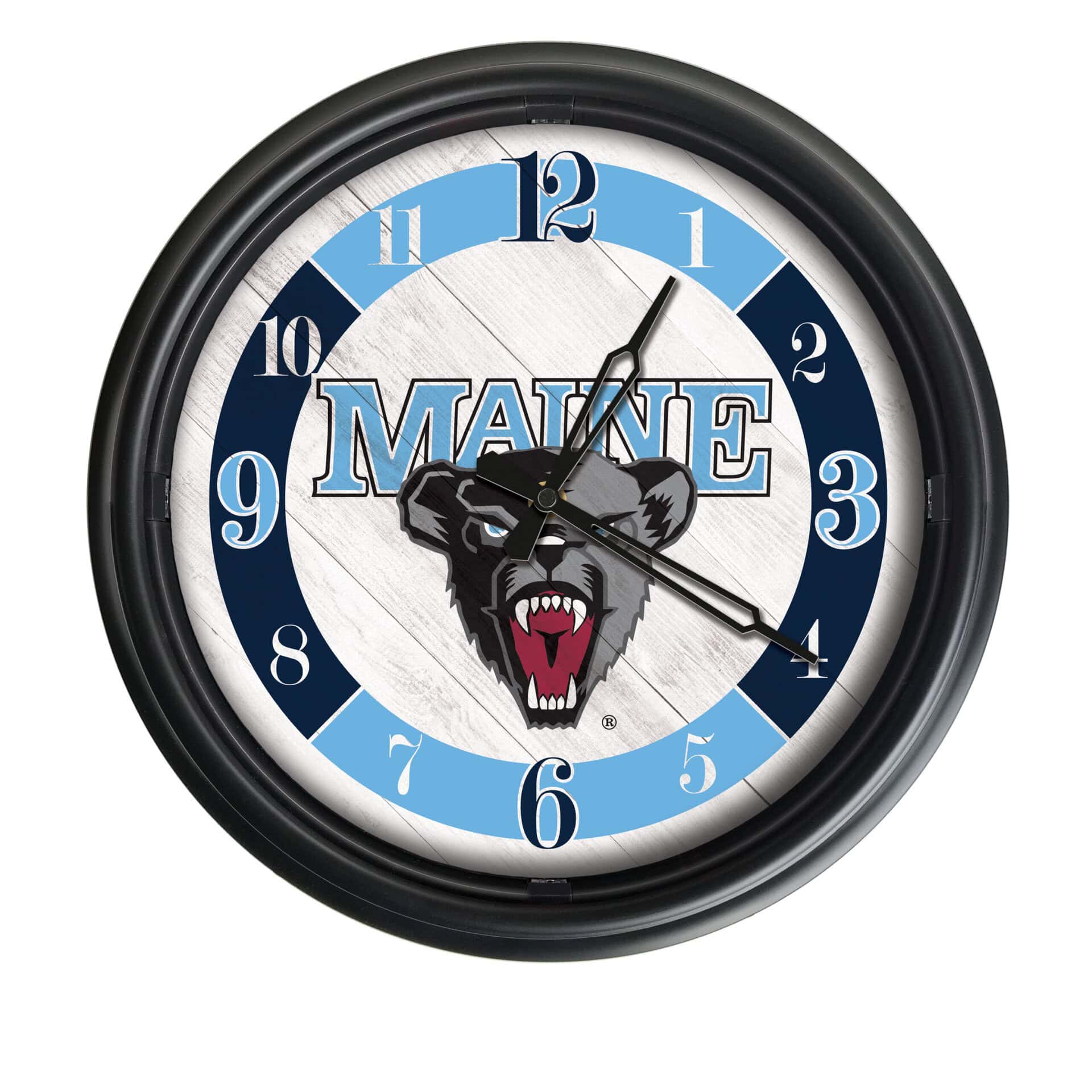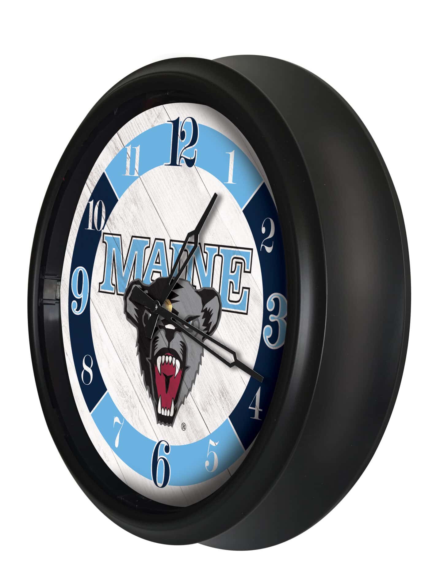 The University of Maine 14-Inch Indoor/Outdoor LED Wall Clock in Black is the perfect addition to showcase your school pride in any space. Designed for both indoor and outdoor use, this clock features a durable construction that withstands the elements. The clock is illuminated by four LED lights that automatically turn on in low light, ensuring visibility at all times. With vibrant, fade-resistant artwork and accurate quartz movement, it’s a stylish and functional piece for any fan’s collection.