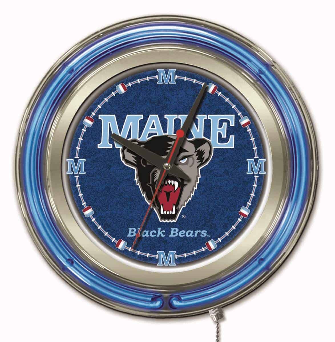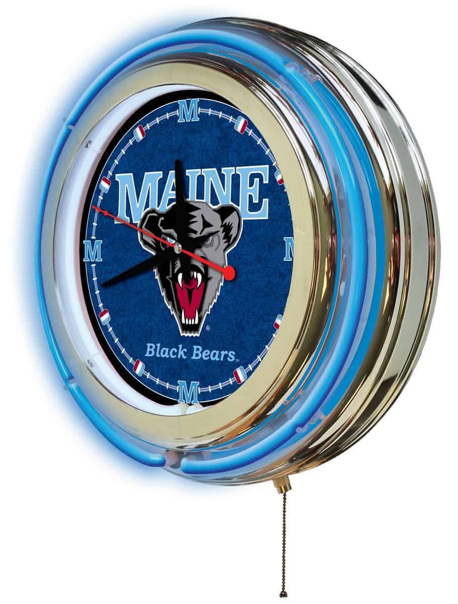 The University of Maine 15-Inch Neon Logo Clock in Chrome is the perfect addition to any man cave, showcasing your school pride with its stunning design. This clock features a chrome casing and a vibrant, team color-specific neon outer ring that beautifully highlights the custom-printed clock face. The clock is illuminated by a brilliant white inner neon ring, making it a striking focal point in any room. With easy-to-use functionality, the neon rings can be turned on and off with a convenient pull chain, and the clock operates on a standard 120V outlet.