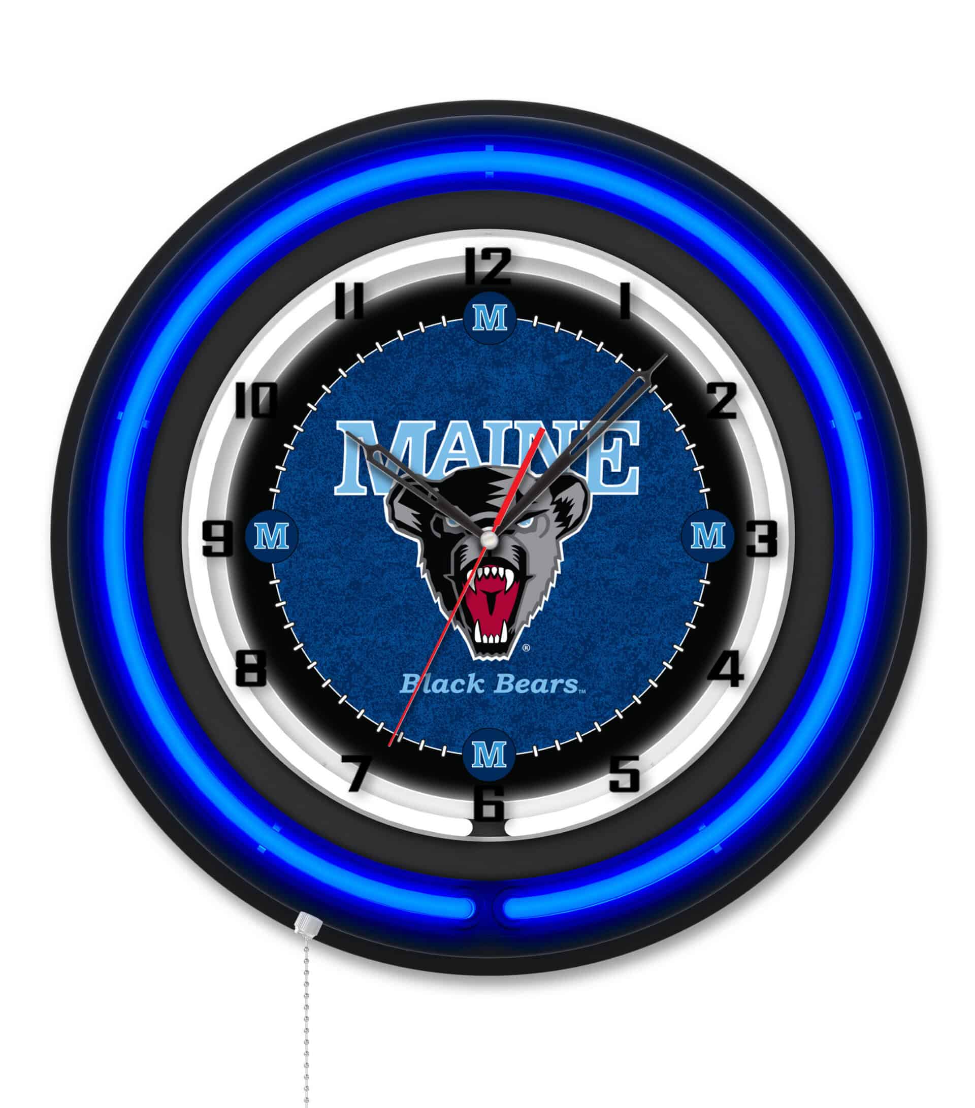 The University of Maine 19-Inch Neon Logo Clock in Black is the perfect addition to any space, showcasing your school pride in vibrant colors. This stunning clock features a sleek black casing and a neon outer ring that highlights the custom printed clock face, illuminated by a brilliant white inner neon ring. The neon rings are effortlessly activated with a pull chain, while the clock operates on a standard 120V outlet, ensuring a reliable and stylish timepiece for any fan or graduate.
