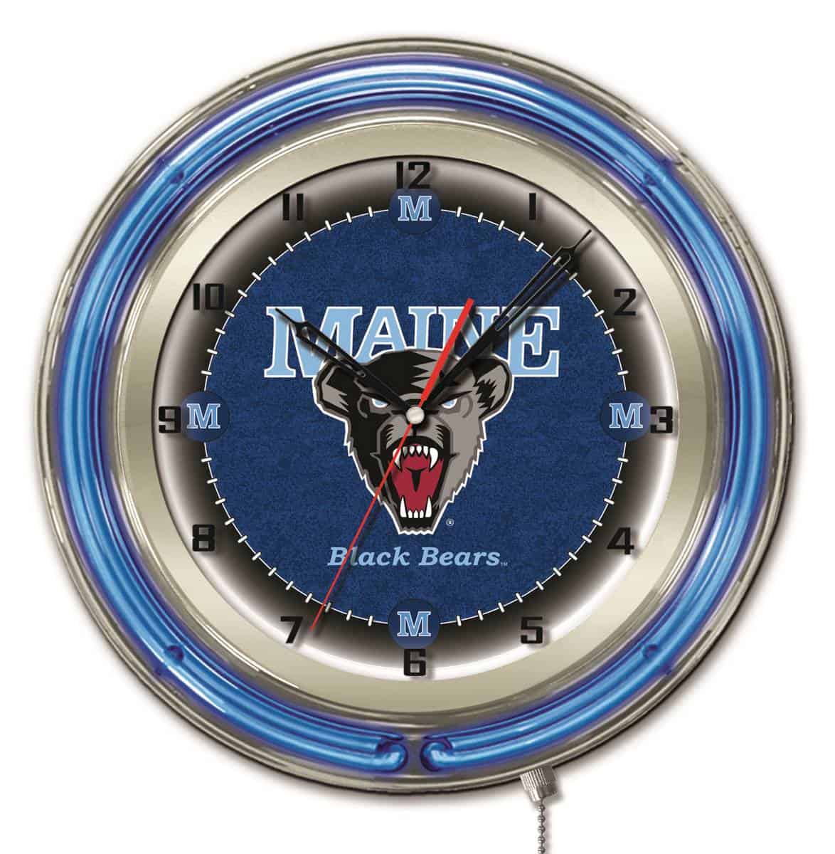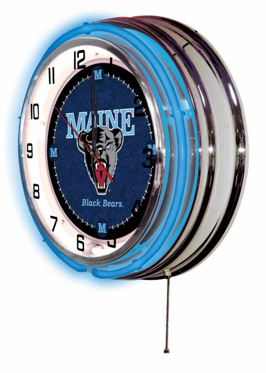 The University of Maine 19-Inch Neon Logo Clock in Chrome is the perfect addition to any fan’s space, showcasing your school pride with vibrant, eye-catching design. Featuring a sturdy chrome casing and a striking neon outer ring in team colors, this clock is illuminated by a brilliant white inner neon ring that enhances its custom printed clock face. The neon rings can be easily turned on and off with a pull chain located at the bottom, providing convenience and style in one package. The reliable quartz movement ensures accurate timekeeping, powered by a single AA battery (not included). Ideal as a gift for graduates, sports enthusiasts, or for personal use, this clock delivers both functionality and flair.