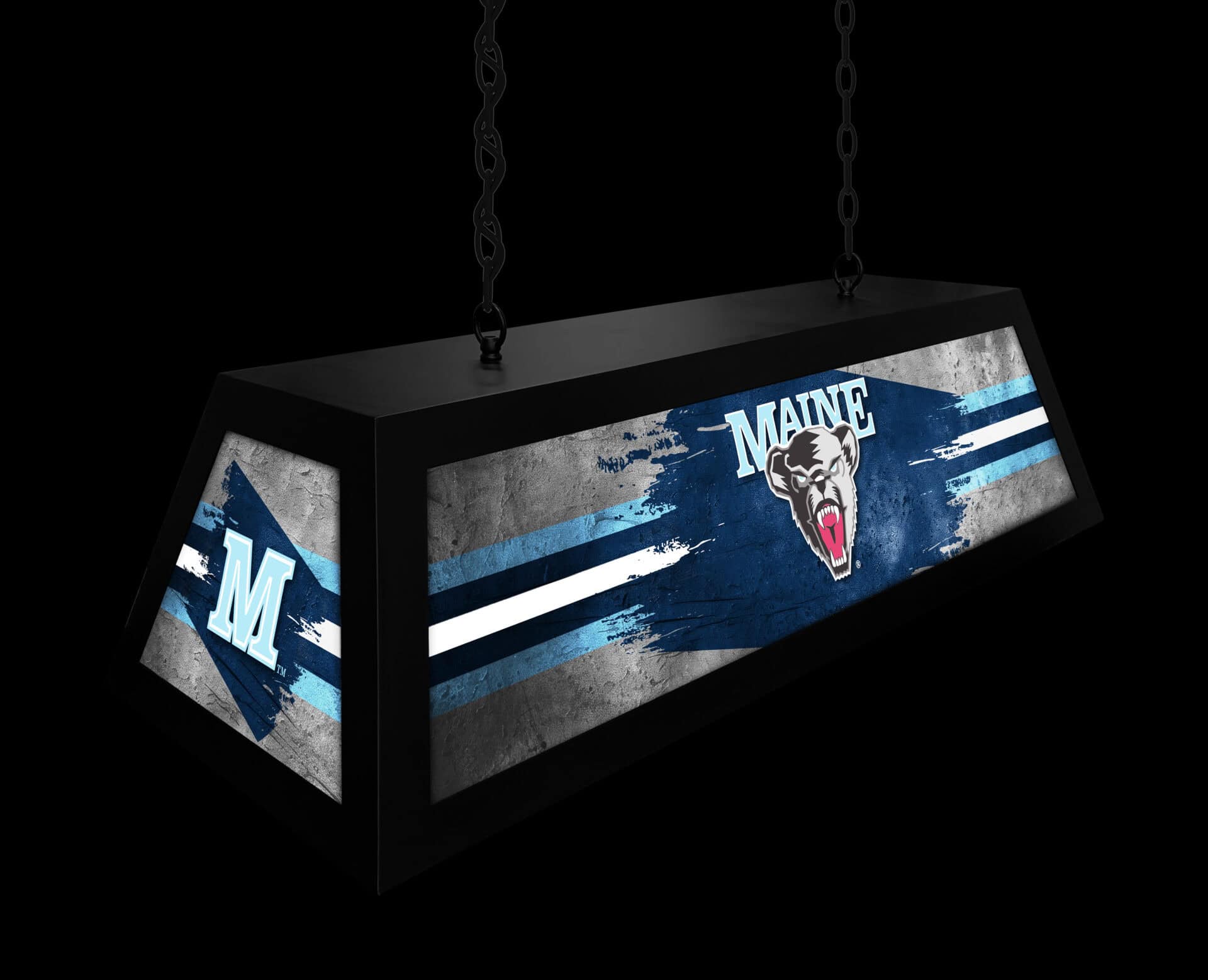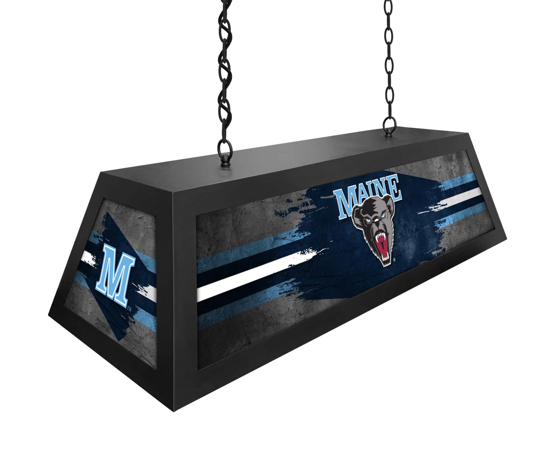 Bring the spirit of the University of Maine to your game room with this Long Box Billiard Light! This high-quality, suspended light fixture is perfect for illuminating your billiard table, game table, or bar area. The bright, backlit design showcases your team pride while providing excellent lighting. Enjoy a combination of style and functionality with this eye-catching piece.