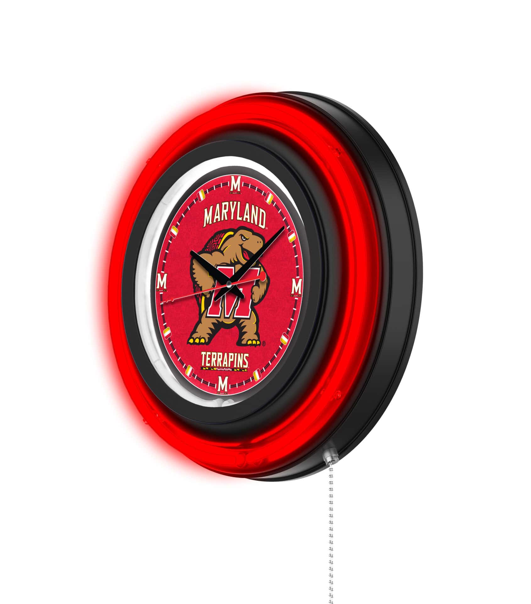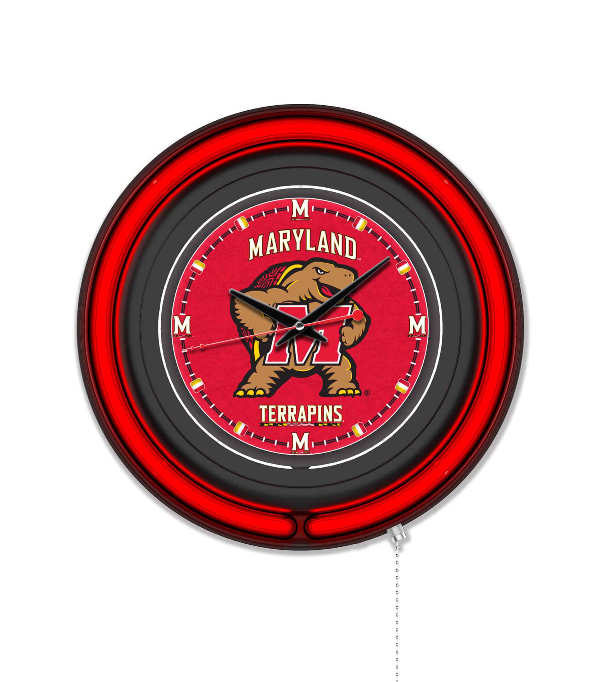 The University of Maryland 15-Inch Neon Logo Clock in Black is the perfect addition to any fan’s space, showcasing your school pride in a vibrant and stylish way. This clock features a sleek black casing and a team color-specific neon outer ring, complemented by a brilliant white inner neon ring that illuminates the custom printed clock face. The neon rings can be easily turned on and off with a pull chain located at the bottom of the clock, providing convenience and ease of use. Powered by a UL Listed transformer that connects to a standard 120V outlet, this clock also ensures accurate timekeeping with its quartz movement, requiring just a single AA battery (not included).