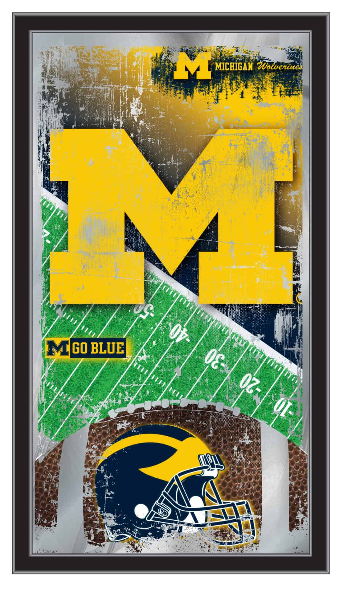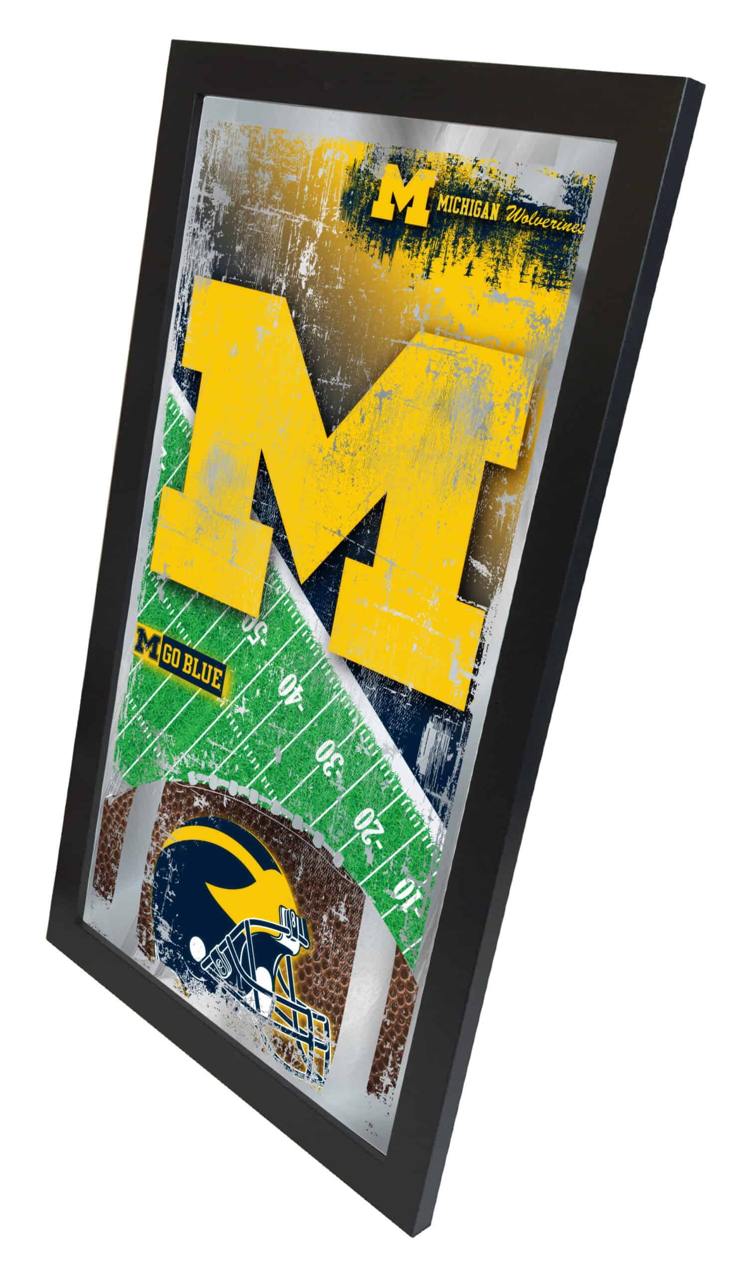 Show your school pride with this officially licensed Football Wall Mirror. Featuring a simple yet elegant design, the vibrant colors burst through the 1/8″ thick glass and are beautifully highlighted by the mirrored accents. The mirror is framed with a sleek black, 1 1/4″ wrapped wood frame, complete with dual saw-tooth hangers for easy hanging. Measuring 15″ in height and 26″ in width, this mirror is perfect for your office, garage, or any room in your home. Whether you’re purchasing it as a gift for a recent graduate, a dedicated sports fan, or for personal use, you can feel confident knowing that you’re choosing a high-quality product.
