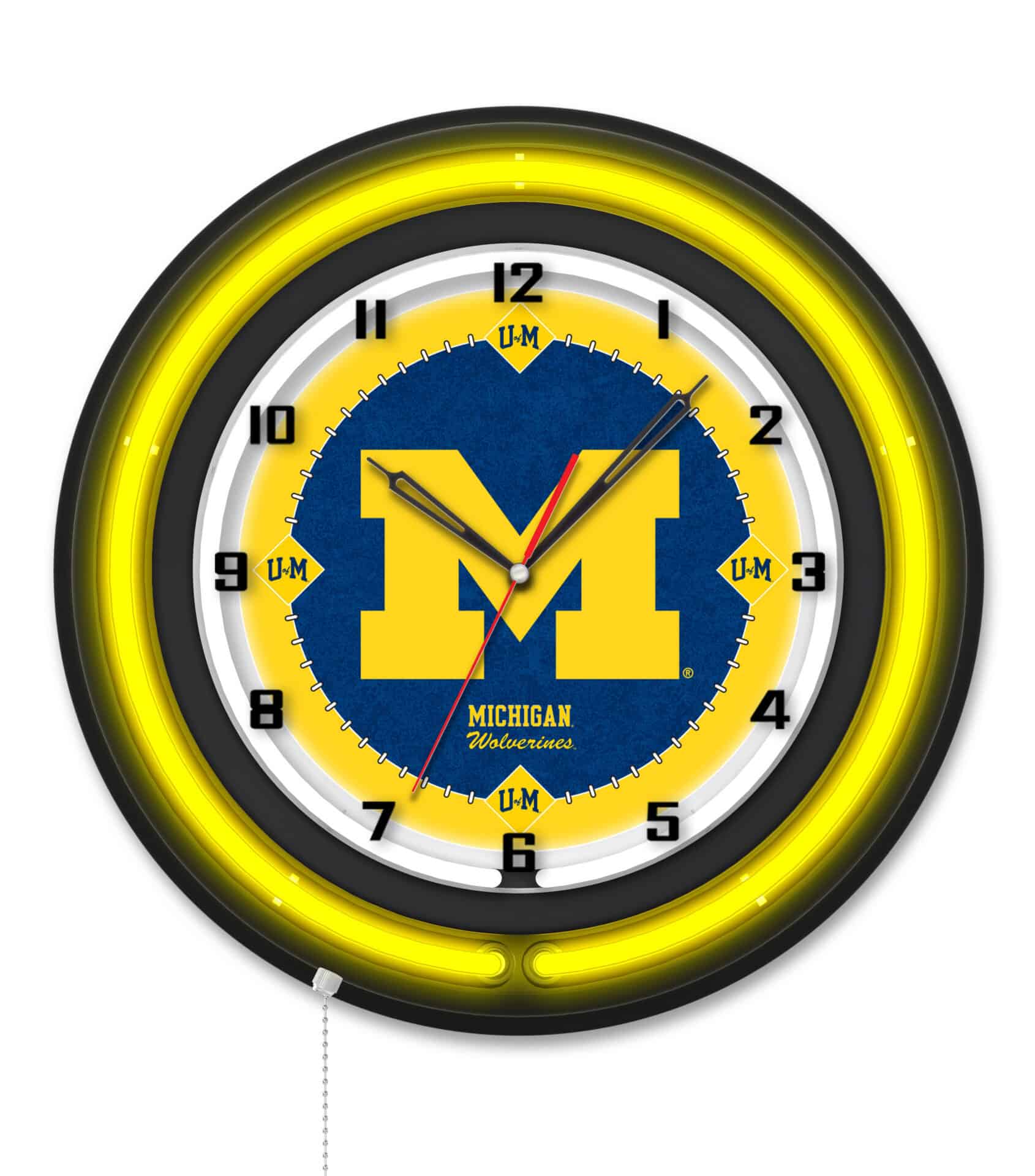The University of Michigan 19-Inch Neon Logo Clock in Black is a vibrant and stylish addition to any man cave or sports-themed room. Featuring a striking black casing, this clock showcases a team-colored neon outer ring that perfectly complements the custom printed clock face, illuminated by a brilliant white inner neon ring. The neon rings are easily activated with a convenient pull chain located at the bottom, and the clock is powered by a UL Listed transformer that connects to a standard 120V outlet. With accurate quartz movement, this clock ensures you always know the time, powered by a single AA battery (not included). Perfect as a gift for sports fans, recent graduates, or for personal use, this clock combines functionality with a stylish design.
