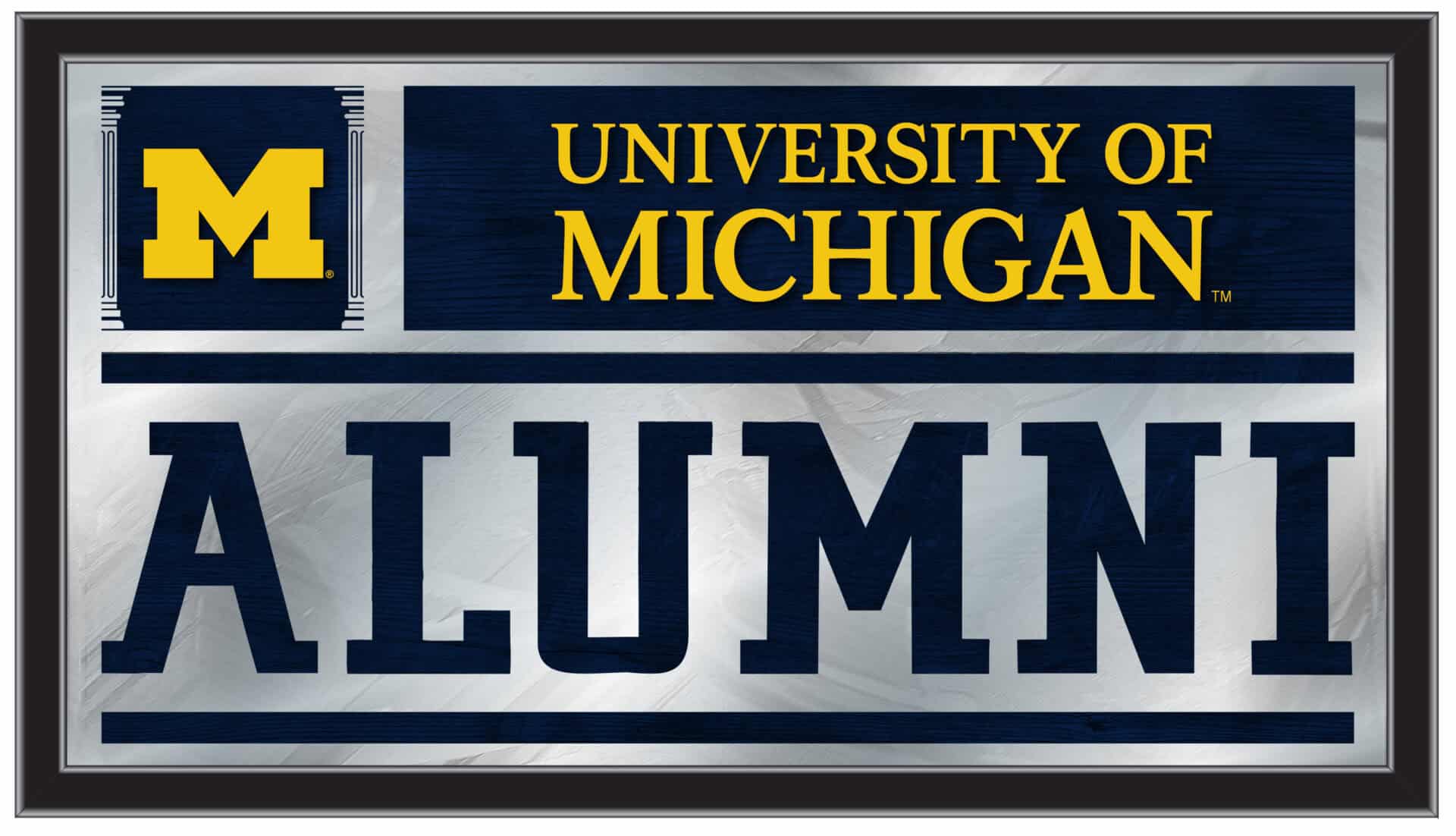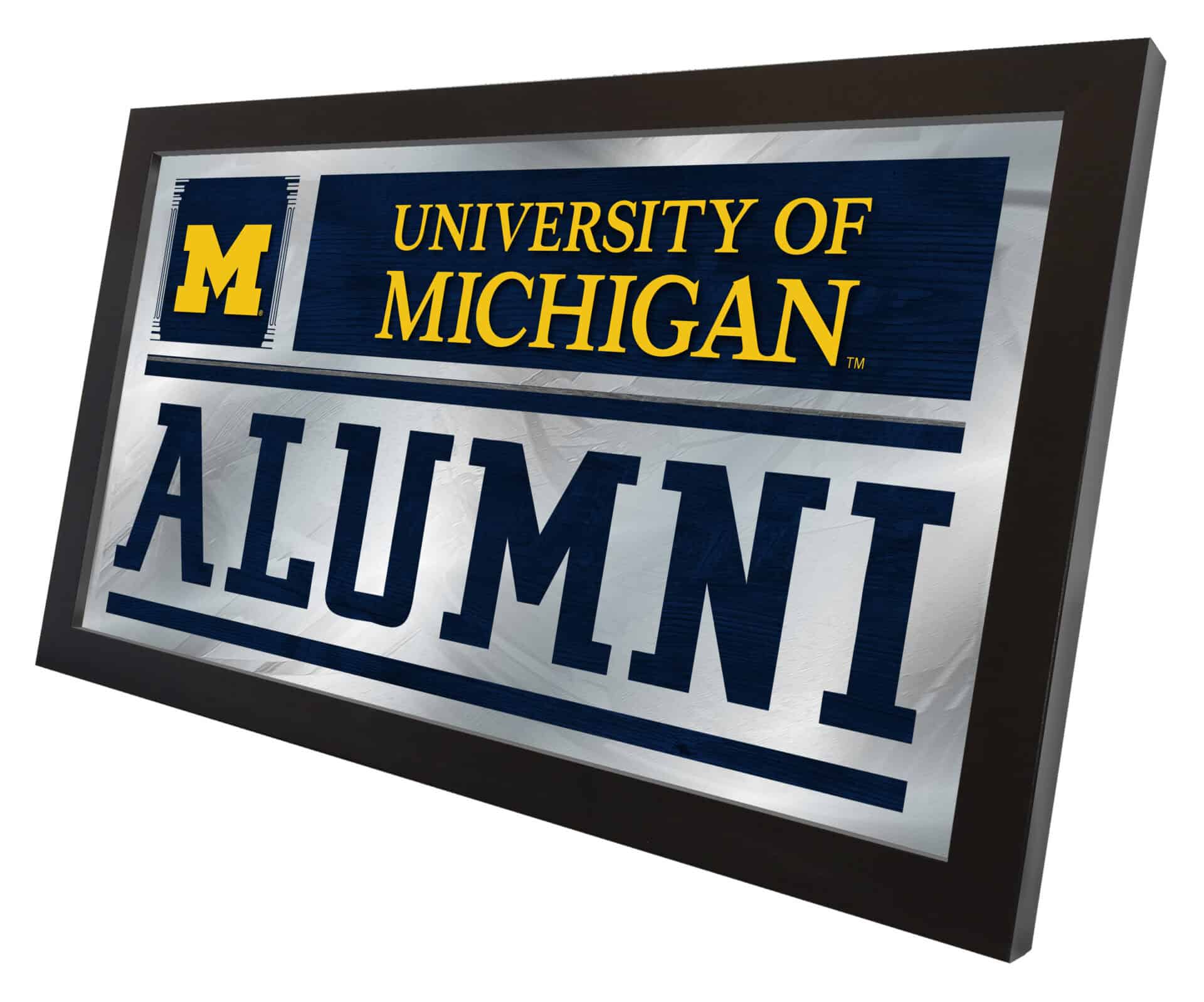 Show your school pride with the University of Michigan 26×15 Alumni Wall Mirror. Featuring a simple yet elegant design, the vibrant school colors are beautifully displayed through the durable 1/8″ thick glass, enhanced by mirrored accents. This stylish mirror is framed with a sleek black, 1 1/4″ wrapped wood frame and includes saw tooth hangers for easy installation. Measuring 26 inches in height and 15 inches in width, it is perfect for your office, garage, or any room in the house. Whether you’re buying for a recent graduate or treating yourself, this mirror makes a great addition to any space.