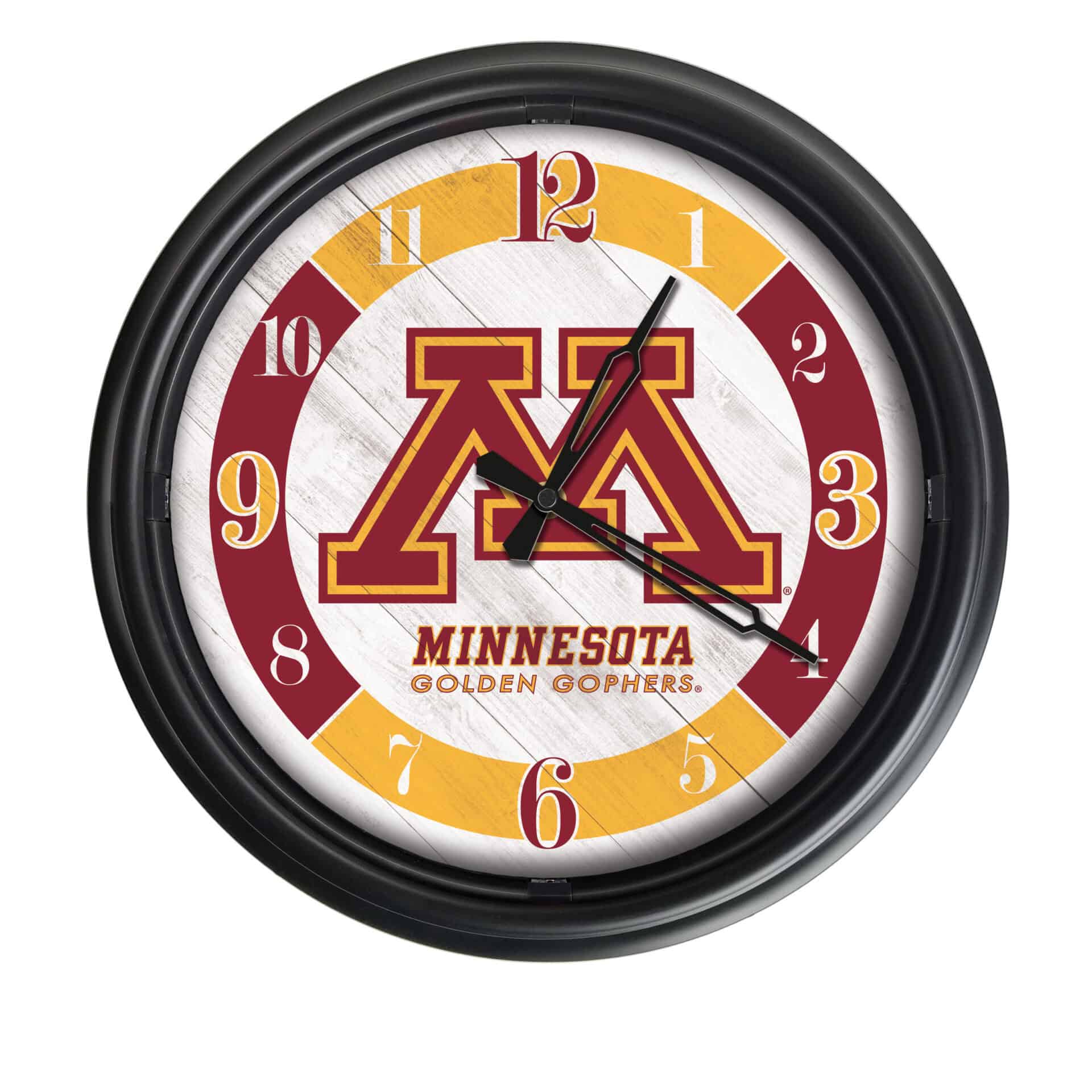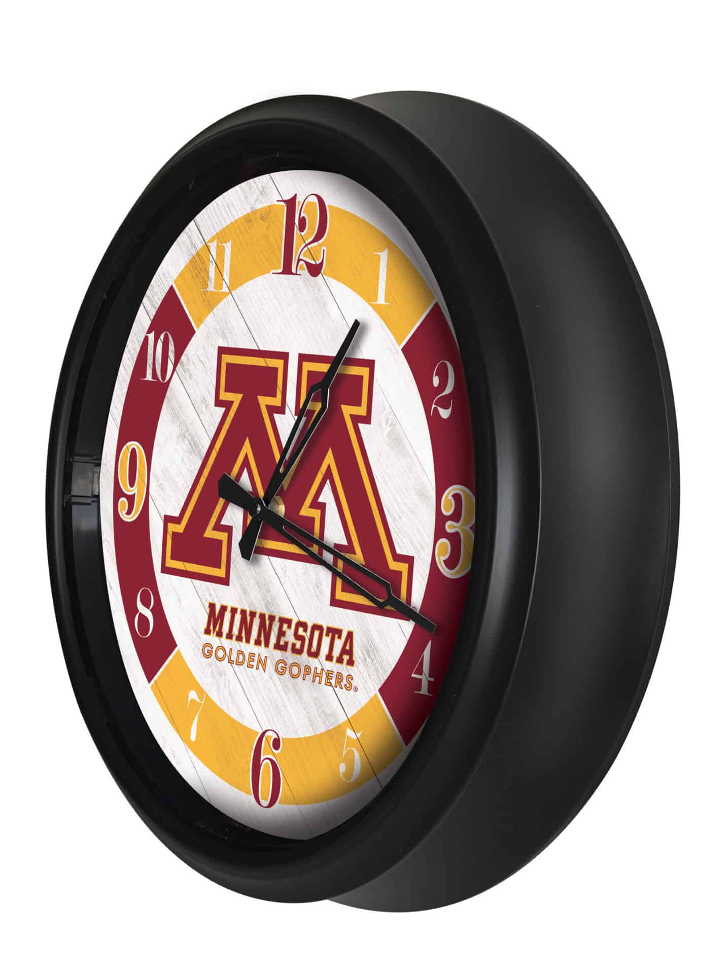 The University of Minnesota 14-Inch Indoor/Outdoor LED Wall Clock in Black is the perfect addition to any man cave or outdoor space, showcasing your school pride while providing accurate timekeeping. With its durable construction and weather-resistant features, this clock is designed to withstand the elements. The vibrant, full-color UV printed artwork makes it a standout piece, while the photo eye-controlled LED lights automatically illuminate the clock face in low light conditions. Enjoy the convenience of a battery-powered design, ensuring you can place it anywhere without the need for an outlet.