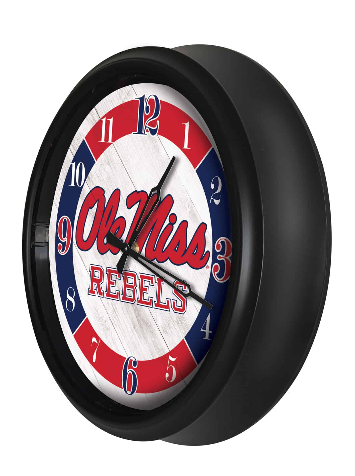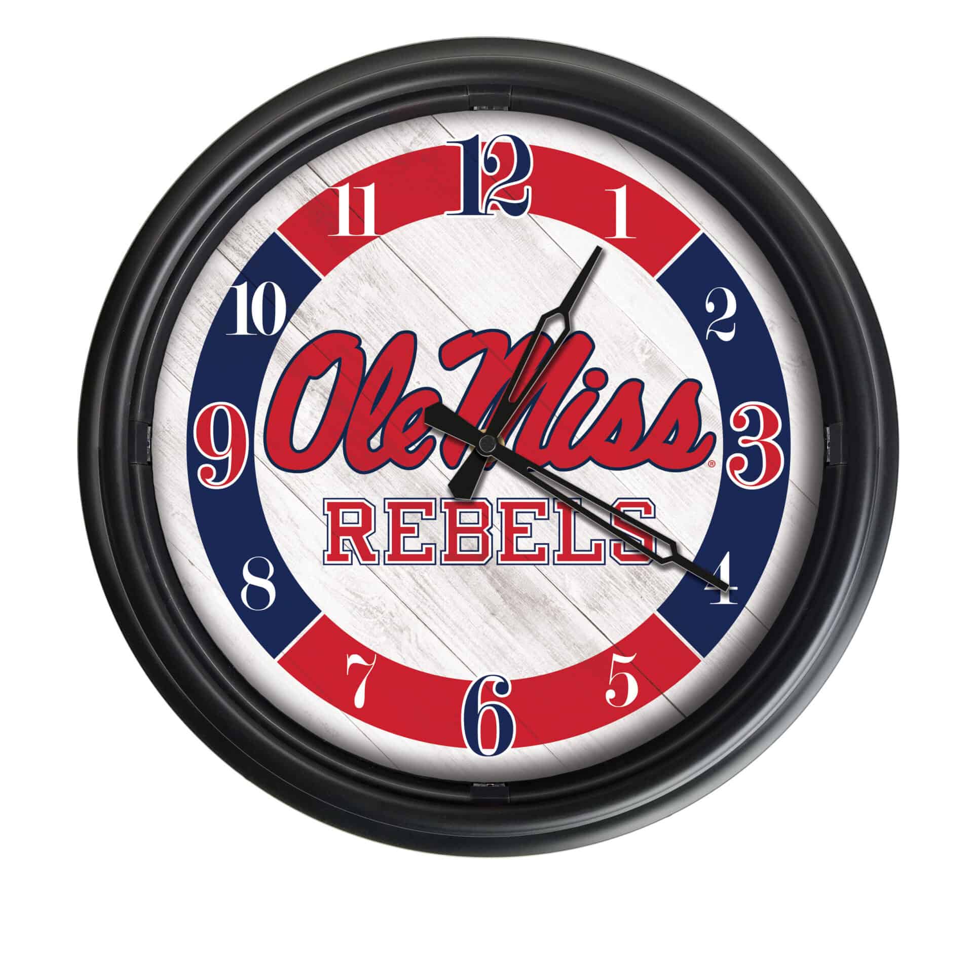 The University of Mississippi 14-Inch Indoor/Outdoor LED Wall Clock in Black is the ideal way to showcase your school spirit while keeping track of time. This clock combines functionality with vibrant, fade-resistant artwork, making it perfect for both indoor and outdoor settings. With a durable UV-resistant casing and a weather-sealed glass face, it is designed to withstand the elements. The clock features four LED lights that automatically illuminate in darkness, ensuring visibility at all times. Powered by batteries, this clock is not only easy to install but also eliminates the need for an electrical outlet.