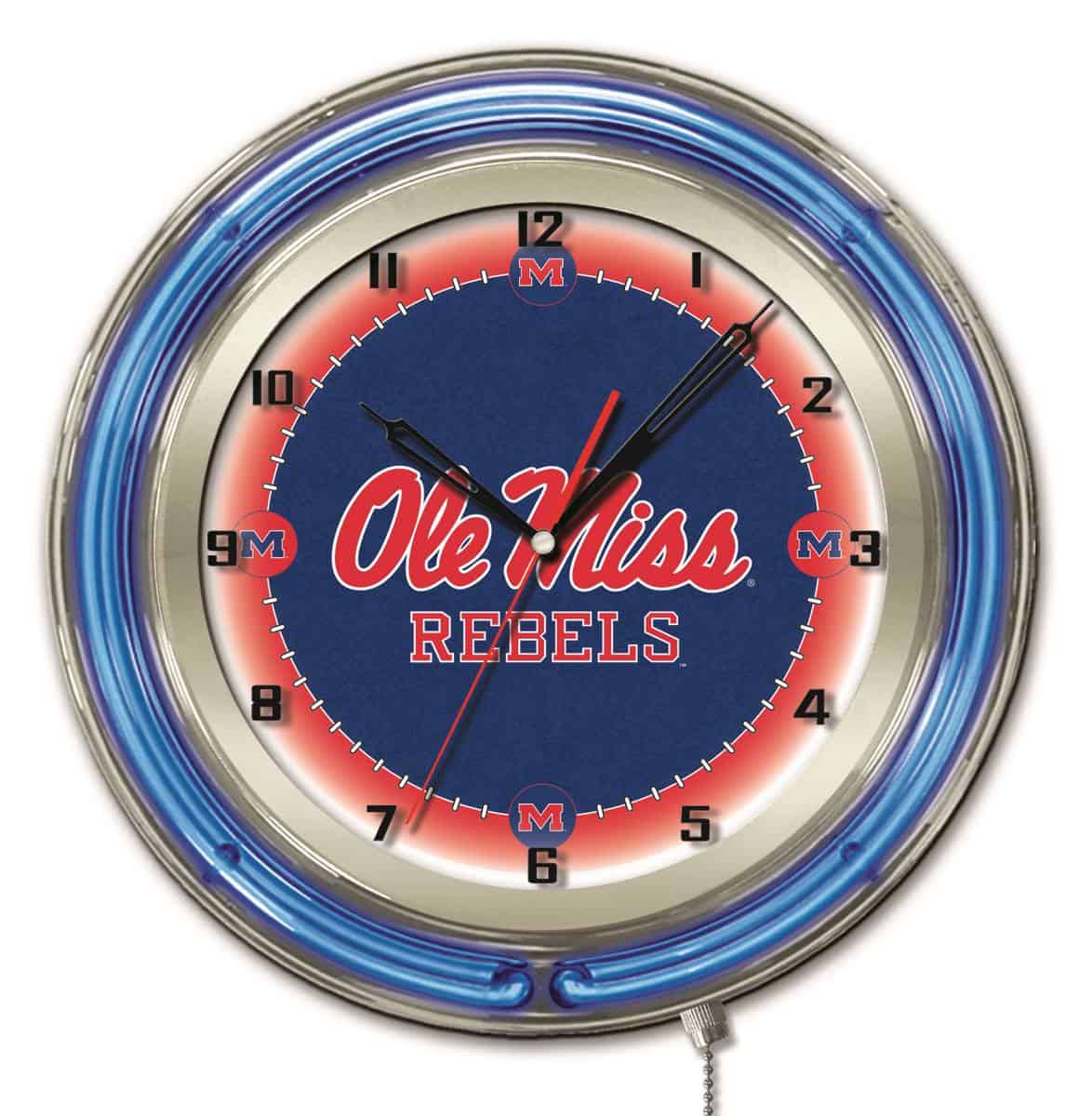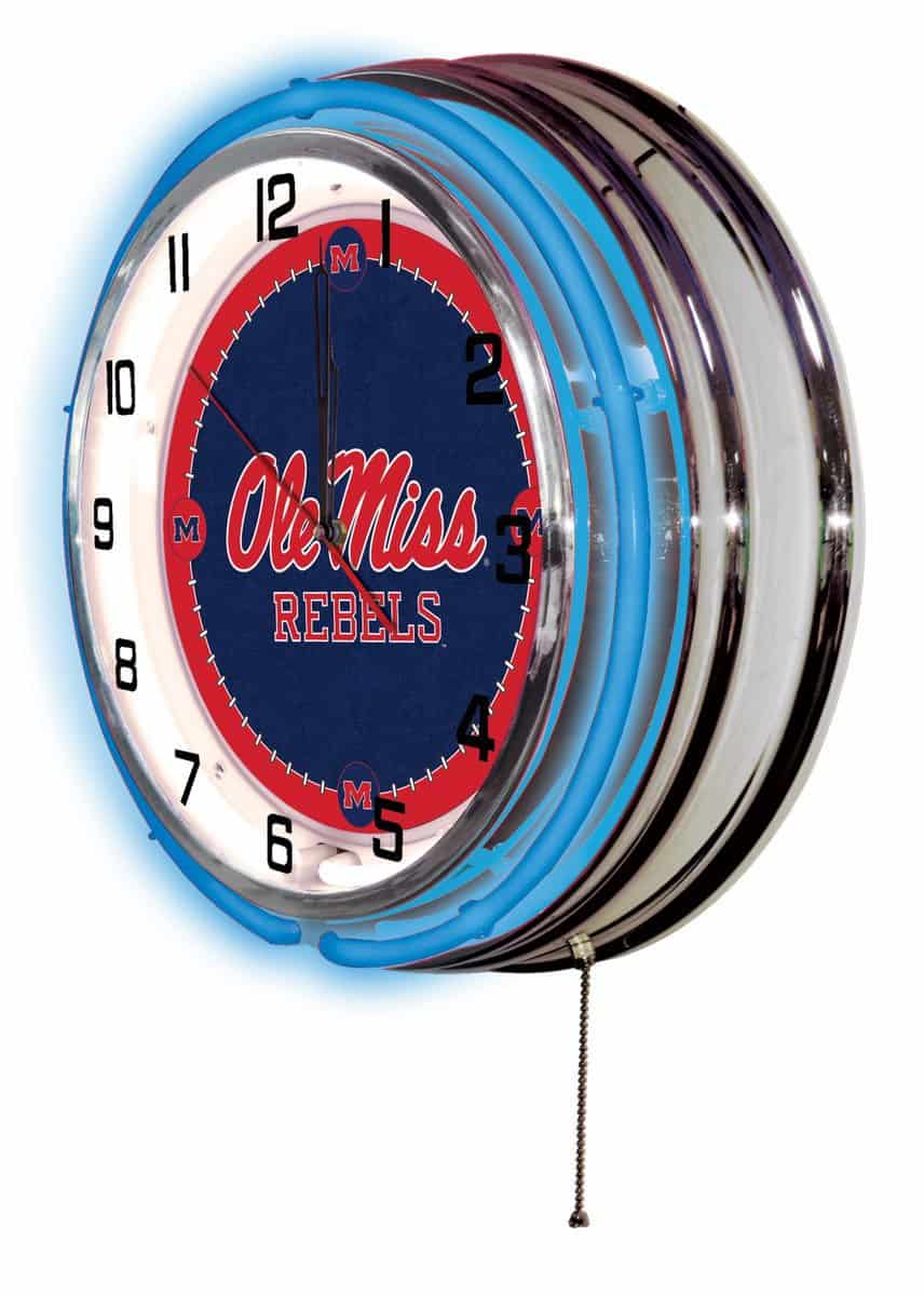 The University of Mississippi 19-Inch Neon Logo Clock in Chrome is the ultimate addition to any fan’s space, showcasing your school pride in a stylish and functional way. This clock features a stunning chrome casing and vibrant neon rings that illuminate the clock face, making it a standout piece in any room. The pull chain allows for easy on and off operation, while its precise quartz movement ensures you always know the time. Perfect as a gift for graduates, sports enthusiasts, or for personal use, this clock combines quality craftsmanship with eye-catching design.
