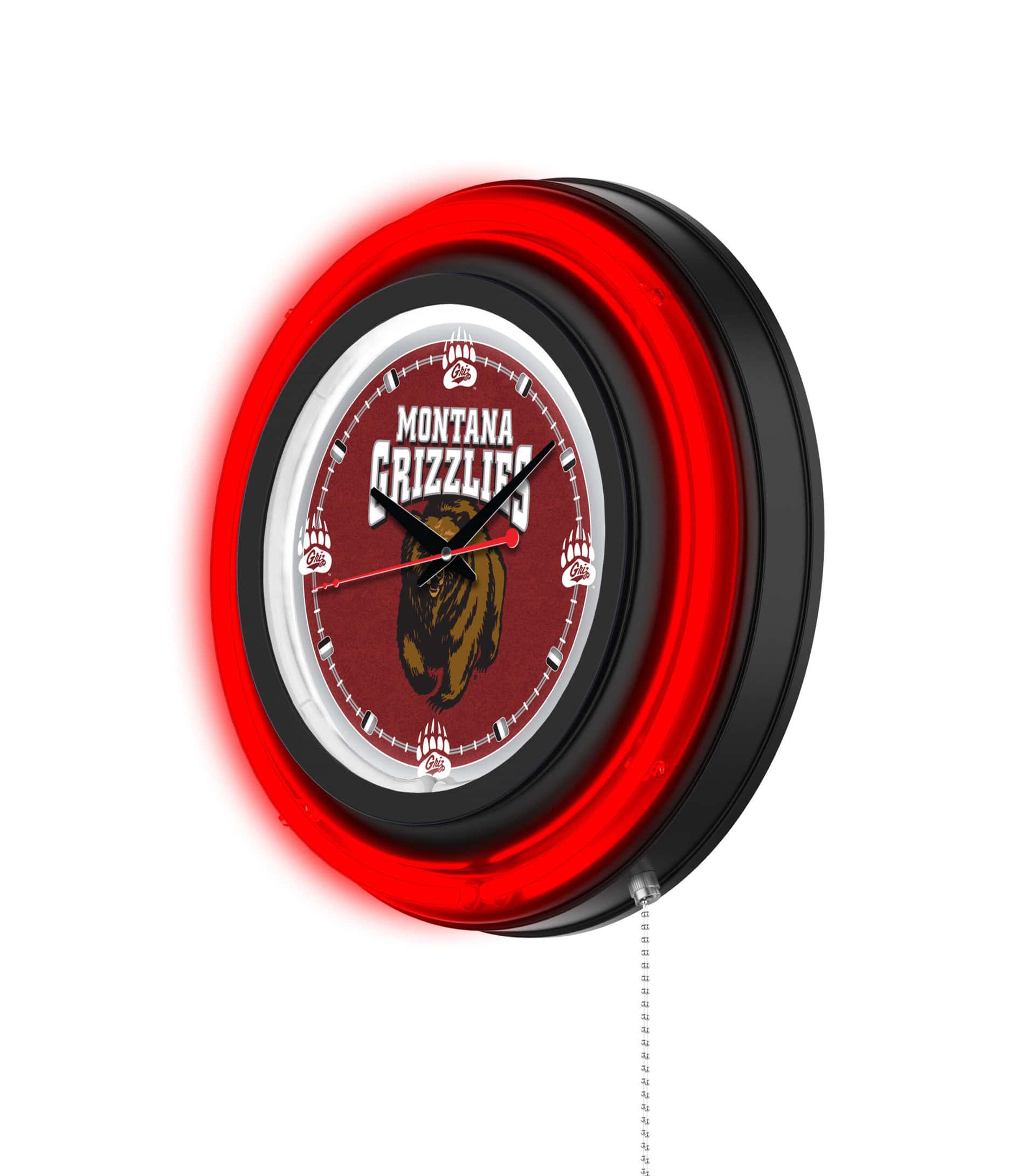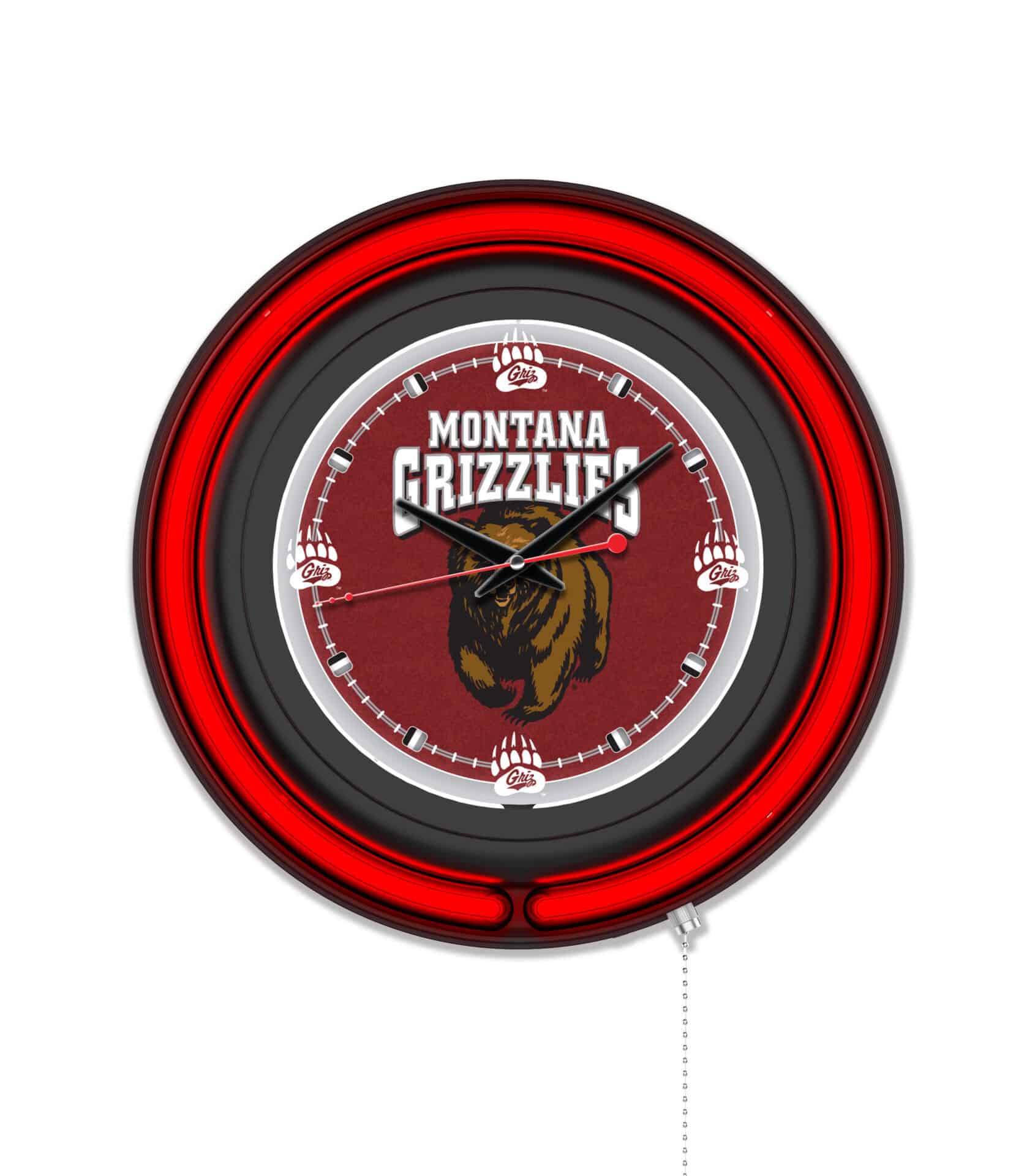 The University of Montana 15-Inch Neon Logo Clock in Black is the perfect addition to any fan’s space, showcasing your school pride in a vibrant and stylish way. This clock features a striking black casing with a neon outer ring in team colors, illuminating the custom printed clock face with a brilliant white inner neon ring. The neon rings are easily controlled with a convenient pull chain, and the clock is powered by a standard 120V outlet, ensuring you always know the time while enjoying a colorful display. With accurate quartz movement and a single AA battery (not included), this clock is both functional and eye-catching. Ideal for gifts or personal use, this clock is a standout piece for any man cave or sports room.